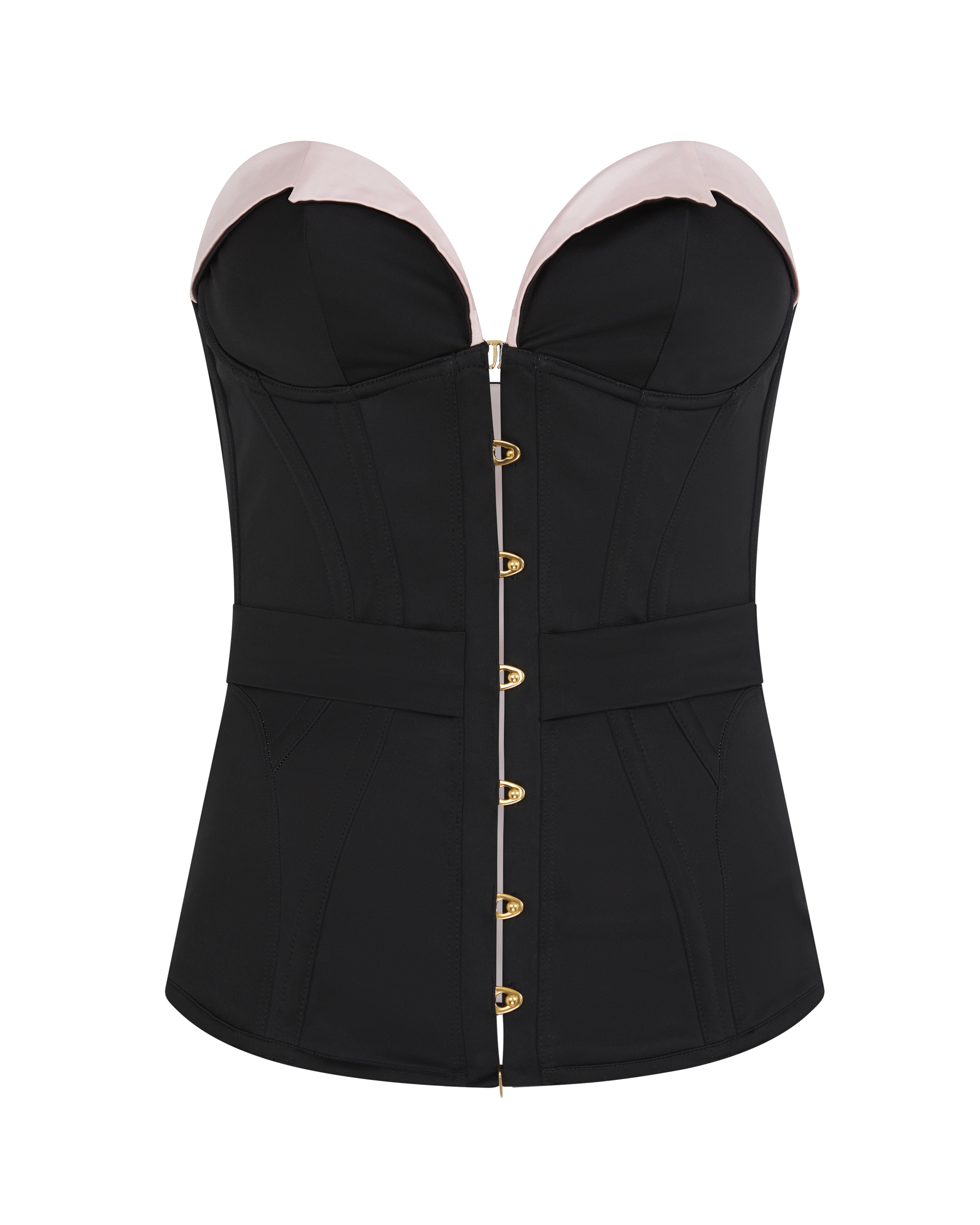 Черный корсет Honie: атласная строгость и розовые лацканы, как дерзкий акцент. Стальные косточки лепят силуэт, а шелк внутри дарит комфорт. Корсетная планка спереди и шнуровка сзади с шелковым клапаном. Сочетайте с другими предметами коллекции Honie для игривого образа.