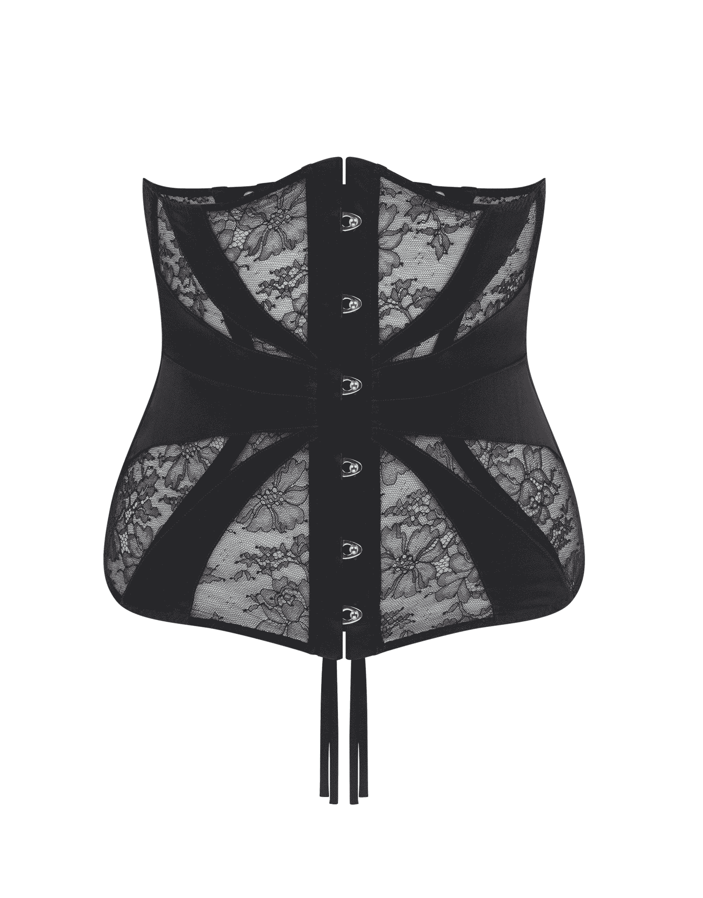 Черный корсетный пояс Camilla выполнен из французского кружева шантильи и ливерс с атласными вставками на подкладке из тюля. Спереди модель застегивается на шесть крючков, сзади - классическая шнуровка. Съемные пажи для чулок входят в комплект. Прекрасное дополнение сексуального образа.