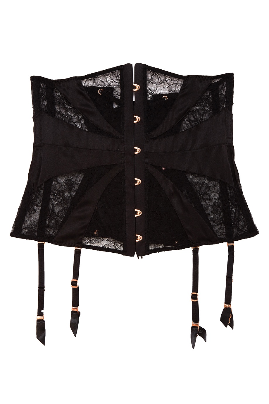 Camilla - новая капсульная коллекция, состоящая из трусиков, корсетного пояса и трусиков стрингов классического черного цвета. Этот обтягивающий сексуальный корсетный пояс создан из кружева шантильи и кружева ливерс, и дополнен сатиновыми панелями на подкладке из тюля с косточками. Отстегивающиеся пажи, панель из шелка и застежка на крючки завершают образ.
