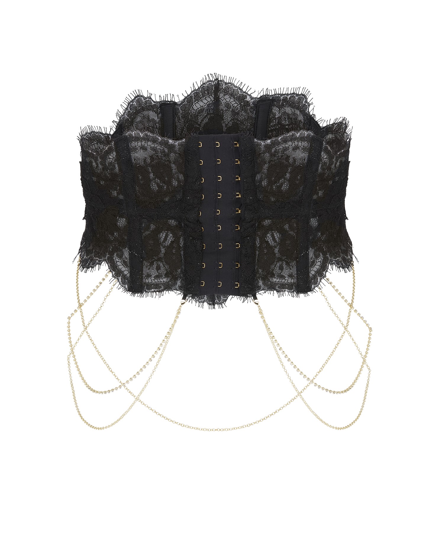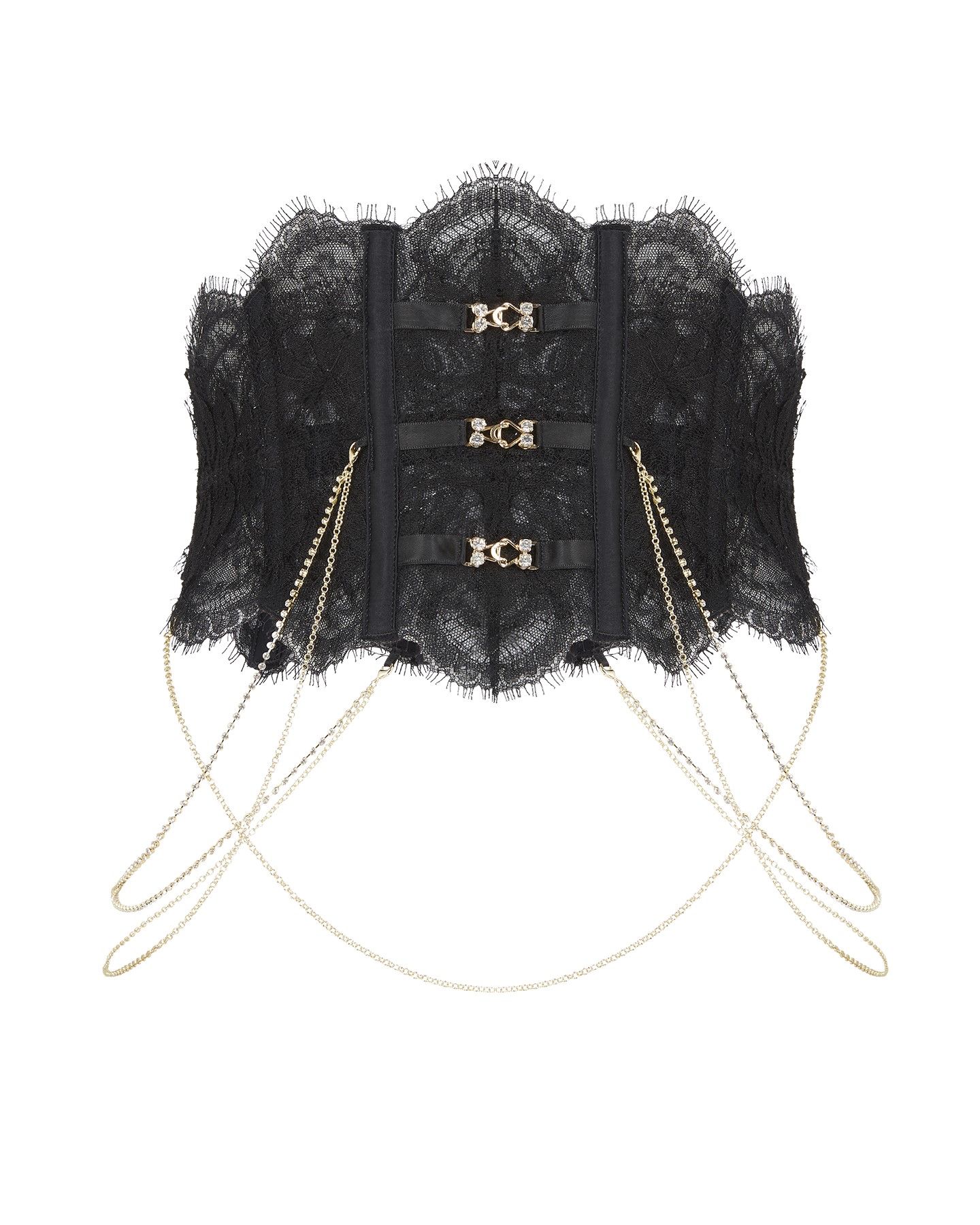Черный корсетный пояс Tasmina создаёт женственный силуэт с помощью кружева Leavers, косточек и люрекса. Съемные цепочки и кристаллы добавляют блеска, а остальные изделия из коллекции завершат восхитительный образ.