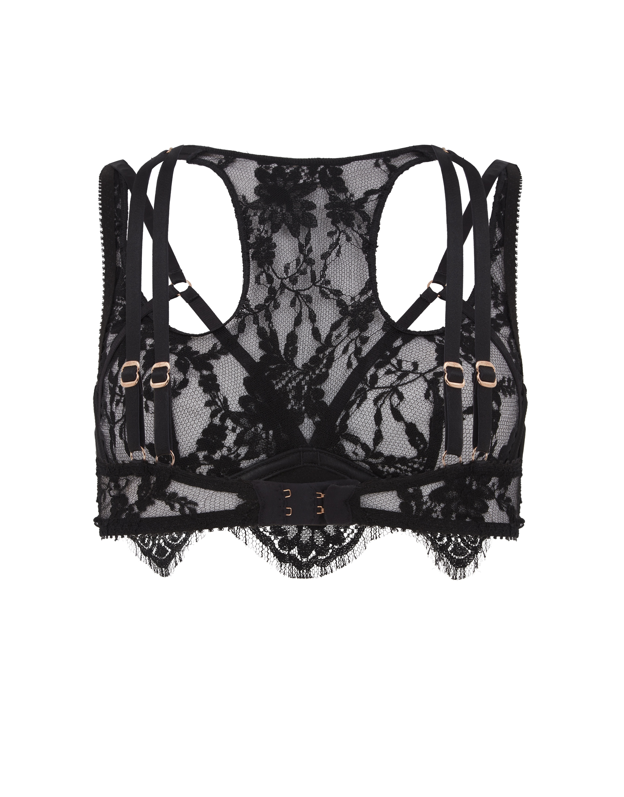Роскошная модель Talia представлена в черном кружеве, выполненном по французской технологии ливерс. Ажурное полотно гармонирует с тонкими эластичными лентами, очерчивающими контур чашек в стиле стрэп. Инкрустация стразами Swarovski придает точечное сияние при каждом движении. Деликатная поддержка на косточках дополнена фирменной подвеской посередине.
