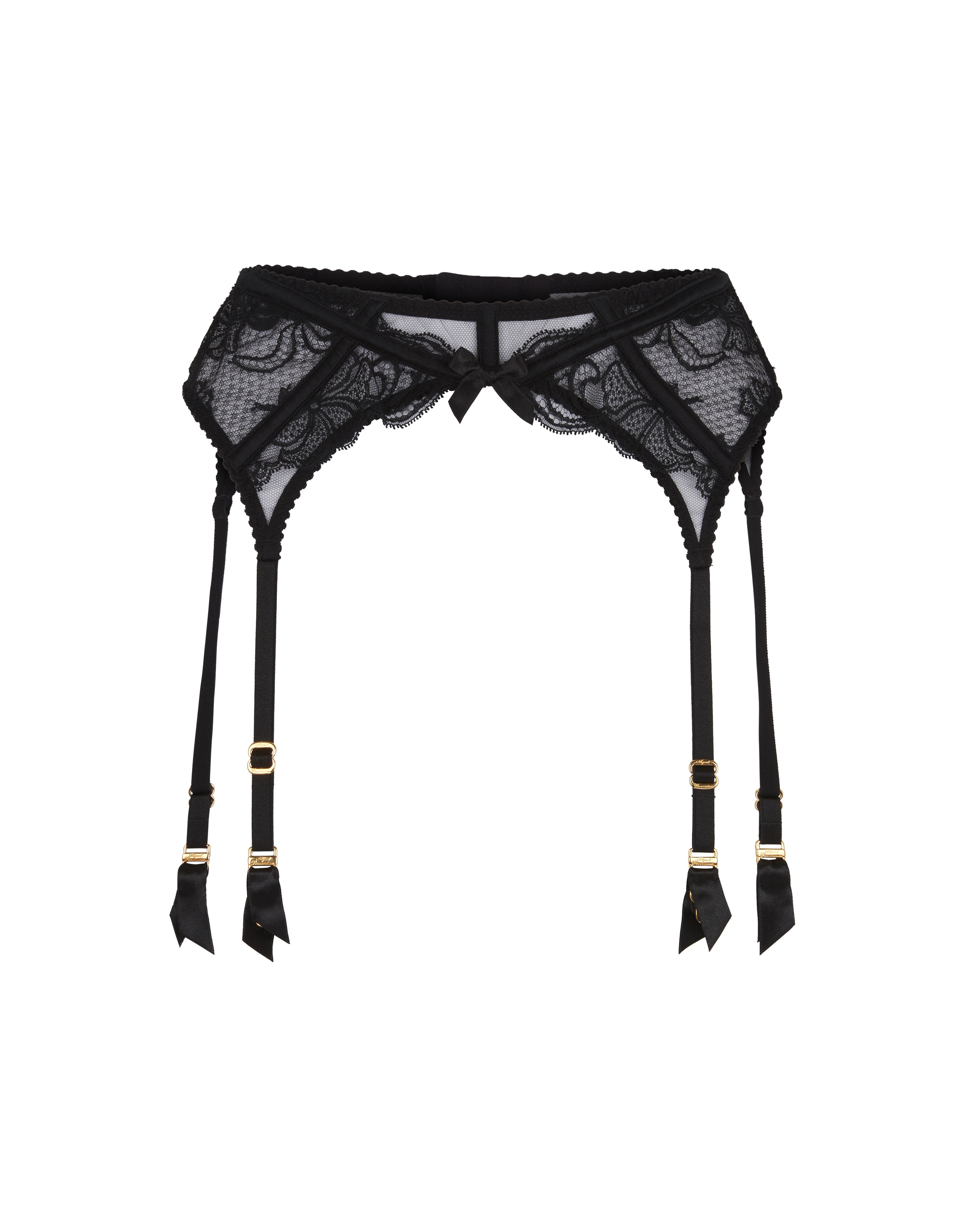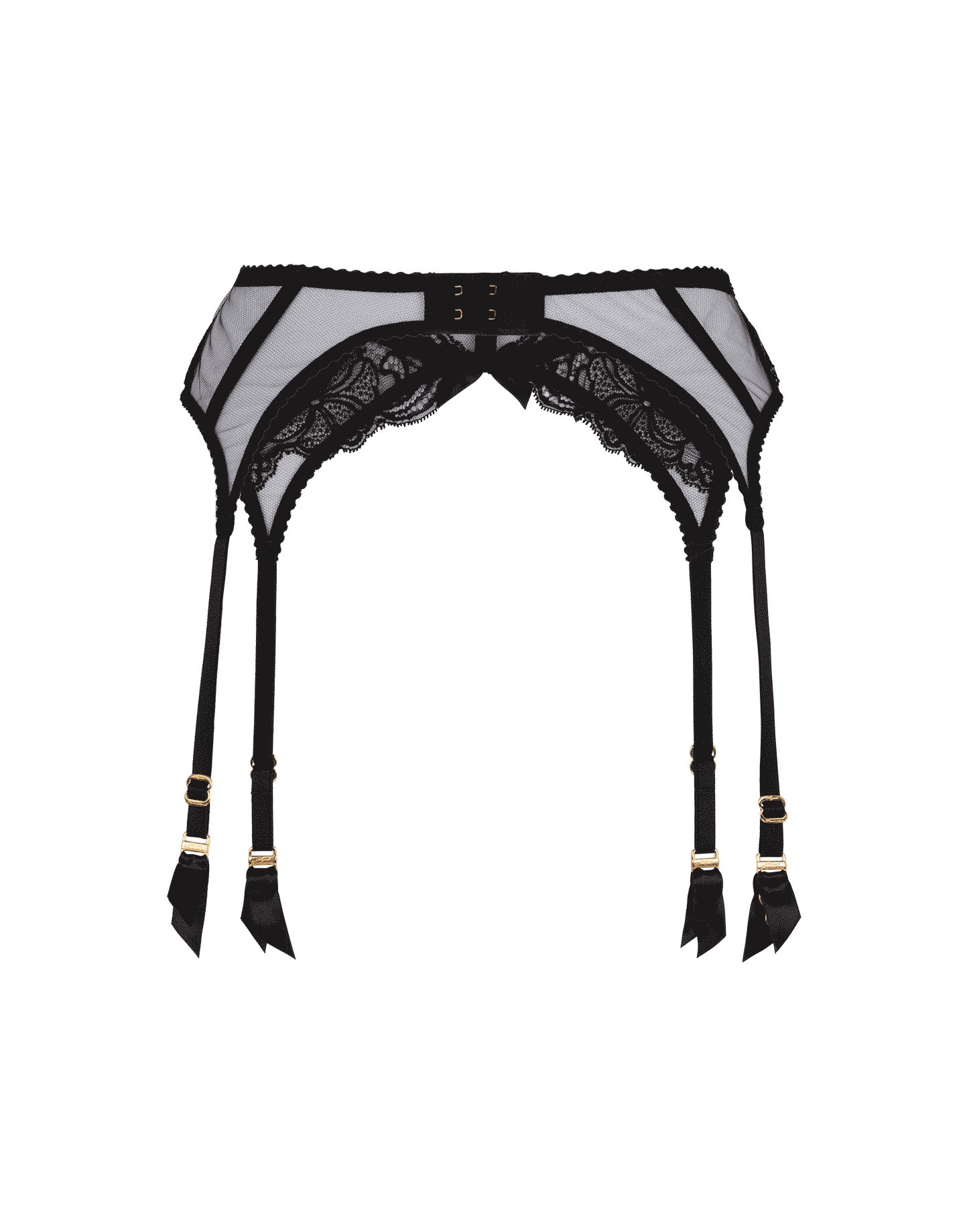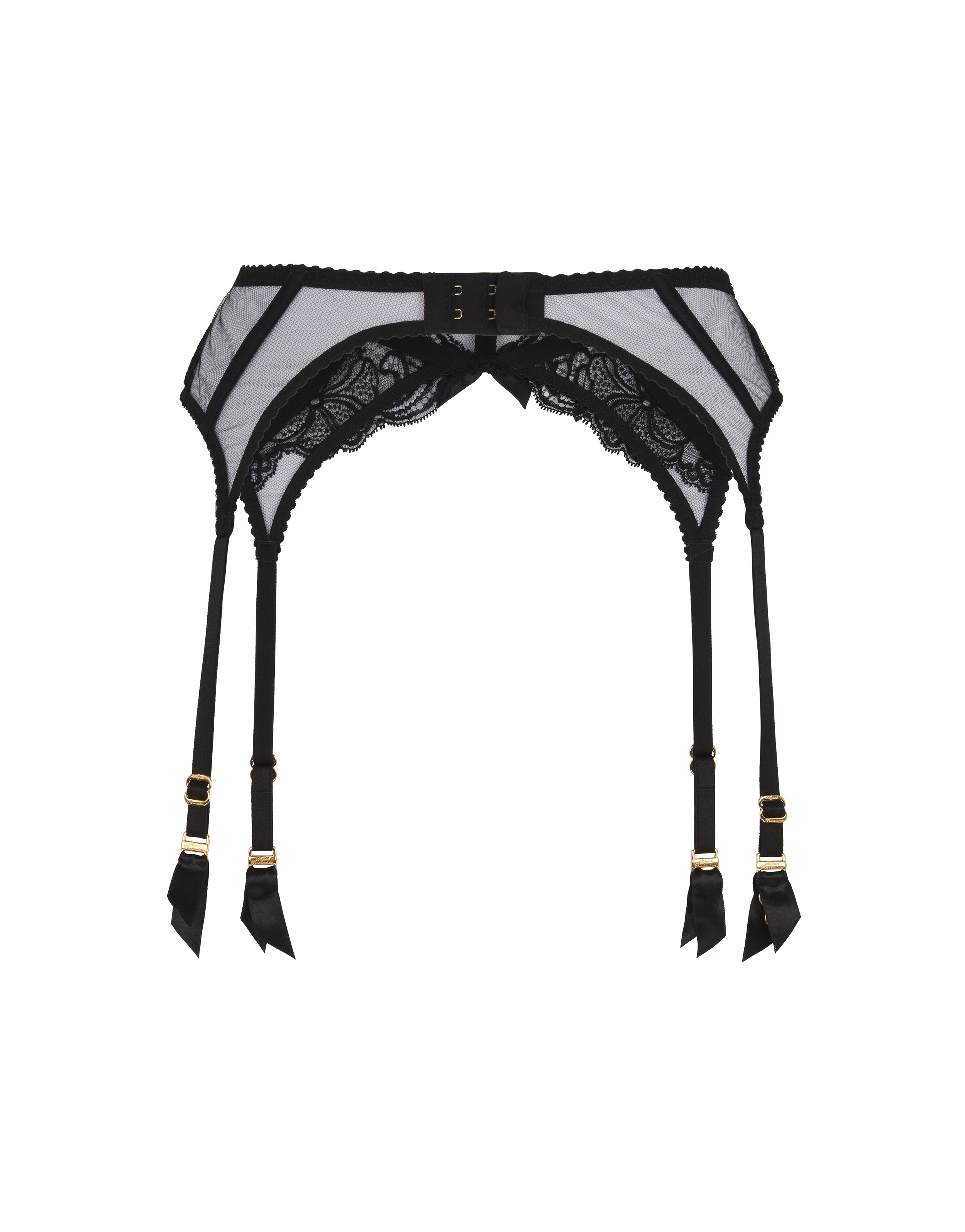 Черный пояс для чулок из коллекции Rozlyn станет идеальным завершением романтического образа. Изысканная модель выполнена из тонкого тюля и украшена французским кружевом. Регулируемые ремешки с золотистой фурнитурой.