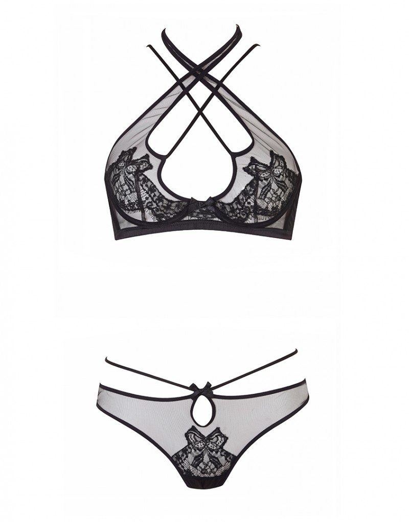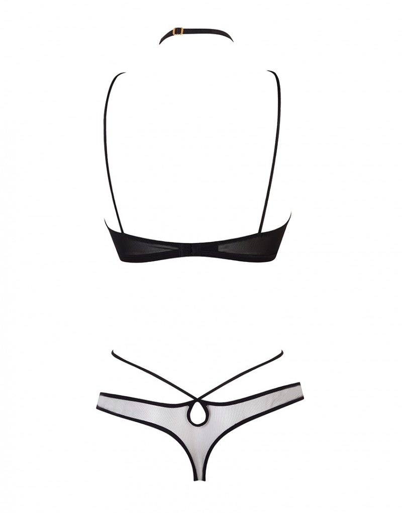 Рискованная и игривая Eliana объединяет в себе бондажный стиль и роскошную выделку. Черный бюстгальтер дополнен высоким воротником, сформированным перекрещивающимися на ключицах бретелями из тюля. Тонкие черные ленты повторяют графику этих линий, добавляя образу драматичности. Чашки из тюля украшены кружевом ручной работы в виде бантов и черной оторочкой по краю.