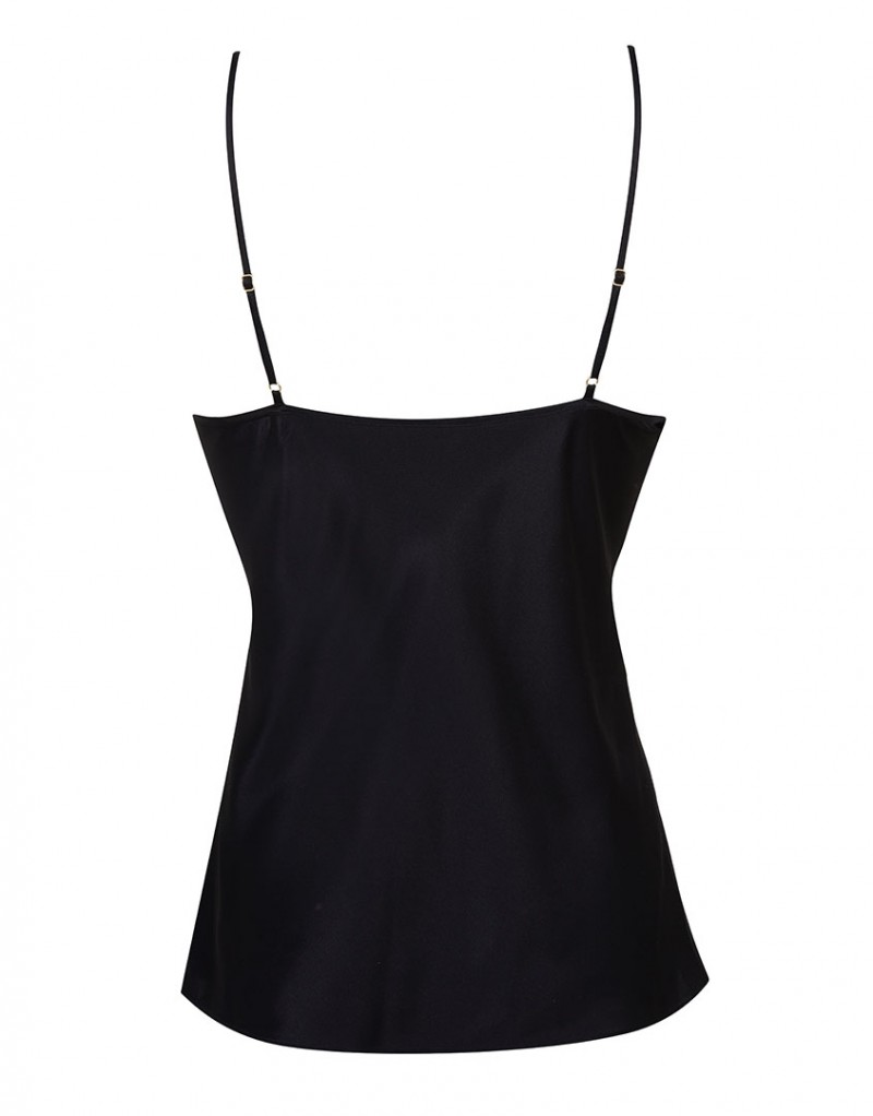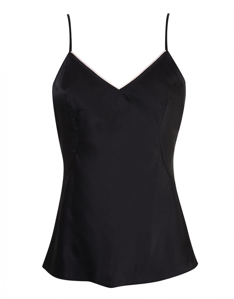 Дополните свой базовый будуарный гардероб нашим классическим топом соблазнительного черного цвета. Изготовленный из шелка со строчкой фирменного розового цвета, этот гладкий топ вместе с шортами и маской для сна станет роскошным комплектом для отдыха. Сочетайте с шортами и маской.