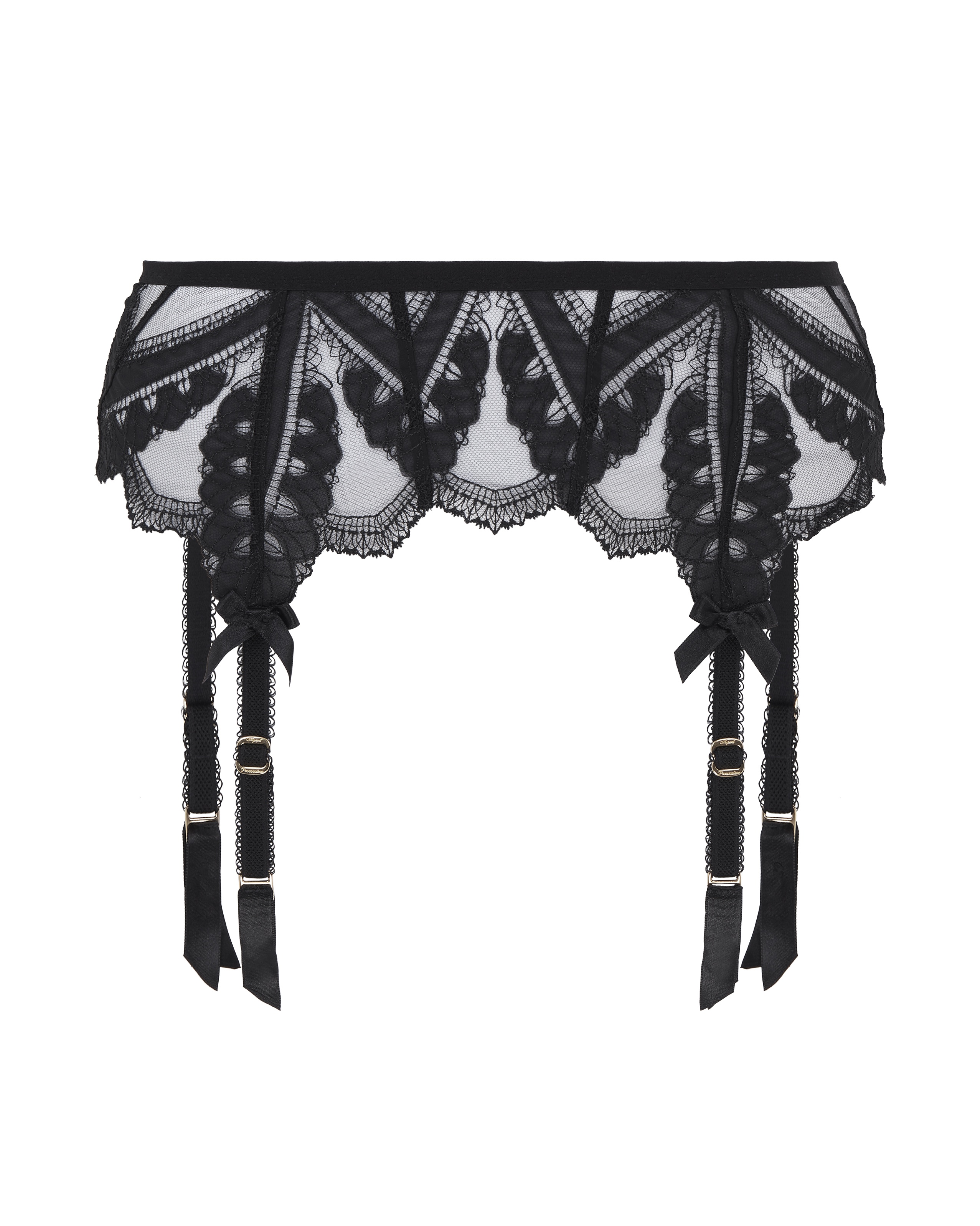 Пояс для чулок Alysia из черного тюля украшен деталями из швейцарской вышивки с лазерной резкой. Элементы металлической фурнитуры покрыты золотом. Носите его с другими предметами из коллекции Alysia для создания завораживающего образа.