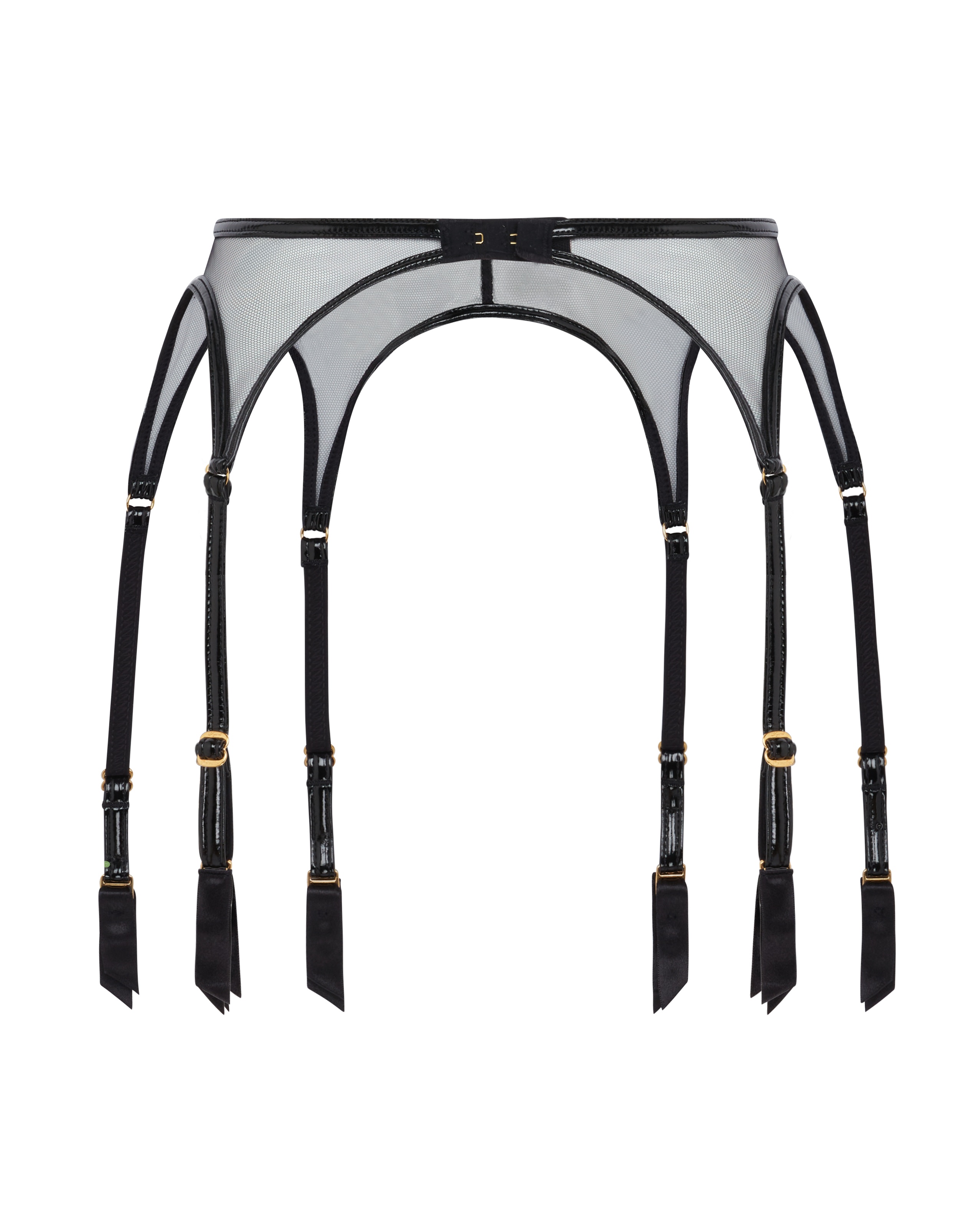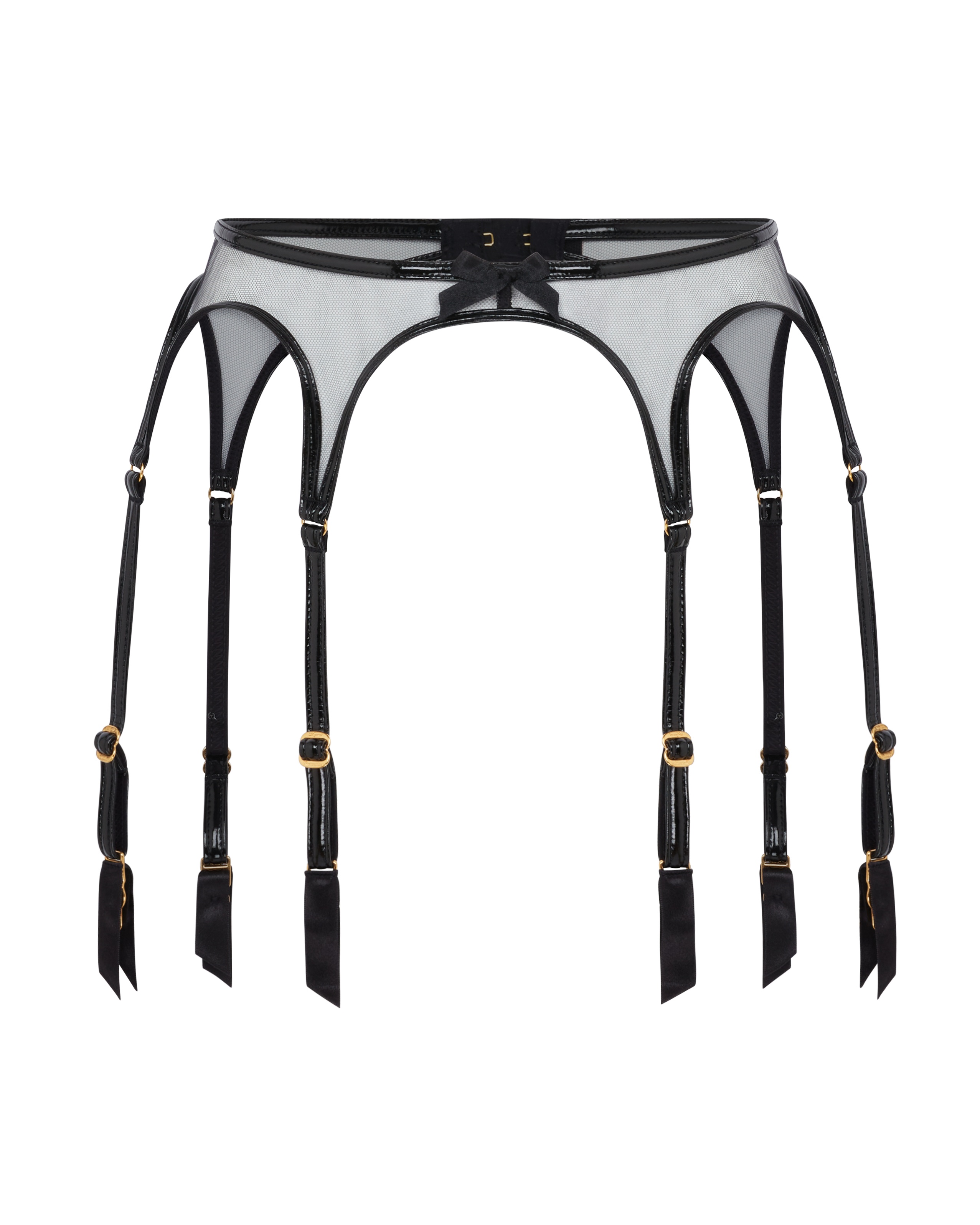 Черный пояс для чулок Ariella: прозрачный тюль, шесть регулируемых подвязок с позолотой и эластичная ПВХ-окантовка. Идеально сочетается с любыми черными комплектами Agent Provocateur.