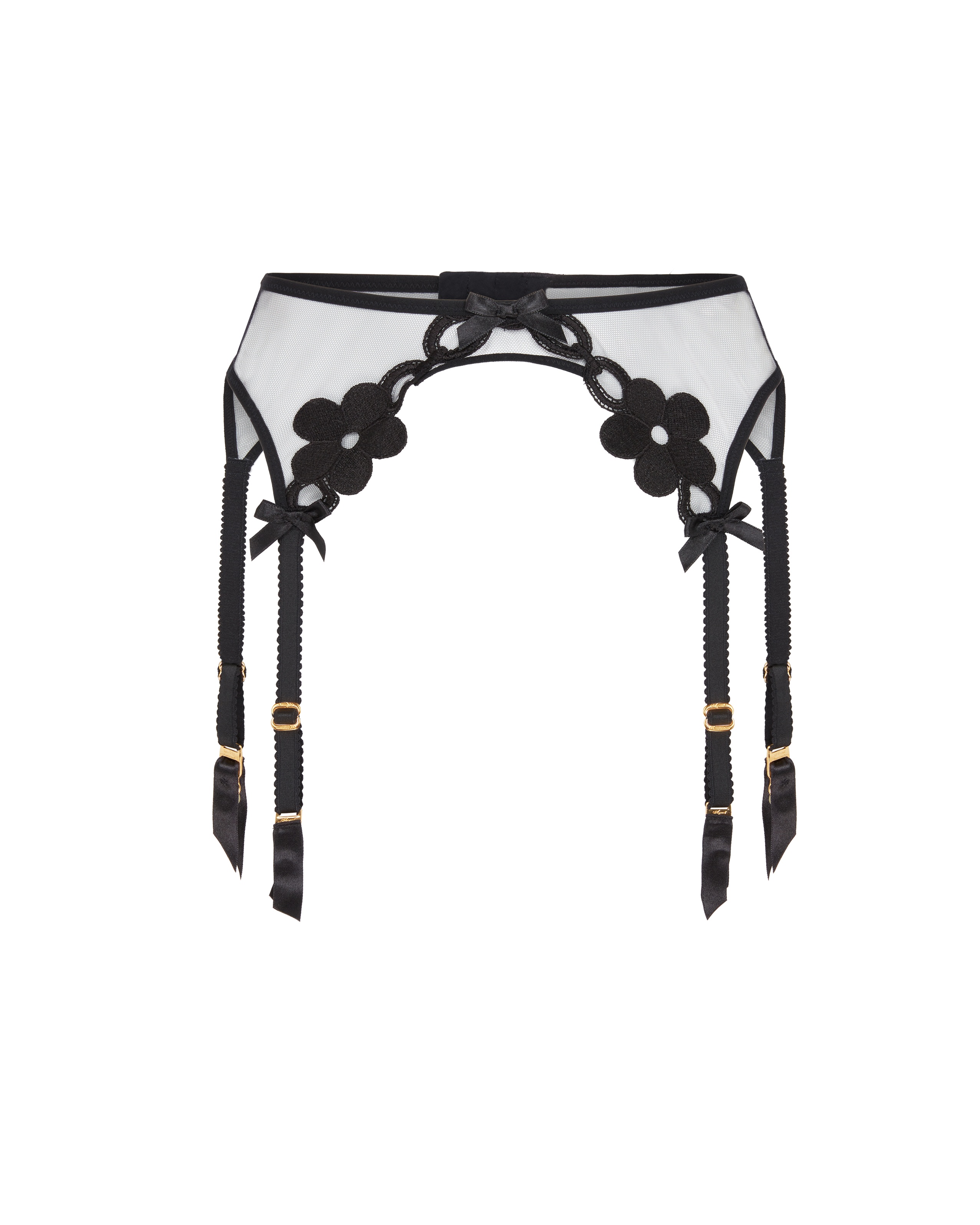 Пояс для чулок Daysi черного цвета с ручной вышивкой. Ажурная резинка на подвязках, вставки из прозрачного тюля. Позолоченная фурнитура. Сочетайте с другими предметами коллекции Daysi для романтичного ансамбля.