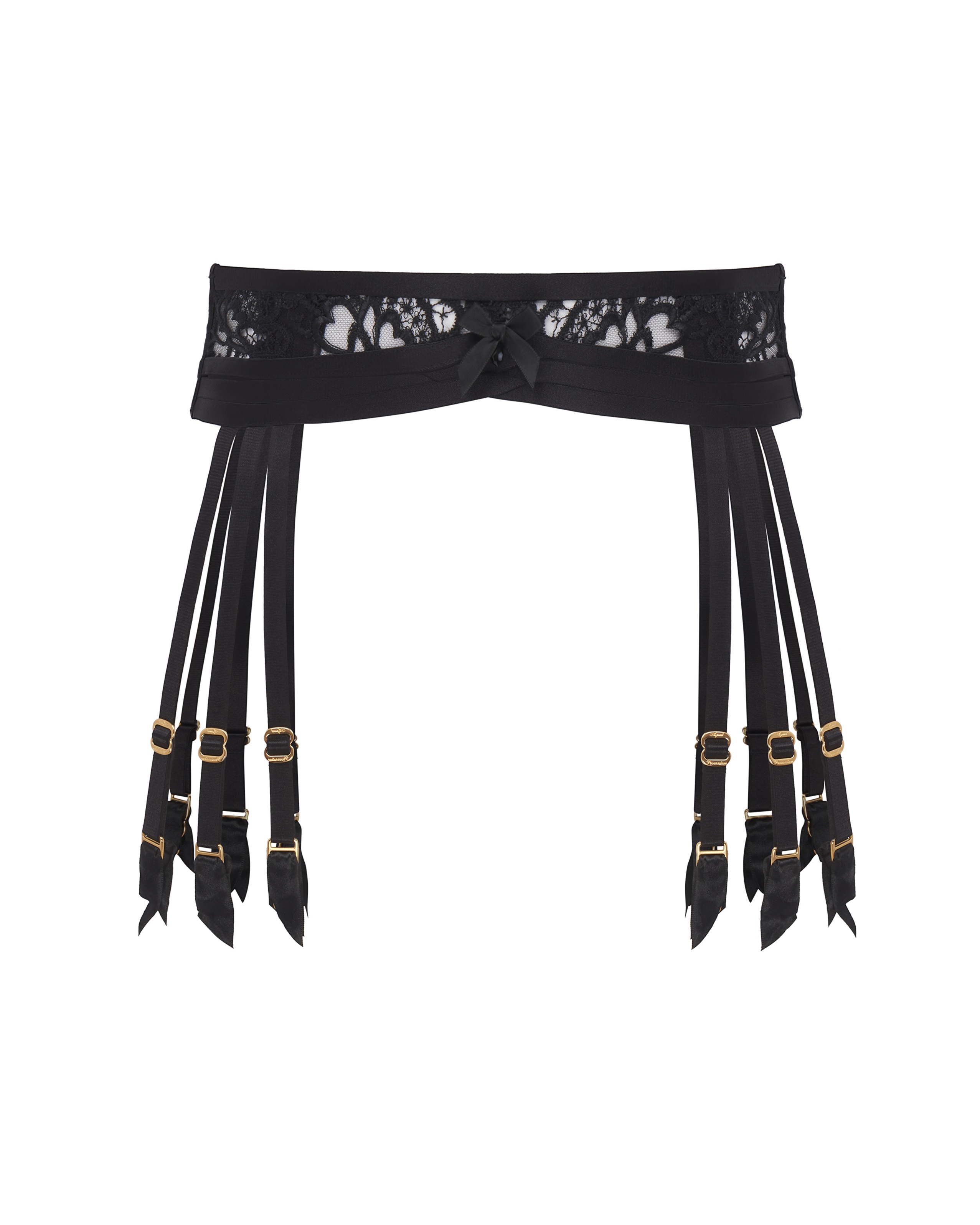 Черный пояс Dioni: швейцарская лазерная вышивка и одинокий кристалл Preciosa® по центру как точка притяжения. Шесть позолоченных подвязок довершают образ, обретающий силу в полной коллекции Dioni.