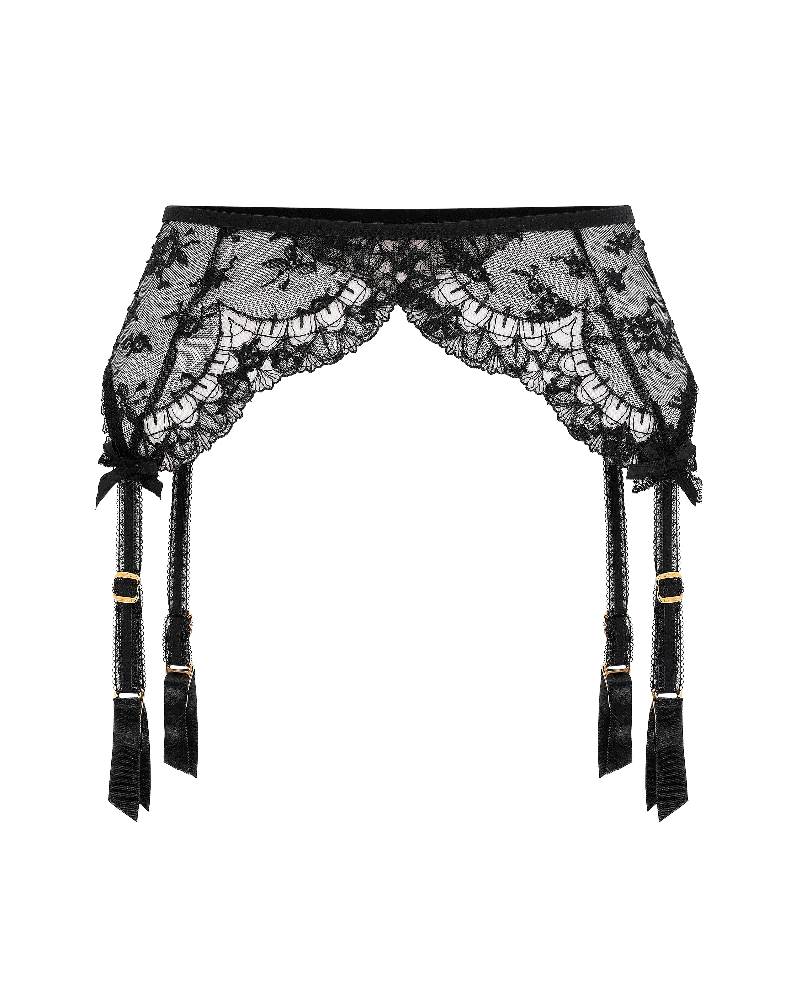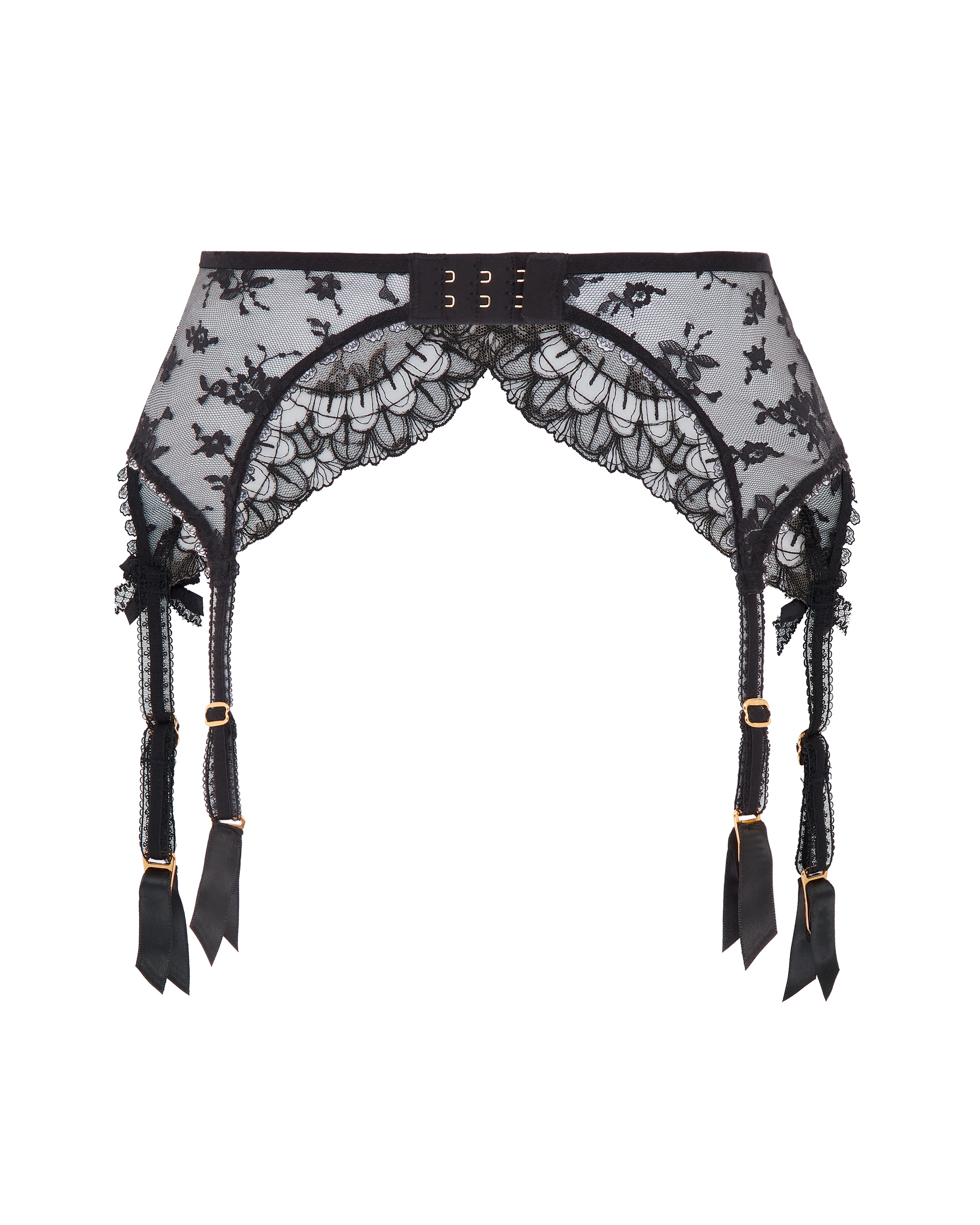 Черный пояс для чулок Floria создан для воплощения элегантного образа: швейцарская вышивка с ажурной отделкой гармонично сочетается с золотистой фурнитурой на ремешках. Нежный кружевной бантик и аккуратный волнистый край добавляют изящный штрих. Комбинируйте с другими элементами коллекции Floria для завершенного образа.