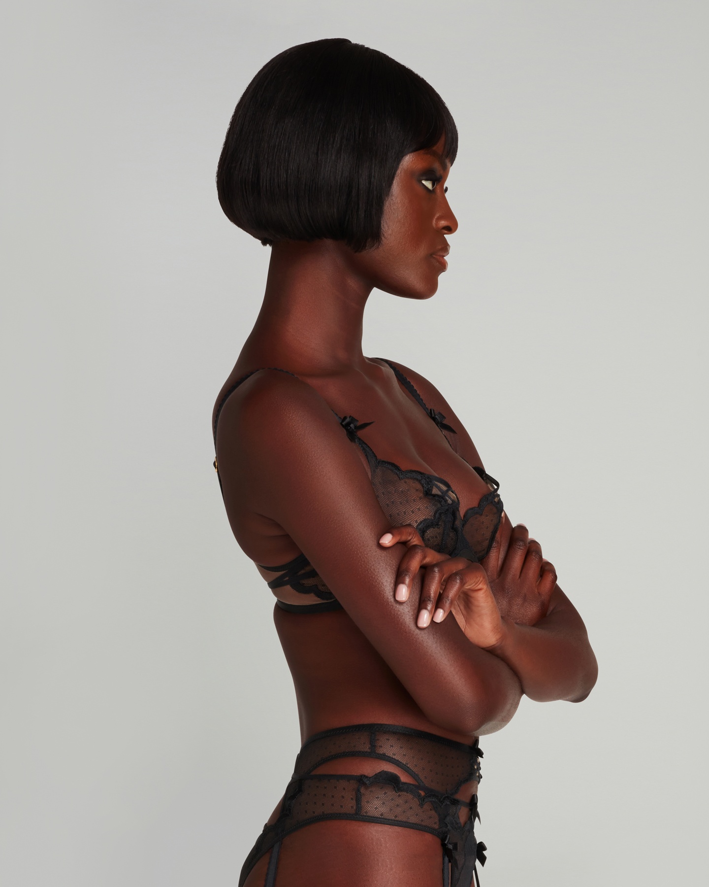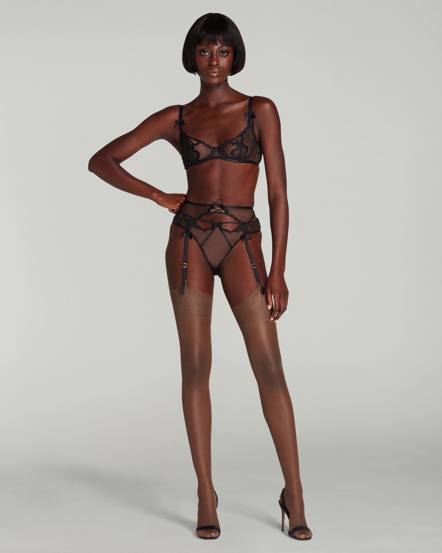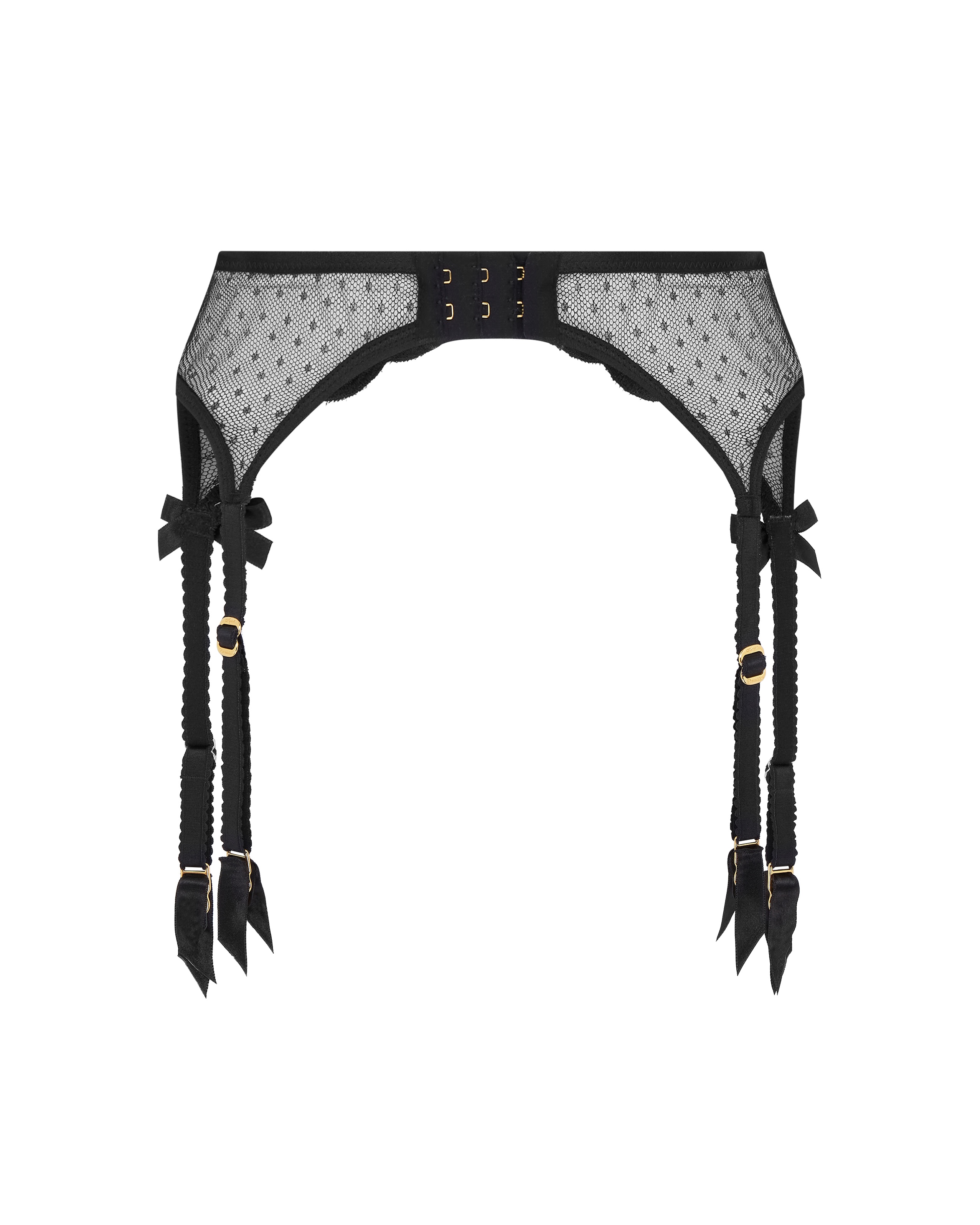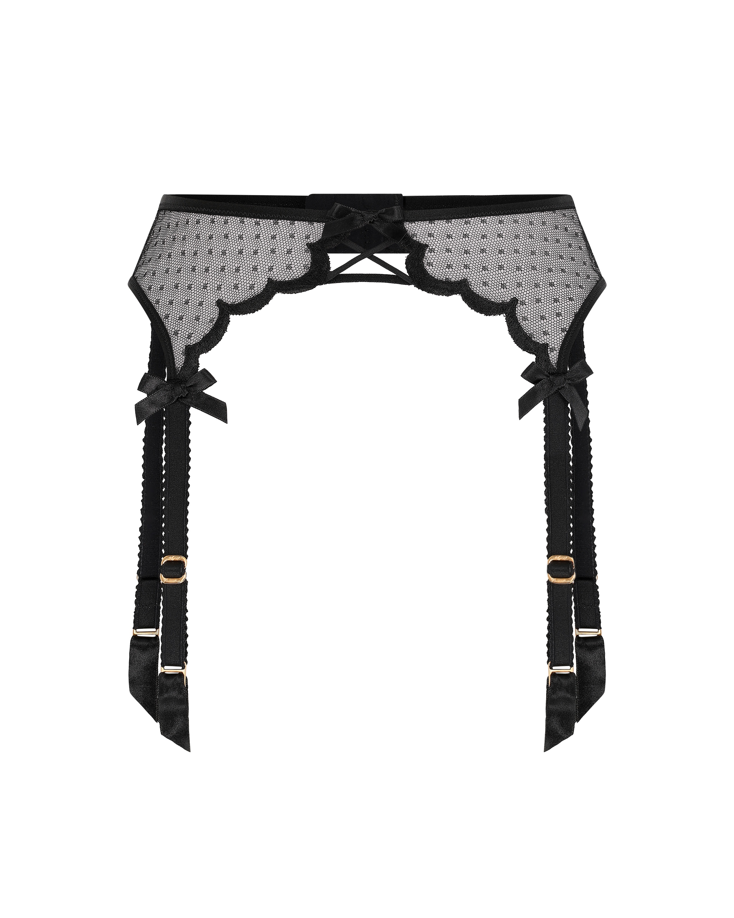 Пояс для чулок Katanah выполнен из швейцарского тюля в горошек с эффектной вышивкой и деталями из плетёных лент спереди. Фурнитура с позолотой. Дополните комплект остальными изделиями из коллекции.