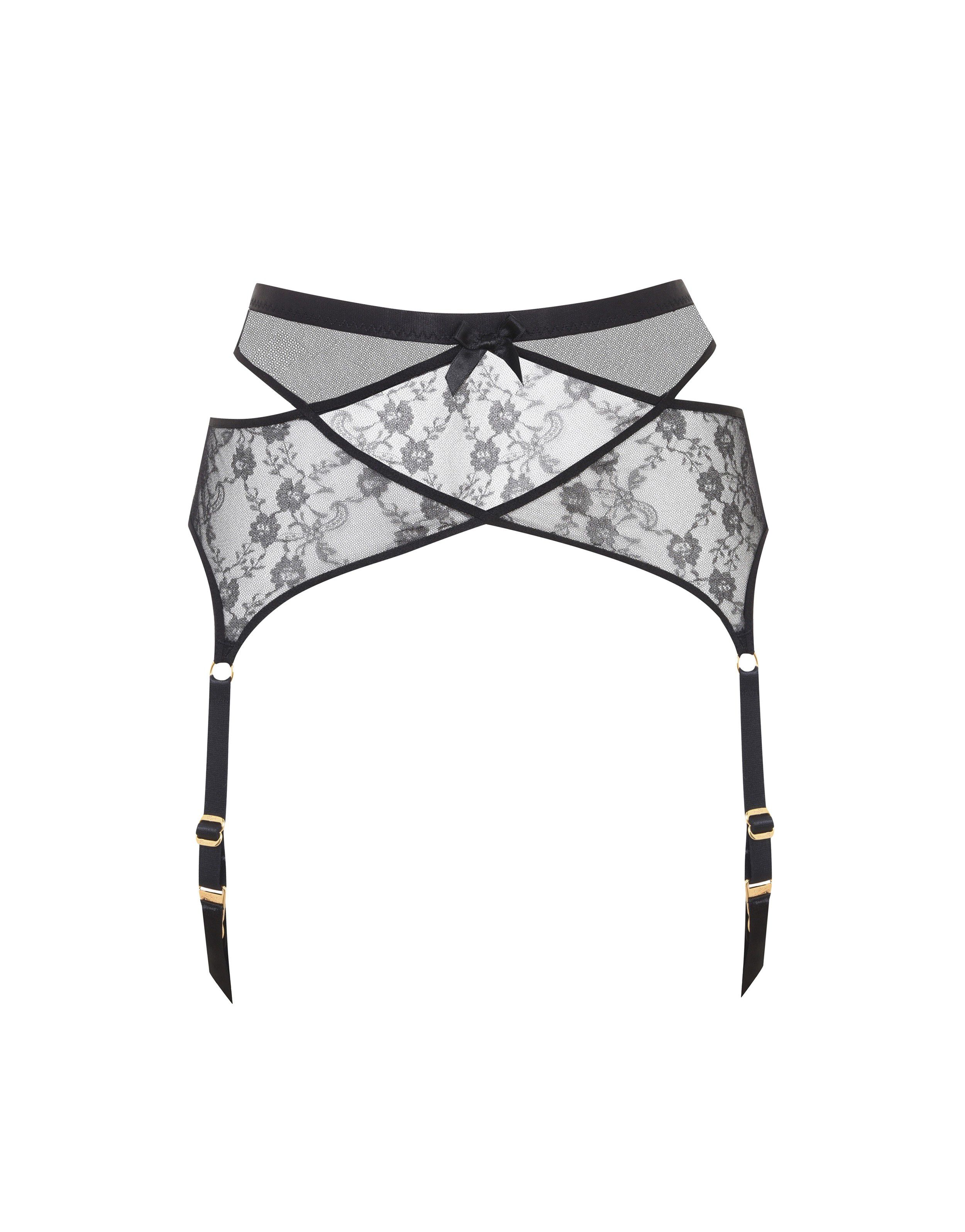 Идеальное дополнение к драматическому комплекту Iza - пояс, выполненный из двух видов черной сетки. Основа в виде полупрозрачного материала украшена фигурной деталью с цветочными мотивами. Пояс дополнен регулируемыми ремешками и застежкой на крючки сзади.