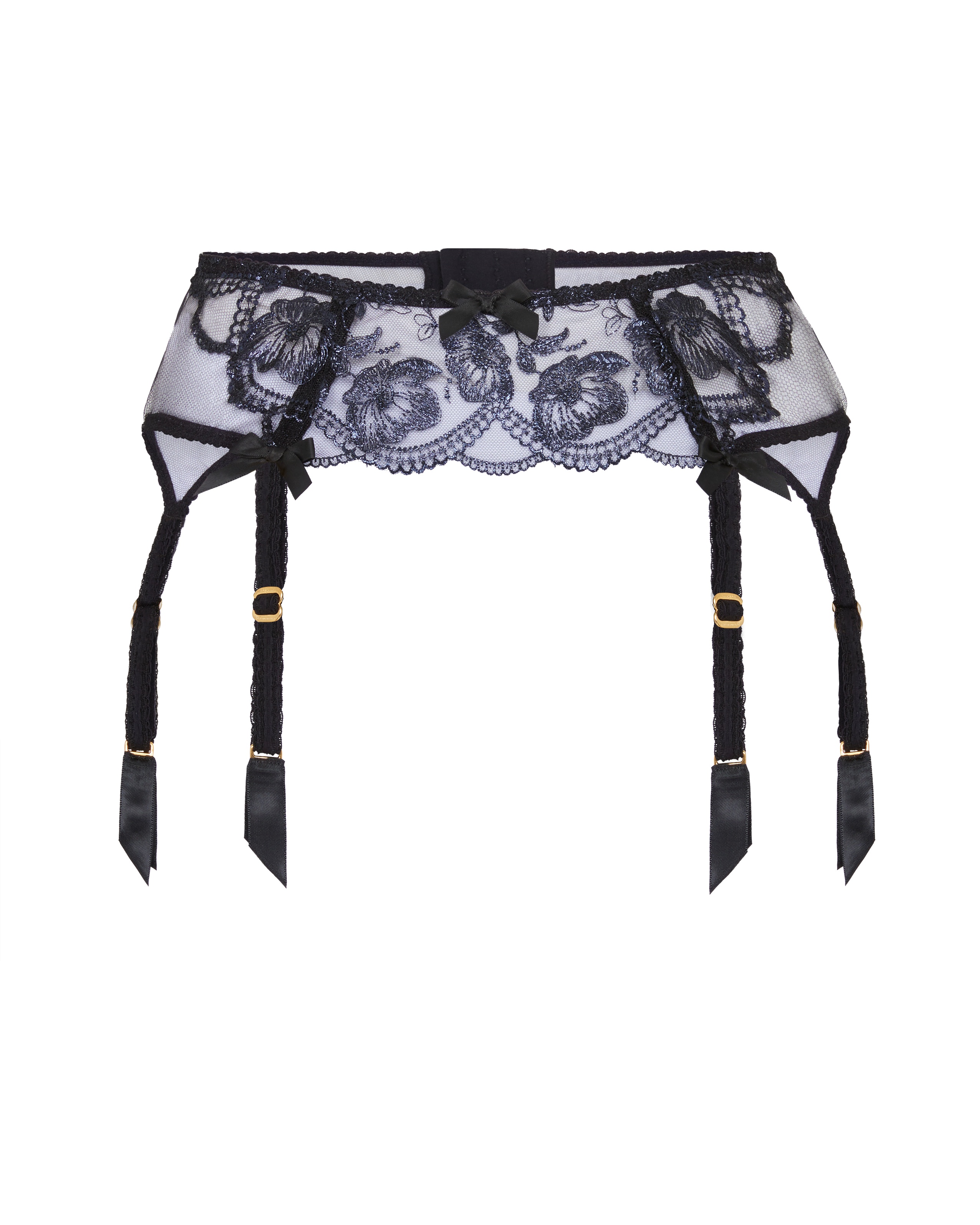 Пояс для чулок Winnette в контрасте черного и синего цветов украшен цветочной вышивкой с мерцающим эффектом. Фурнитура на подвязках покрыта настоящим золотом. Создайте нежный образ, дополнив его другими предметами коллекции Winnette.