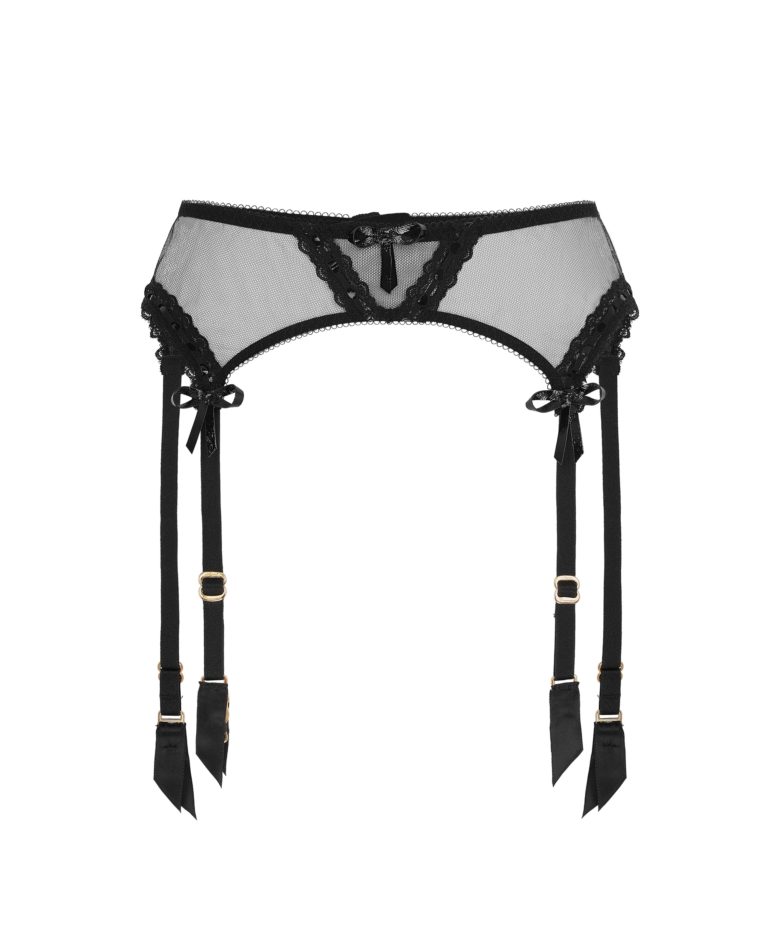 Черный пояс для чулок Zarie украшен многослойным итальянским тюлем на передней панели, создавая интересный визуальный эффект. Детали отделки с прорезями для лент и бантики из ПВХ добавляют игривости. Регулируемые ремешки с золотым покрытием и застежка с крючками на спине обеспечивают идеальную посадку. Носите с остальными изделиями из коллекции Zarie для завершения образа.