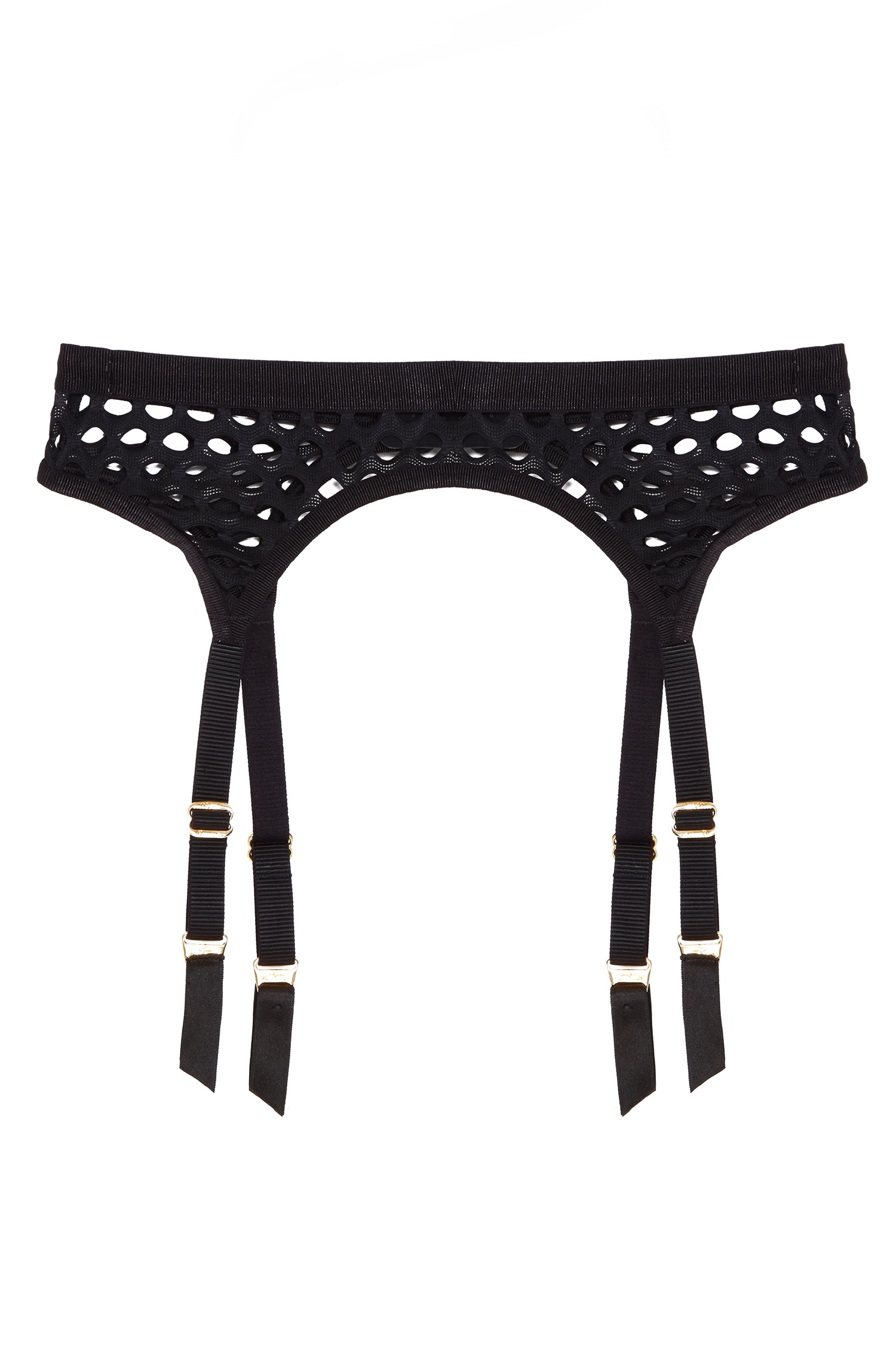 Черный пояс выполнен из оригинальной крупной сетки с черной резинкой. Пояс дополнен четырьмя черными пажами, сатиновыми вставками и золотой фурнитурой.