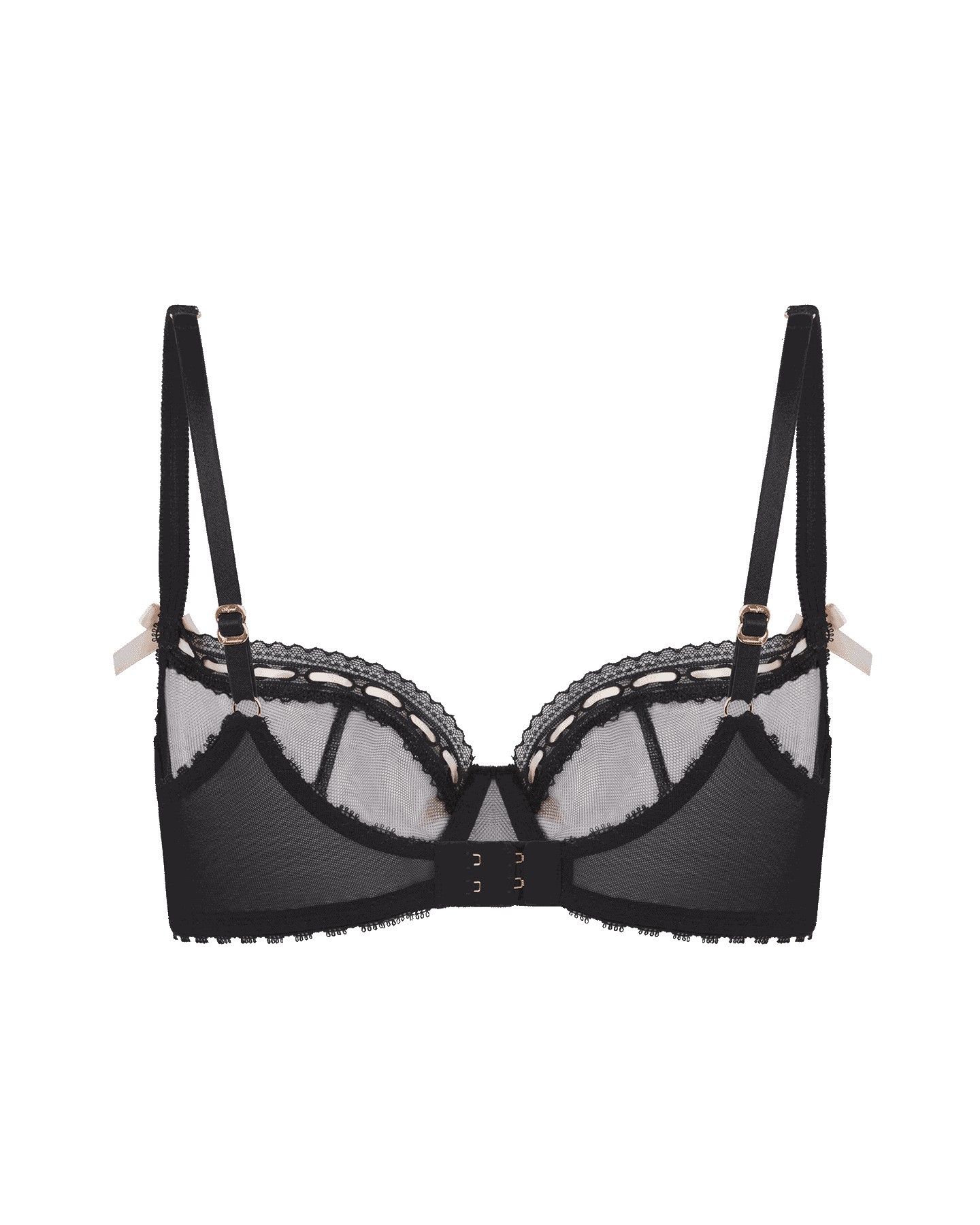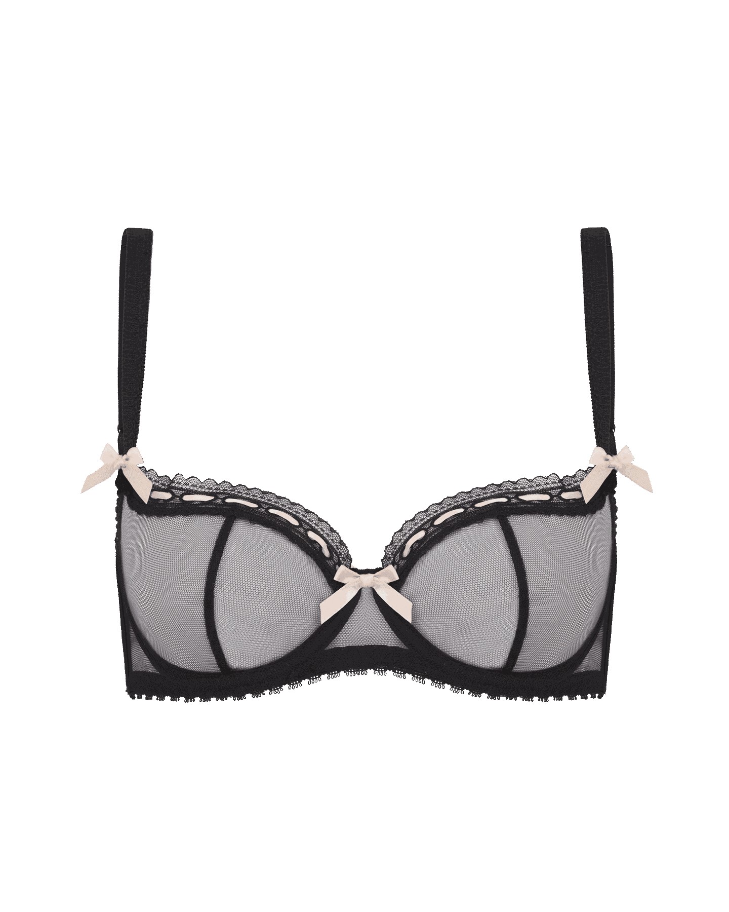 Бюстгальтер Claira отличается мягкими чашечками кроя балконет на косточках, которые обеспечивают комфортную поддержку груди. Для этой модели мастера бренда выбрали тончайший полупрозрачный тюль черного цвета и украсили ее изысканными атласными лентами и бантами светло-розового оттенка. Именно такое сочетание цветов стало культовым для Agent Provocateur.