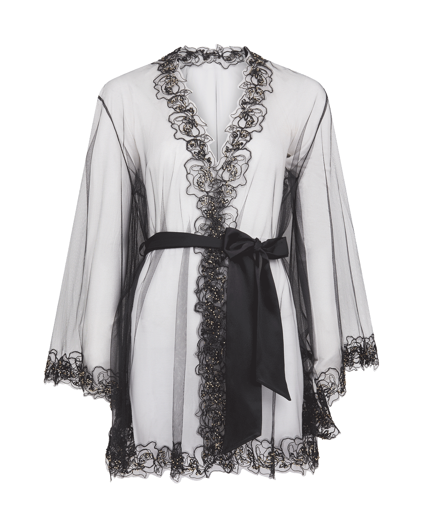 Дополните образ соблазнительным халатом кимоно Lindie. Сочетание полупрозрачного тюля, обволакивающего фигуру, и контурной вышивки, вручную расшитой мерцающим бисером, создает невероятно впечатляющий образ для самых романтических свиданий. Подберите в комплект бюстгальтер, трусики и пояс из коллекции Lindie.
