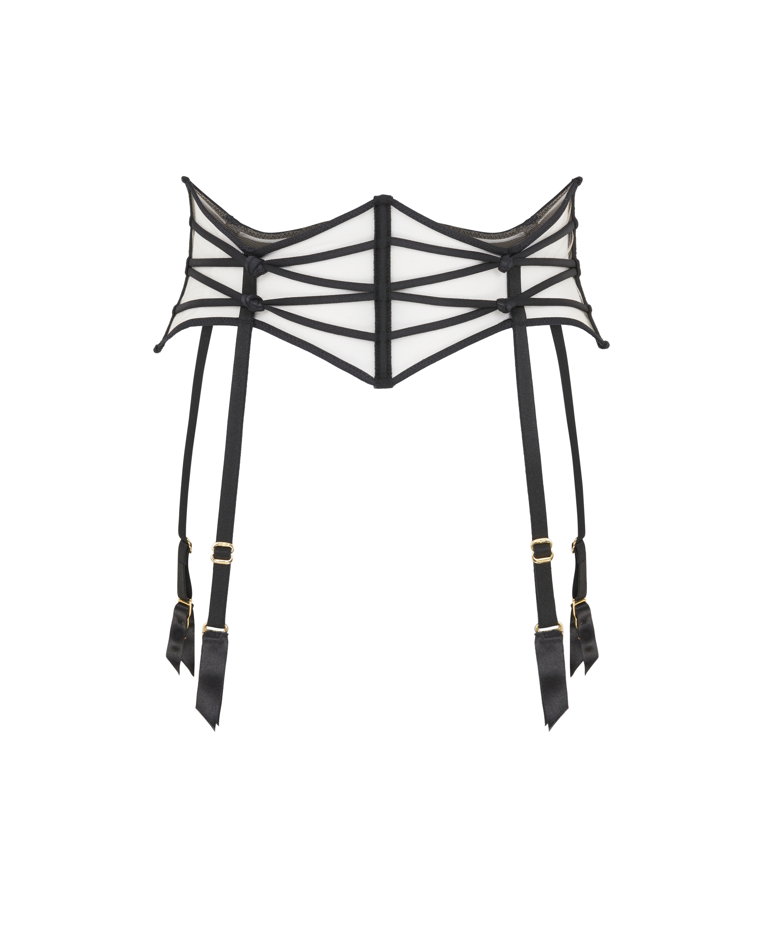 В коллекции Ozara представлен черный прозрачный корсетный пояс с основой из итальянского тюля и ремешками с узлами. Сатиновая обшивка косточек помогает создать выразительную форму. Регуляторы и фурнитура с золотым покрытием добавляют роскоши. Носите с другими элементами коллекции Ozara для создания стильного и притягательного образа.