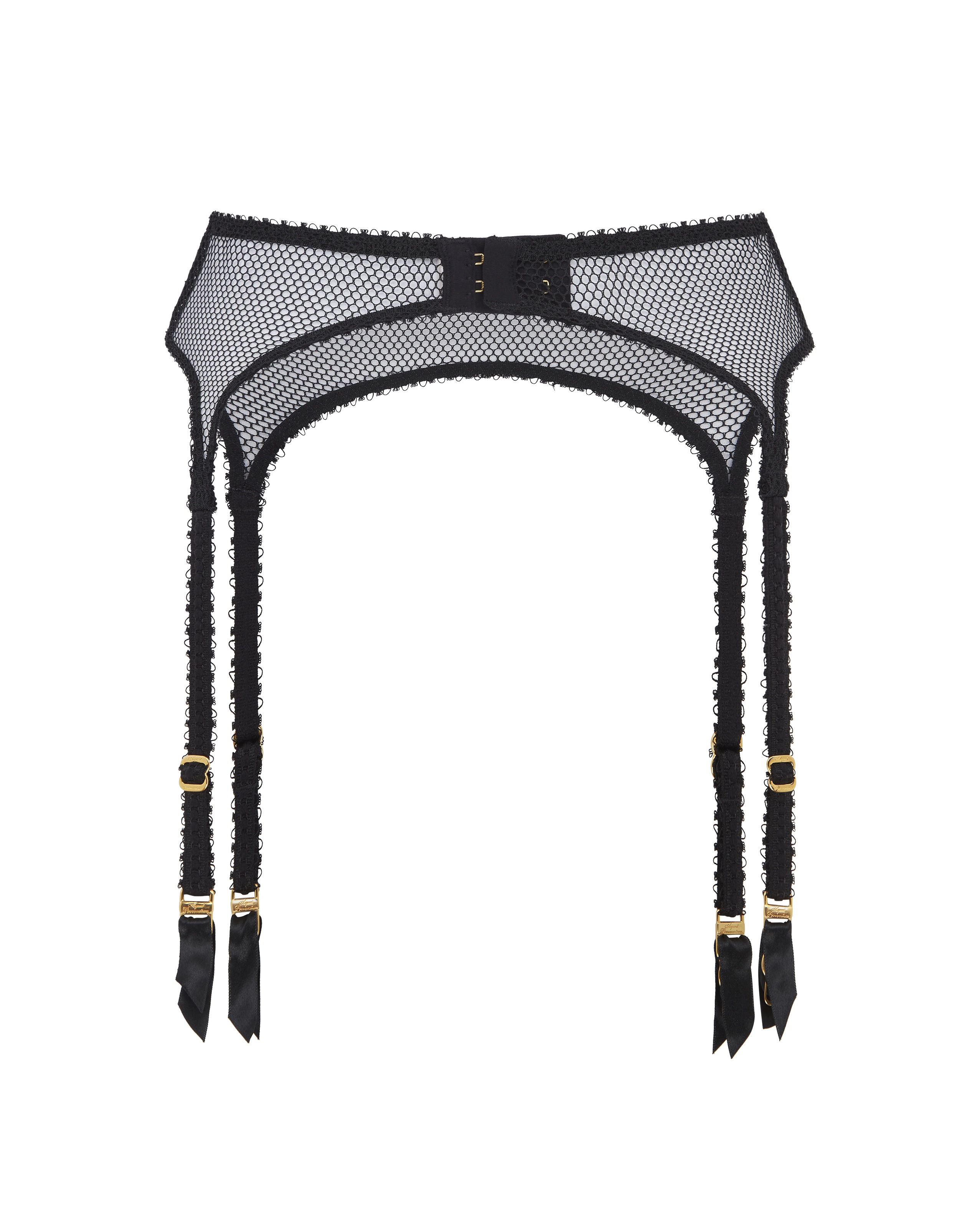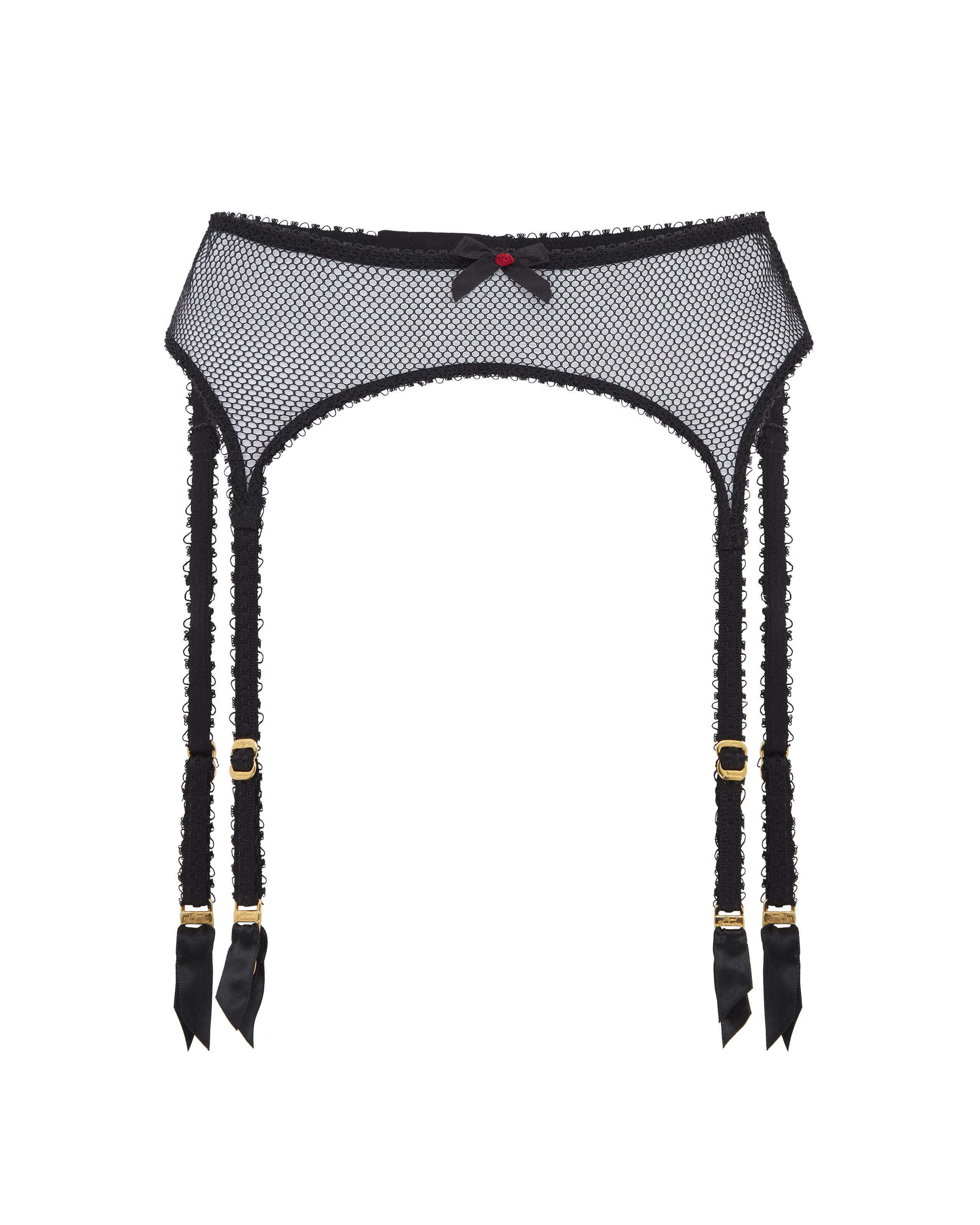 Пояс Raiven сшит из черной полупрозрачной сетки и украшен фестончатыми окантовками. Акцентом стал атласный бант с красным бутоном по центру. Пояс дополнен регулируемыми ремешками и застегивается на крючки сзади.