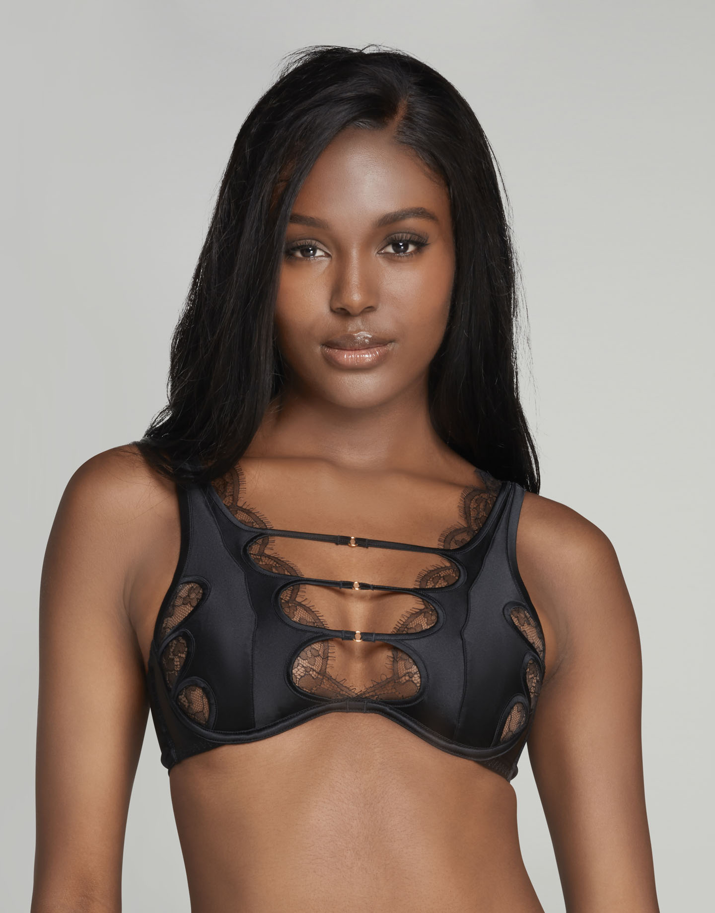 Женственно-воинствующая модель бюстгальтера Larisa выполнена из эластичного шелка. Благородный атласный блеск подчеркнут фигурными деталями в области декольте. Графичные перетяжки гармонично соседствуют с нежным кружевом, завершенным ресничным краем. Фирменная золотистая фурнитура обеспечивает регулировку бретелей и застежку сзади.