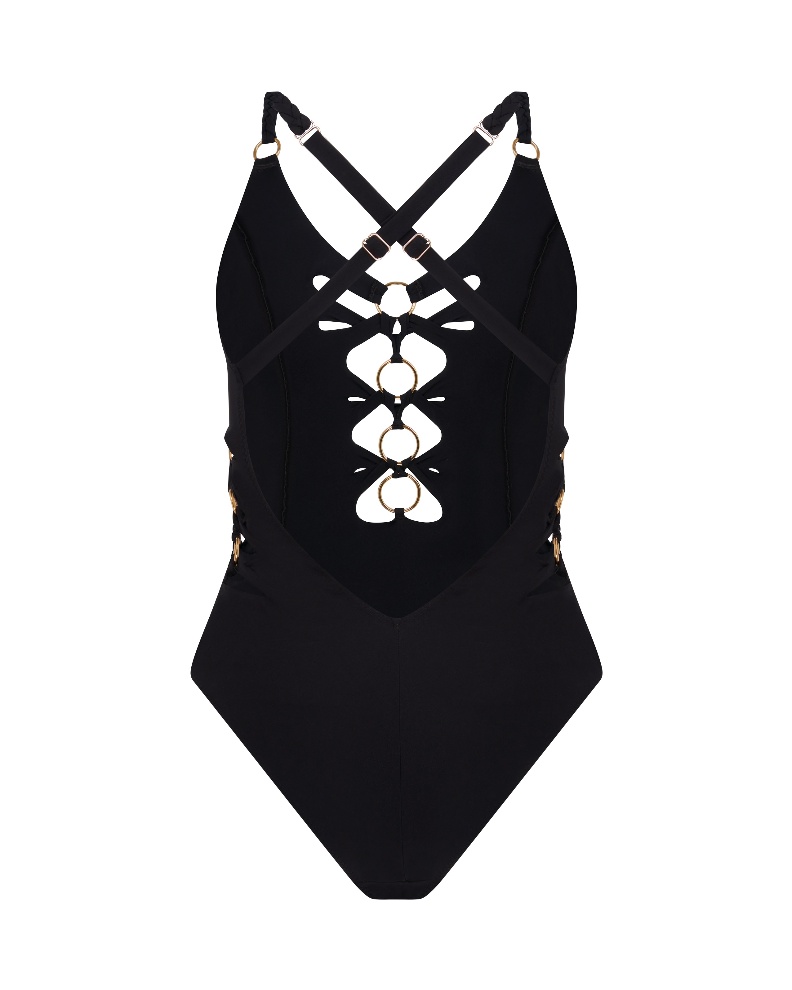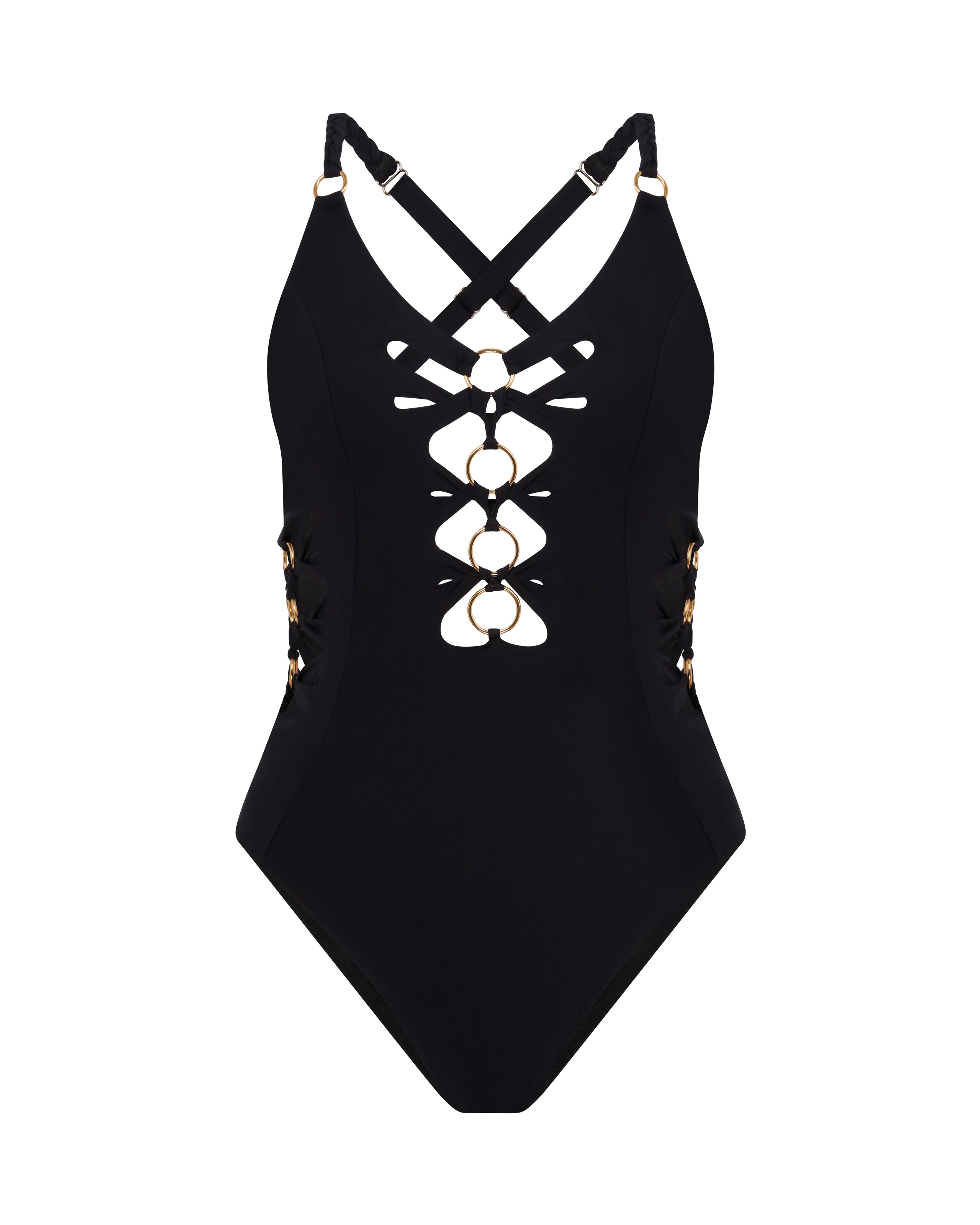 Слитный купальник Ginny черного цвета с глубоким вырезом выполнен из итальянского купального джерси. Украшен прорезями, открывающими кожу. Спереди — ручное переплетение ткани и колец в технике макраме. Плетеные лямки ручной работы спереди. Дерзкий глубокий вырез на спине и бразильский крой сзади. Металлические слайдеры на спинке имеют водо- и термостойкое покрытие.