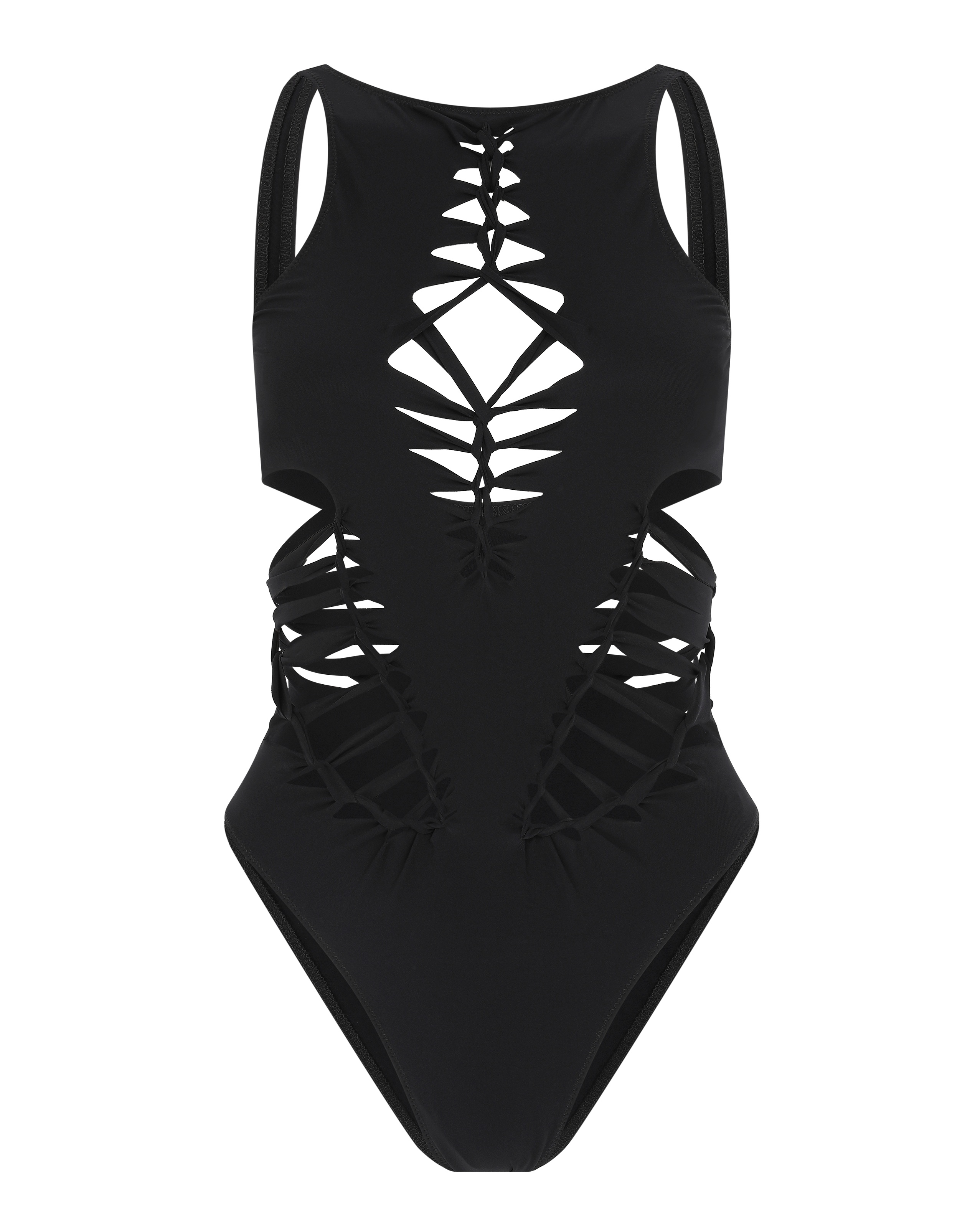 Слитный купальник Rayne в черном цвете — это идеальное сочетание высоких вырезов на ногах и элегантного кроя. Эффектный вырез с узлами на груди и открытая спина делают его смелым выбором, а итальянская ткань обеспечивает комфорт и роскошный вид.
