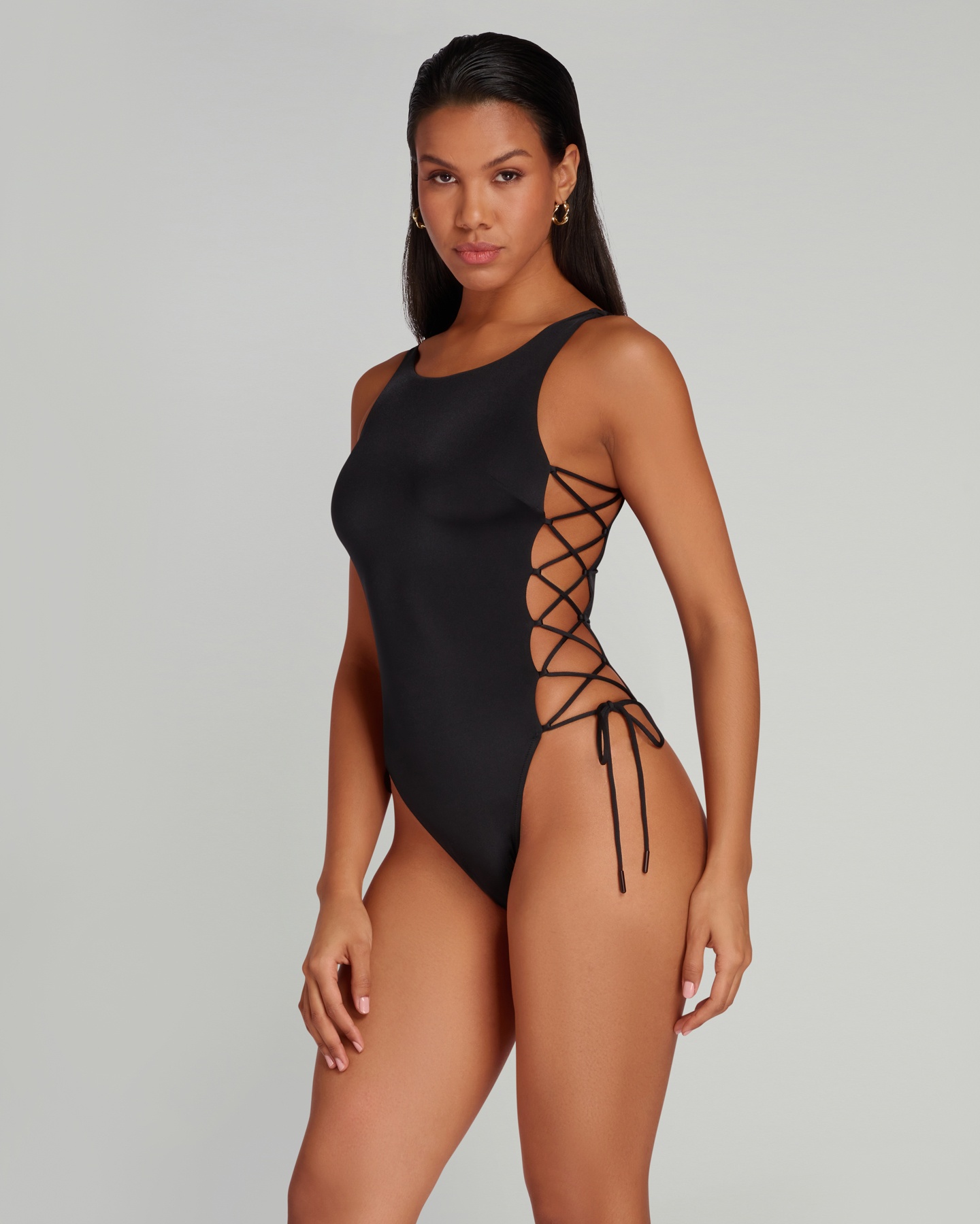 В коллекции Sellena представлен черный слитный купальник из итальянской ткани, предназначенной для плавания. Функциональная шнуровка по бокам и высокий вырез на бедрах создают смелый и привлекательный вид.
