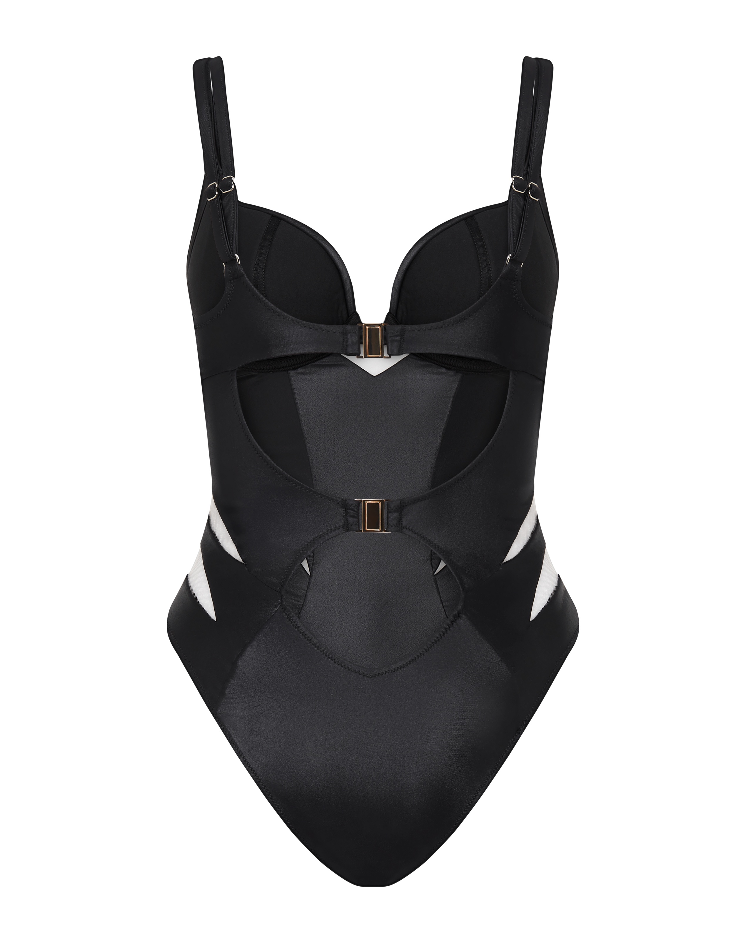 Купальник Talya выполнен из ткани с эффектом влажного блеска и дополнен прозрачными вставками из невидимого тюля на талии. Жесткие чашки придают форму, а застежки с золотым покрытием выдерживают воздействие воды и температуры.