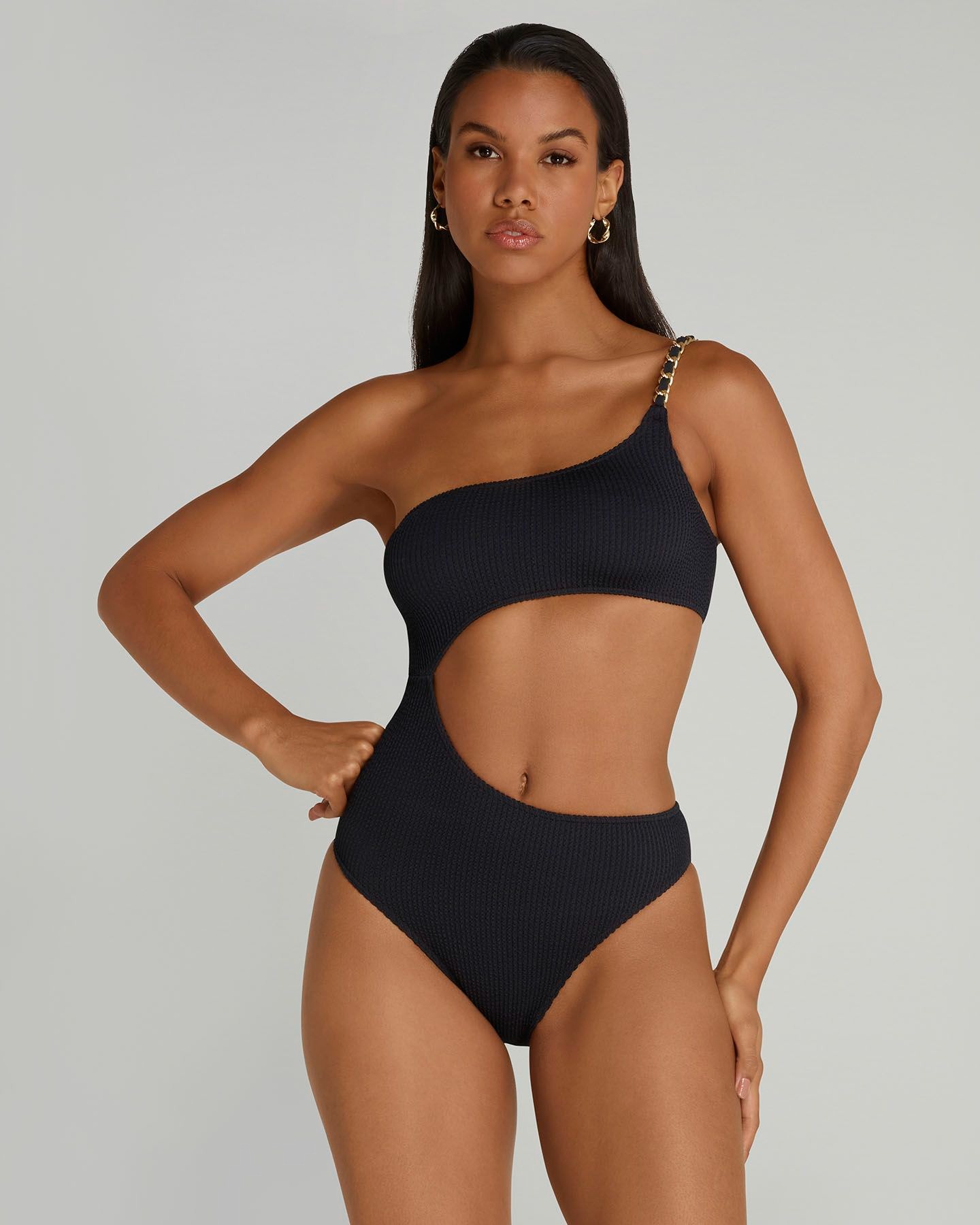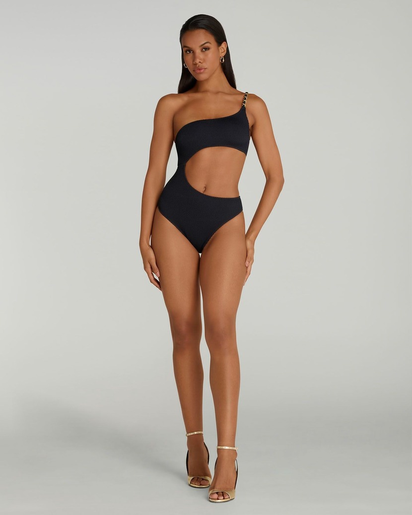 Черный слитный купальник Tiaa с асимметричным кроем и вырезом на талии выполнен из итальянской ткани. Цепочка на плече завершает его ярким акцентом.