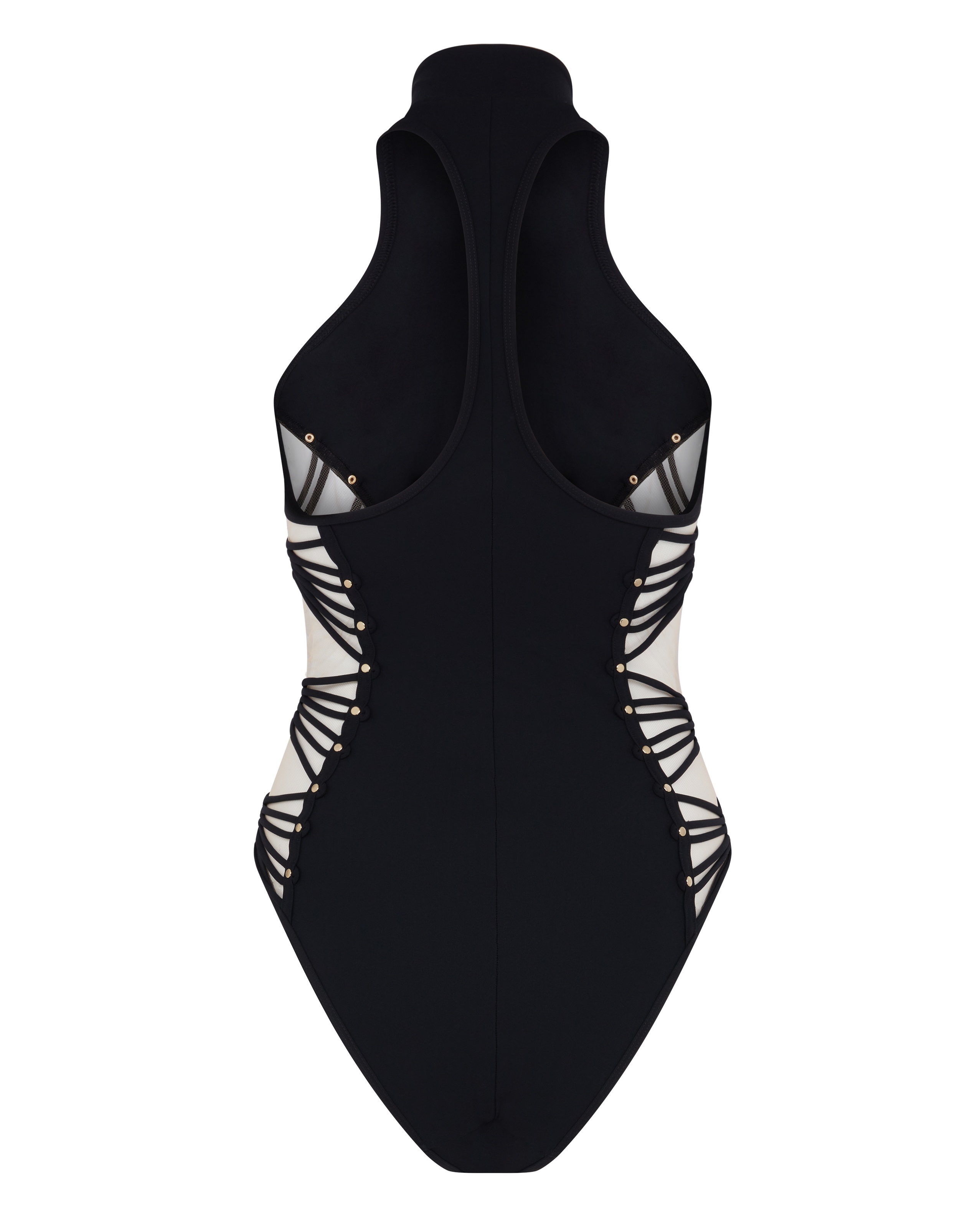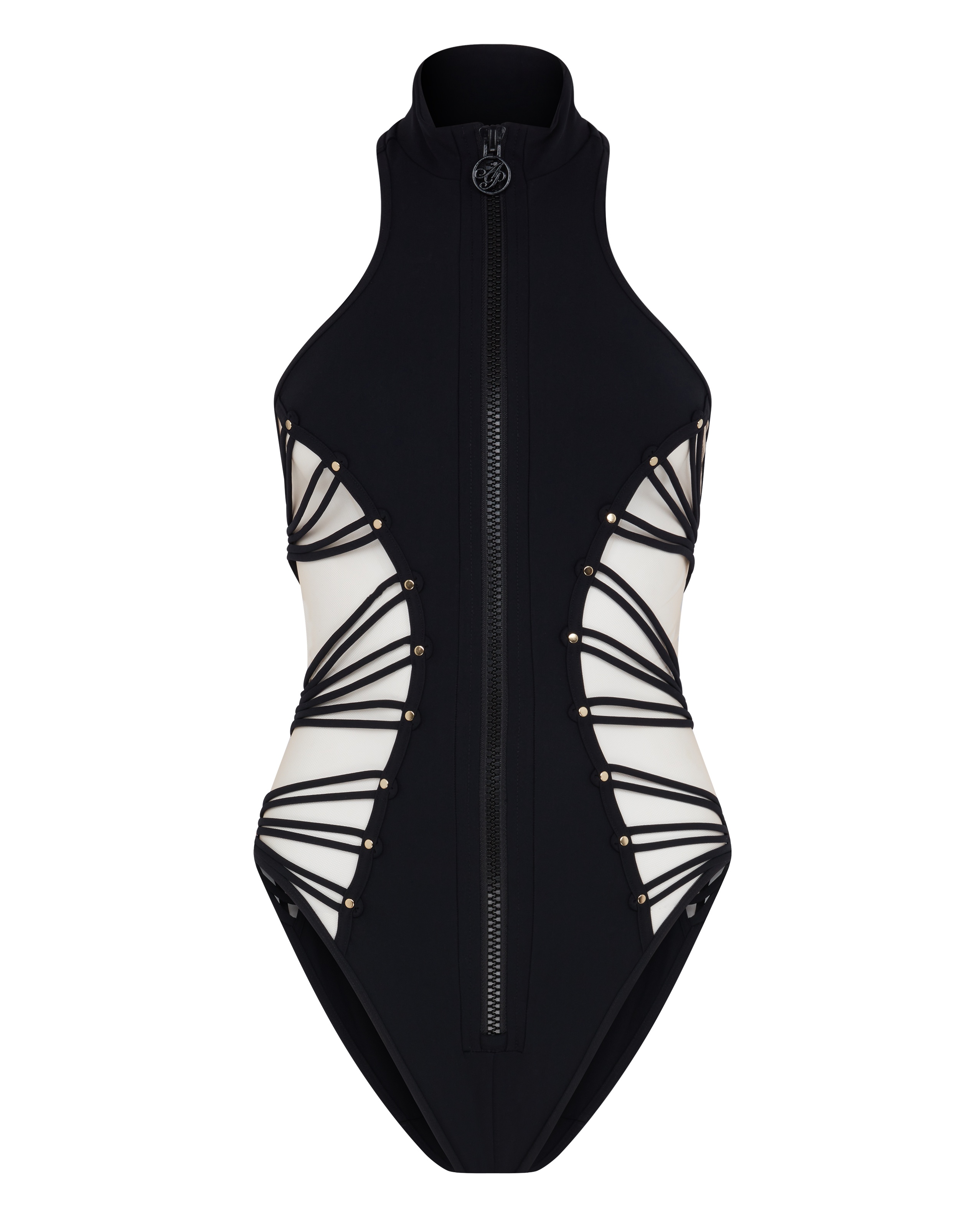 Слитный купальник Zo черного цвета выполнен из плотной итальянской купальной ткани с моделирующим эффектом. Прозрачные тюлевые вставки по бокам. Детали в виде ремешков с золотистыми заклепками. Передняя молния для создания сексуального глубокого выреза.