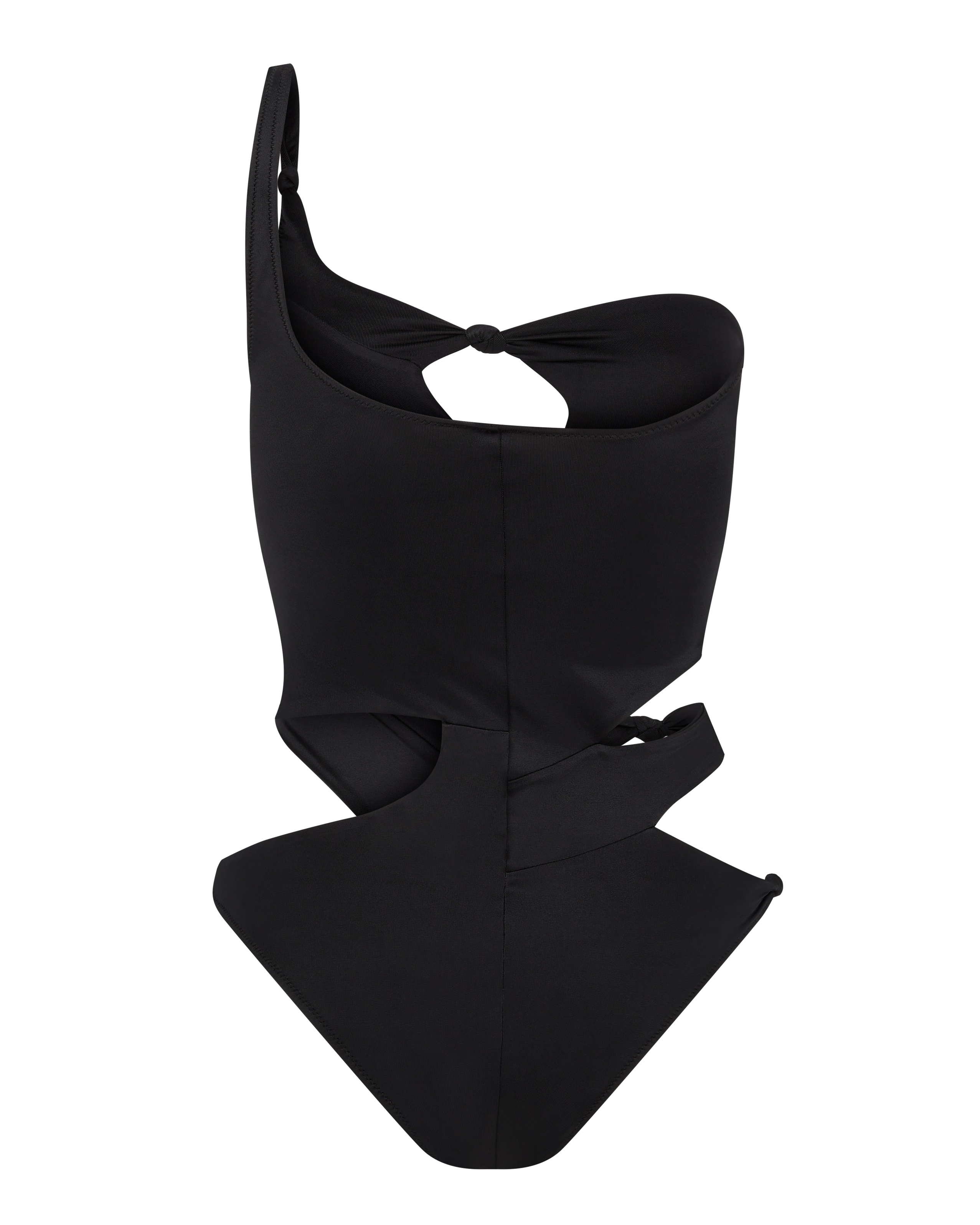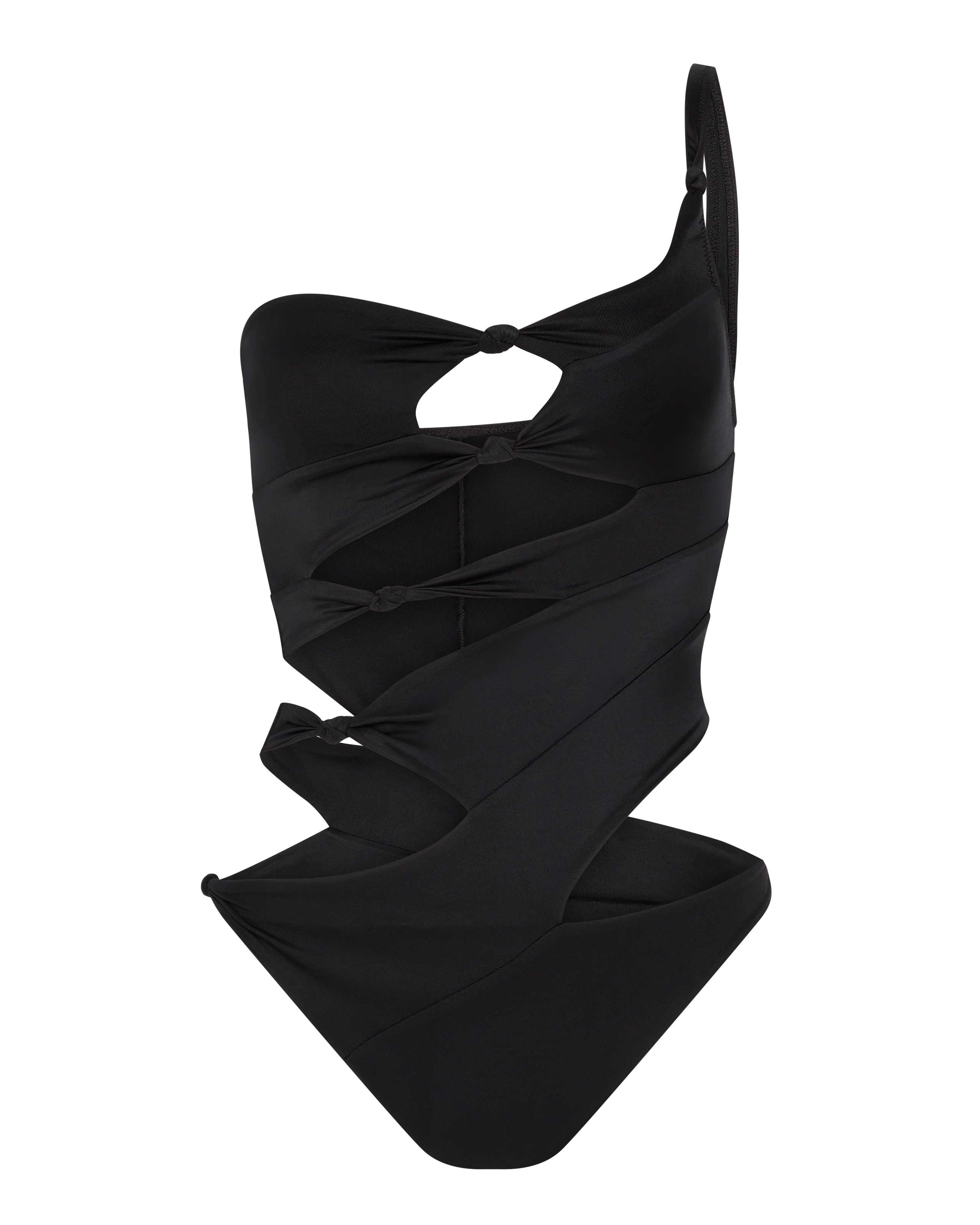 Слитный купальник Zoria с асимметричным кроем и узлами в зонах вырезов. Изготовлен из итальянского эластичного джерси, устойчивого к солнцу и воде.