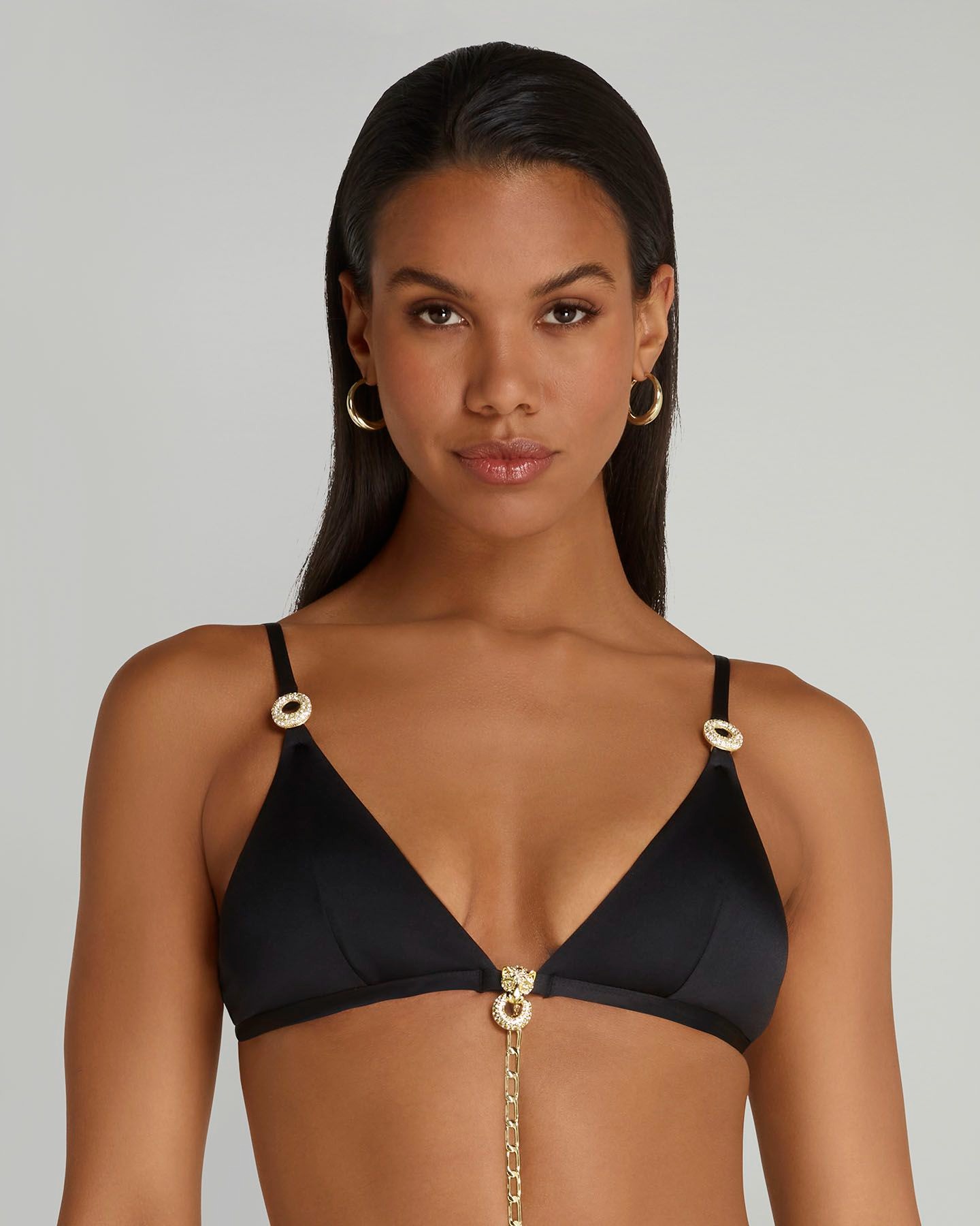 Черный топ купальника Haislee изготовлен из высококачественной итальянской ткани для плавания. Изящные детали фурнитуры цвета золота с кристаллами и леопардом между чашечками добавляют модели роскошный акцент. Съемная цепочка обрамляет талию и может быть соединена с плавками Haislee для завершения образа.