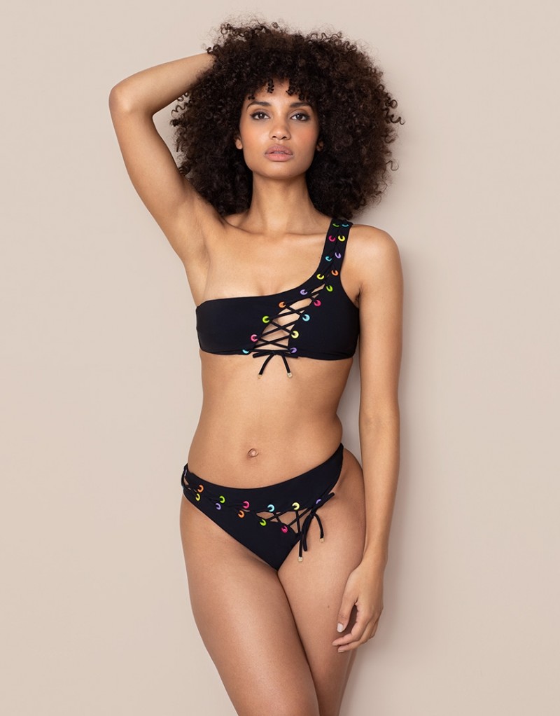 Игривая, спортивная Marney - воплощение ностальгии по 90-м. Черный бюстгальтер бикини с асимметричным дизайном на одно плечо украшен разноцветными неоновыми люверсами и дерзкой шнуровкой поверх прозрачного тюля. - Сочетайте с плавками бикини Marney Материалы и уход: Основной материал: 75% полиамид, 25% эластан. Сетка: 100% полиамид. Рекомендована ручная стирка. Не отбеливать. Не замачивать. Бережная сушка. Не гладить.