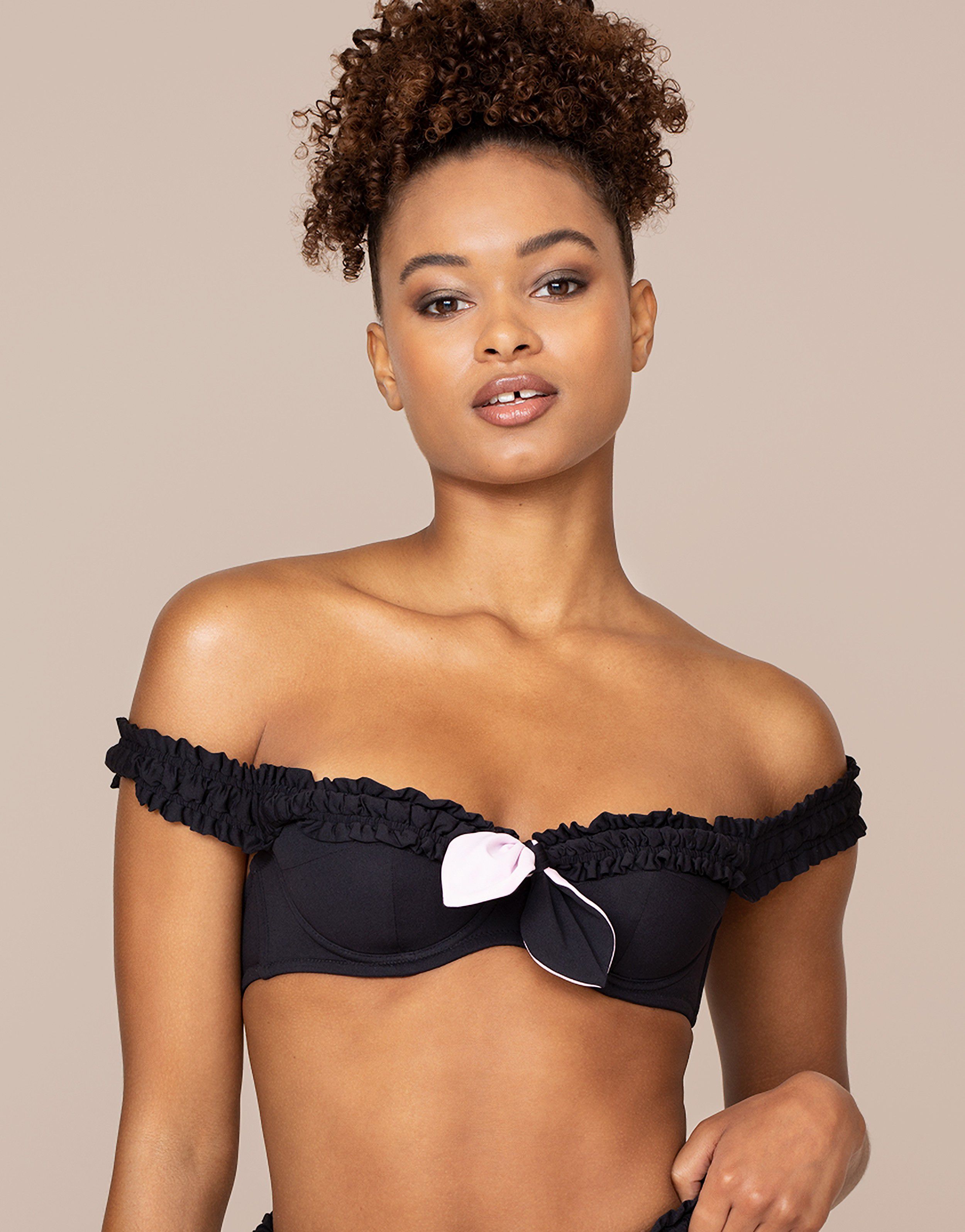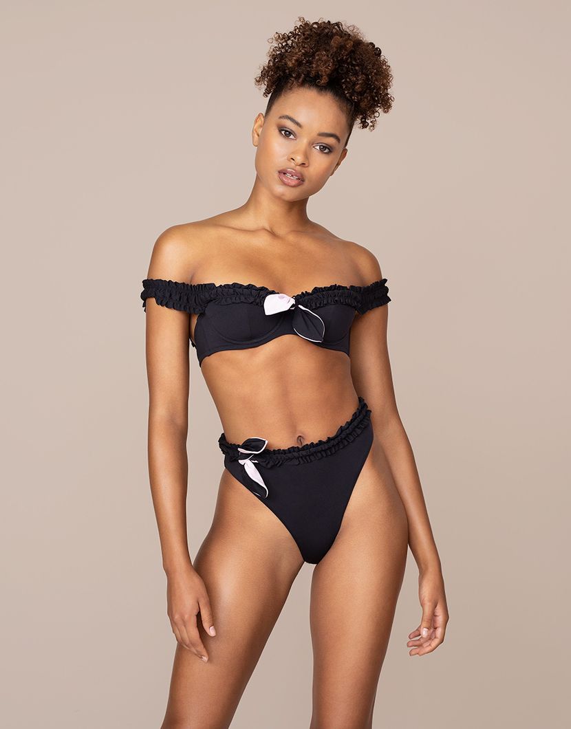 Бюстгальтер купальника Nemi с уплотненными чашечками на косточках. Специальный крой с рельефами обеспечивают естественную поддержку груди. Модель украшена объемными оборками, которые идут по краю и переходят в бретели. По центру ключевая деталь серии Nemi - завязка на бант.