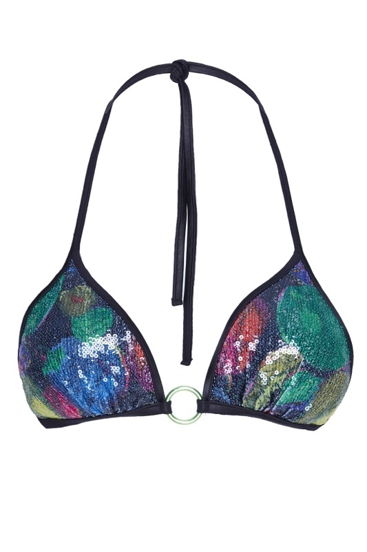 Попробуйте запретный плод в сексуальном сверкающем купальнике Margaritah! Этот бюстгальтер бикини усыпан пайетками с "фруктовым" принтом. Металлическое зеленое кольцо между мягких треугольных чашечек добавляет образу характерный акцент в стиле 70-х годов. Эта модель дополнена блестящими черными плавками.