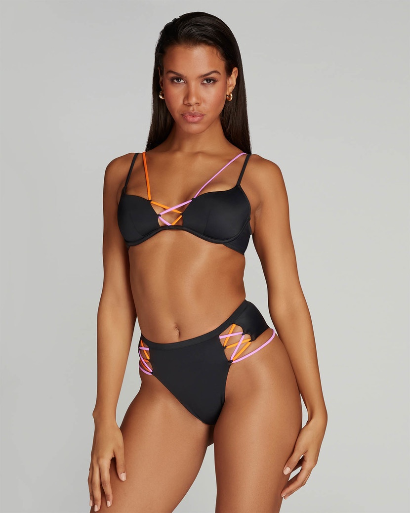 При создании топа купальника Steffi в качестве основы была выбрана матовая черная итальянская ткань для купания. Вырез украшают яркие неоновые шнурки. Покрытие ползунков и застежки содержит 18-каратное золото. Сочетайте с плавками из этой же коллекции для создания спортивно-роскошного образа.