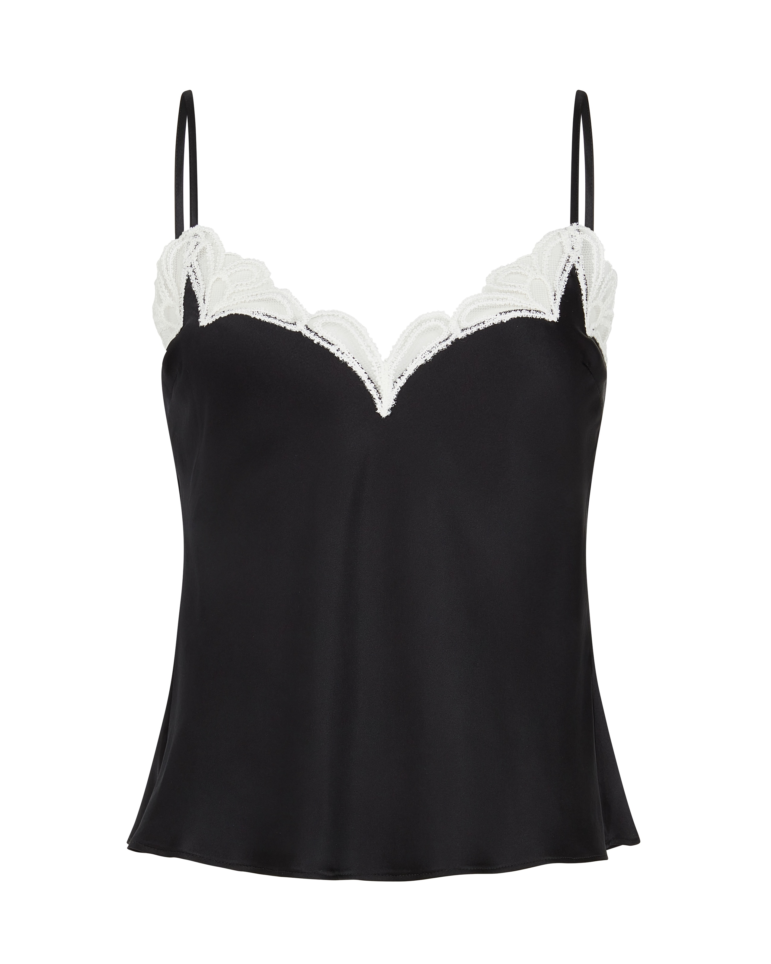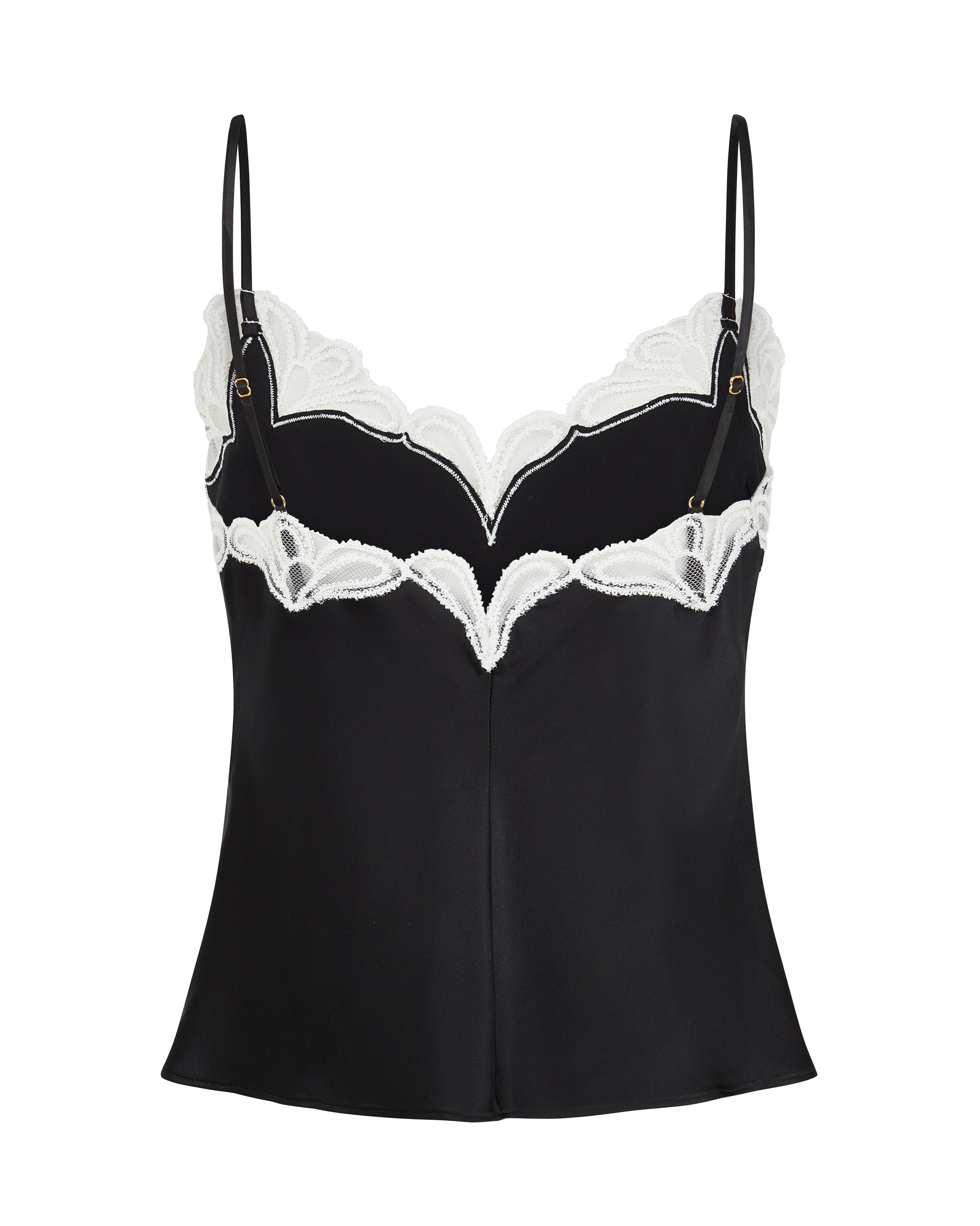 Топ пижамы Nelle черного цвета из струящегося атласа с вышитой отделкой. Атласные бретели и золотая фурнитура добавляют чуть больше роскоши. Что же выберете — остаться дома или выйти в свет?
