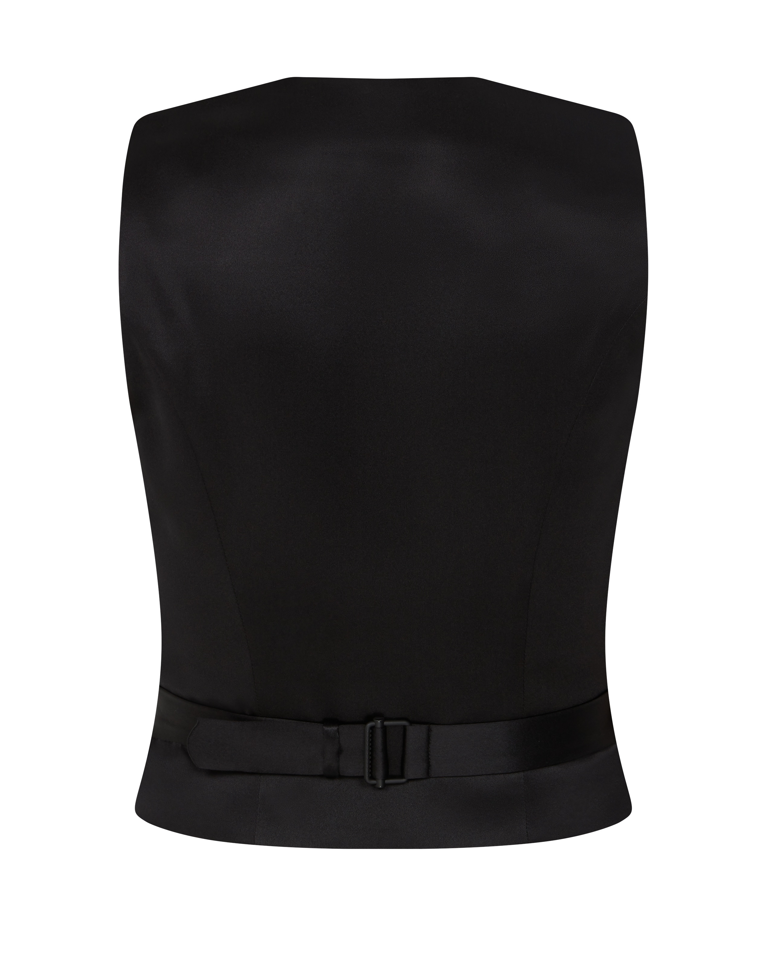Жилет Billi черного цвета с глубоким вырезом. Передняя часть пошита из крепа, задняя — из шелка. Однобортная застежка с шелковыми пуговицами и скрытыми крючками. Регулируемый атласный пояс утягивает талию, фигурный подол с разрезом. Идеальный выбор для смелого и элегантного образа.