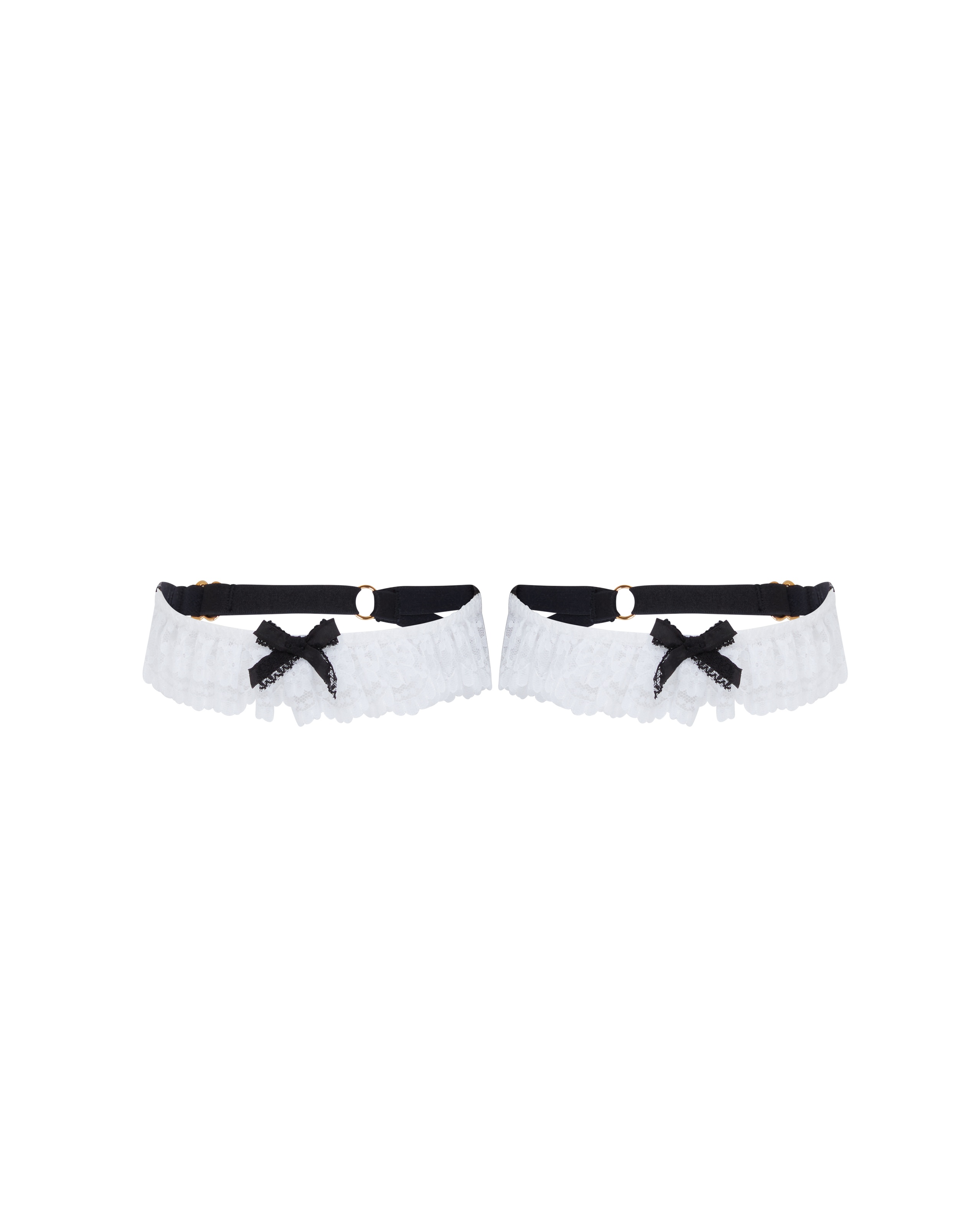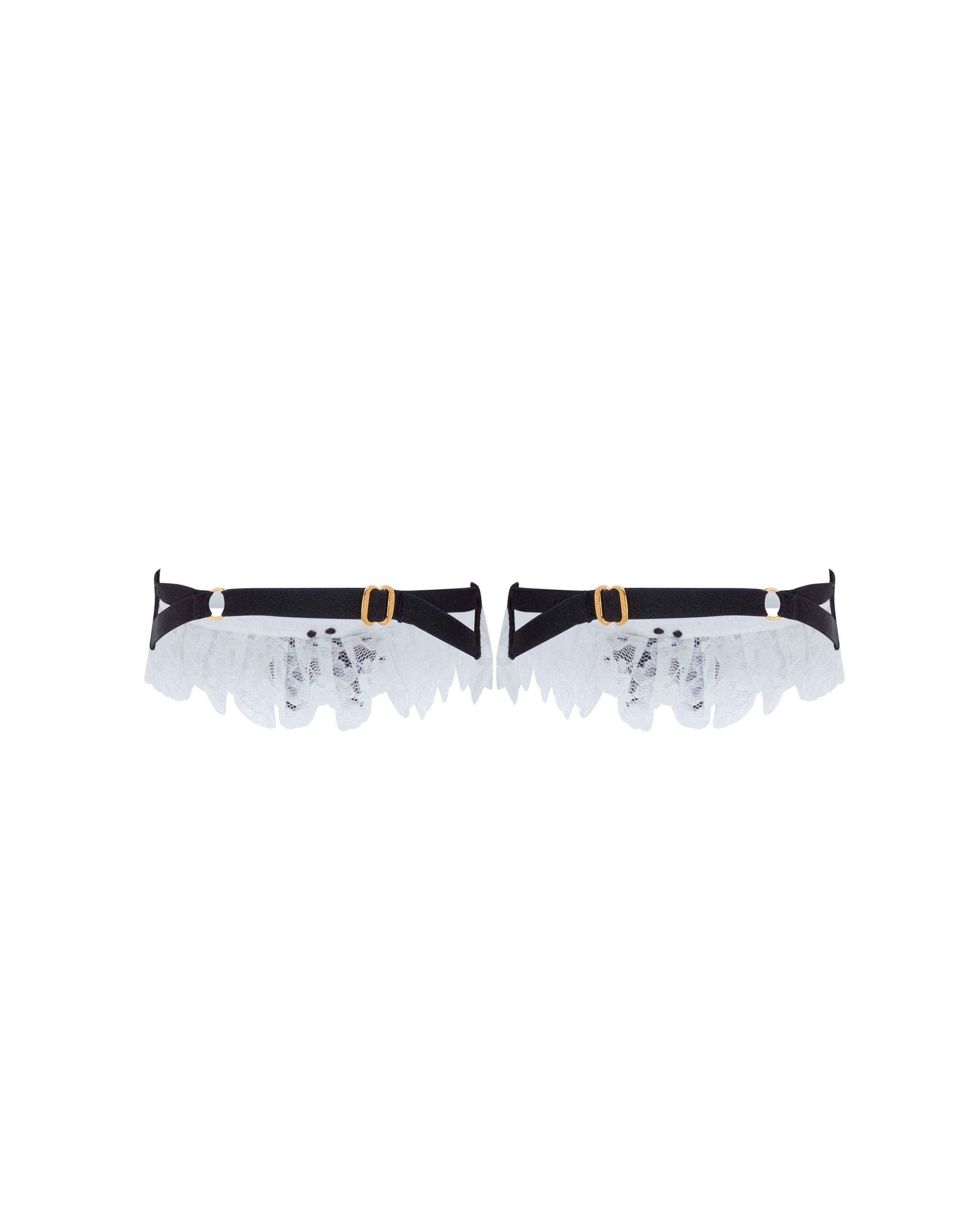 Набор подвязок Bonnie черно-белого цвета, продается парой. Украшены кружевной оборкой и контрастным черным бантом в центре. Позолоченные регуляторы для точной посадки. Косточки по бокам обеспечивают надежную фиксацию. Идеальное дополнение к комбинезону и аксессуарам Bonnie для игривого образа.