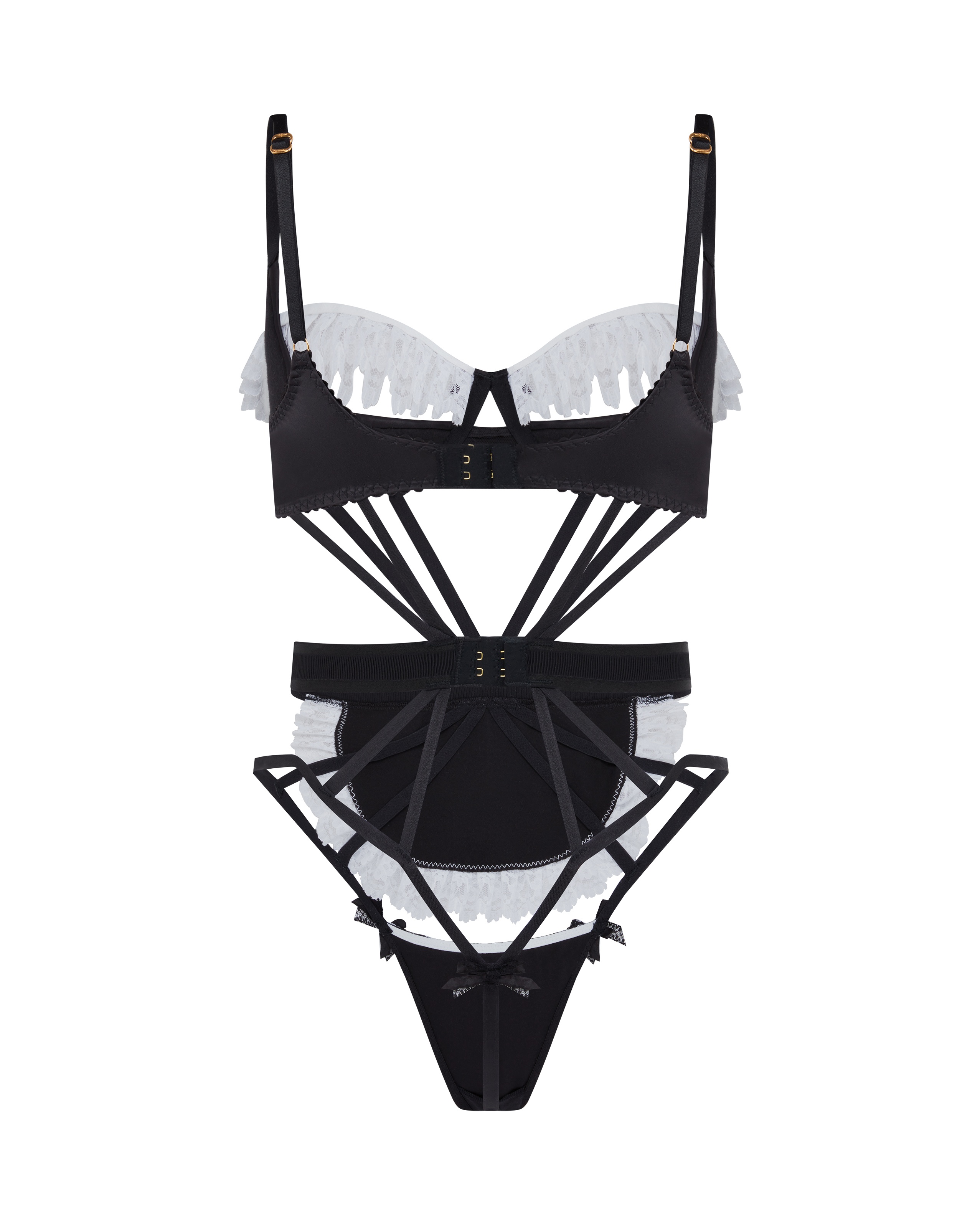 Боди Bonnie черно-белого цвета на бретелях со встроенными атласными чашками на косточках для поддержки и объема. Кружевная оборка на чашках может быть поднята или опущена. Прикрепленный атласный фартук с кружевной оборкой. Широкая поясная лента подчеркивает талию. Позолоченные регуляторы на бретелях. Дополните образ подвязками, ободком и манжетами Bonnie.