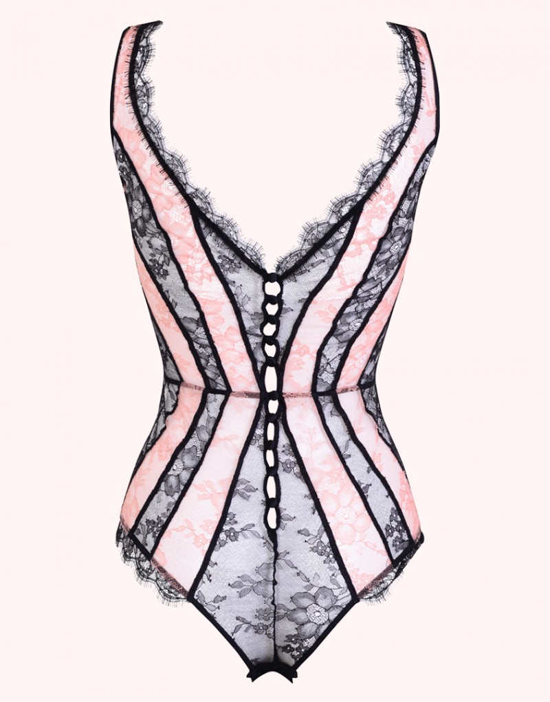 Поразительная Saffi - сочетание яркого современного дизайна и нежного женственного кружева. Соблазнительное боди с контрастными панелями черного и бледно-розового цвета и глубоким декольте украшено по всей длине маленькими сатиновыми пуговицами. Боди также украшает оторочка черным кружевом вдоль бедер и в зоне декольте. Сзади узор кружевных панелей немного сходится к центру, визуально подчеркивая стройность талии и линию бедер.