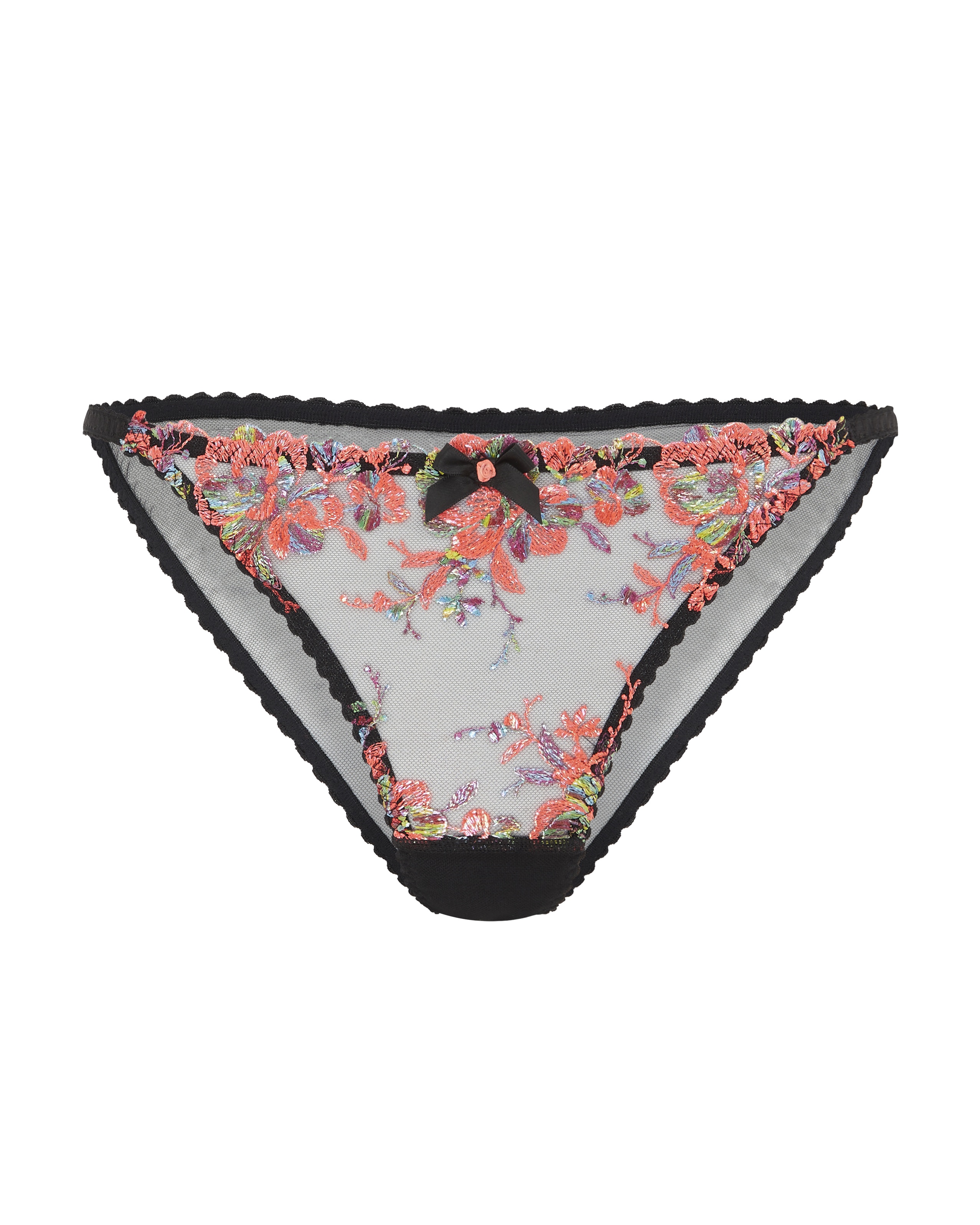 Классические трусы Lexx из прозрачного черного тюля украшены оранжевой цветочной вышивкой с металлической отделкой и милой окантовкой-гребешком. Сборка на задней части подчеркивает форму ягодиц, создавая изящный силуэт. Носите с остальными элементами из коллекции Lexx для яркого и привлекательного образа.