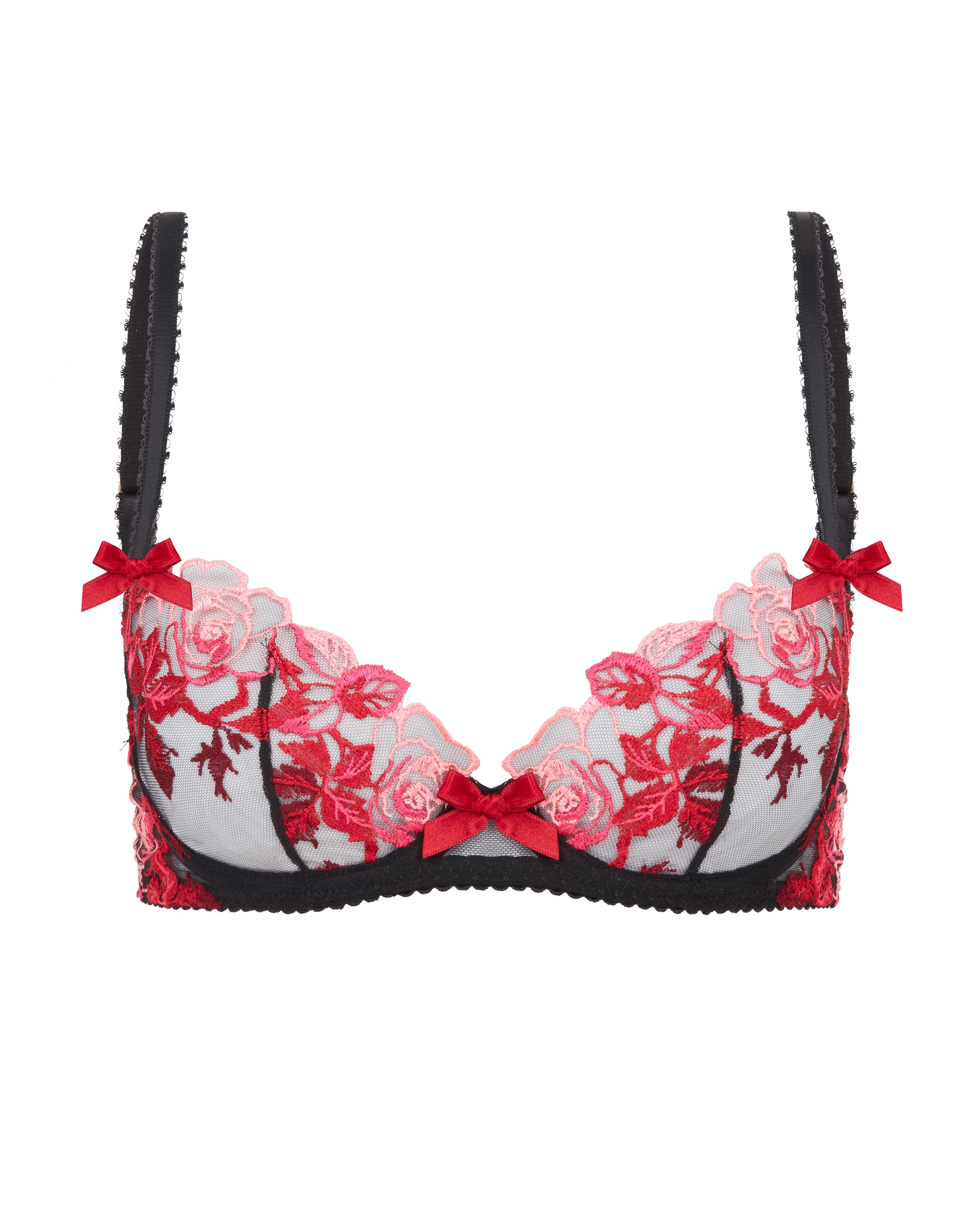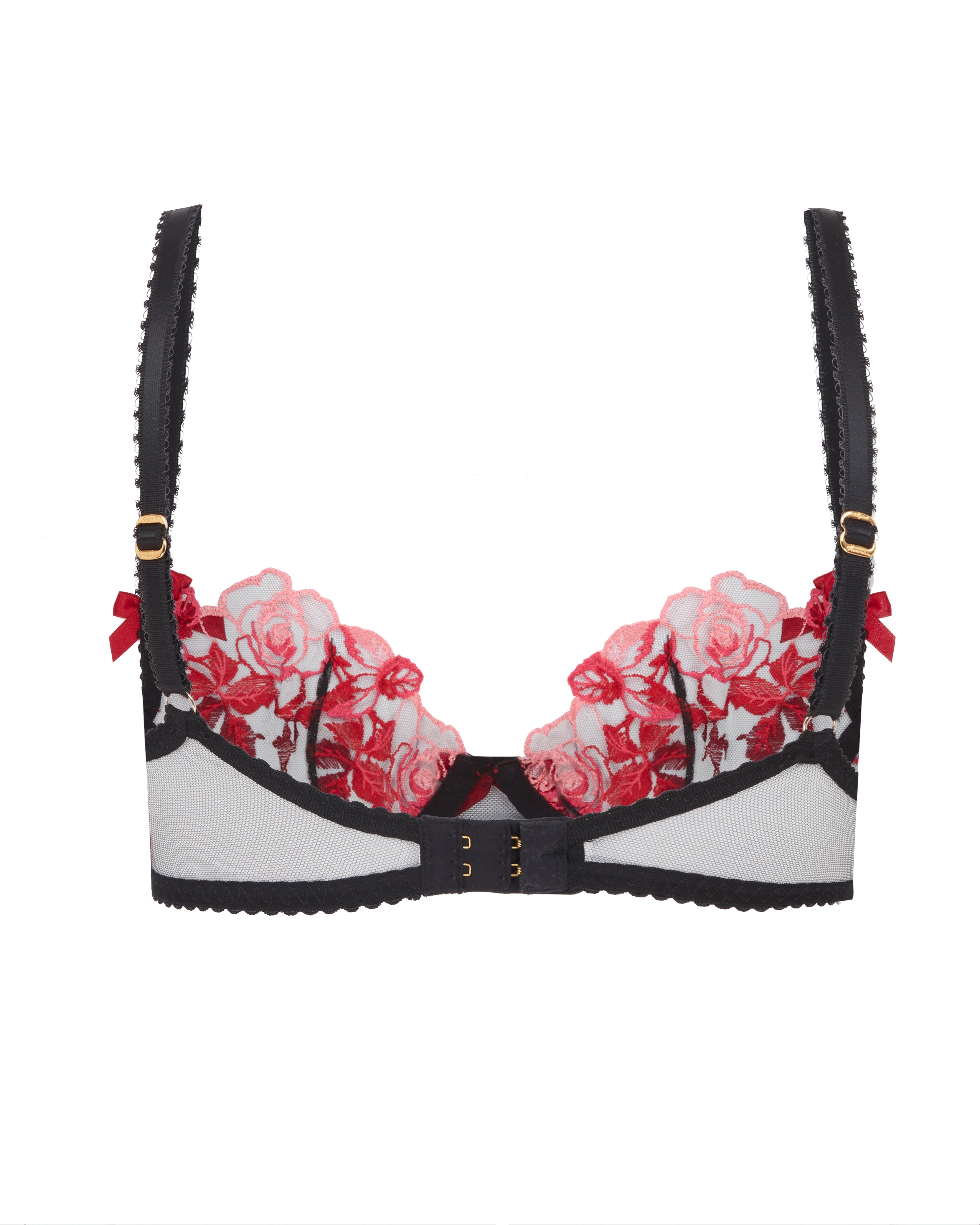 Бюстгальтер Callypso черно-розового цвета с глубоким вырезом. Модель с чашками на вытачках и изящной цветочной вышивкой на соблазнительно прозрачном итальянском тюле. Ажурный край на бретелях добавляет тонкую ноту женственности, а фурнитура с золотистым покрытием обеспечивает роскошный вид. Объедините с коллекцией Callypso и откройте магию минимализма.