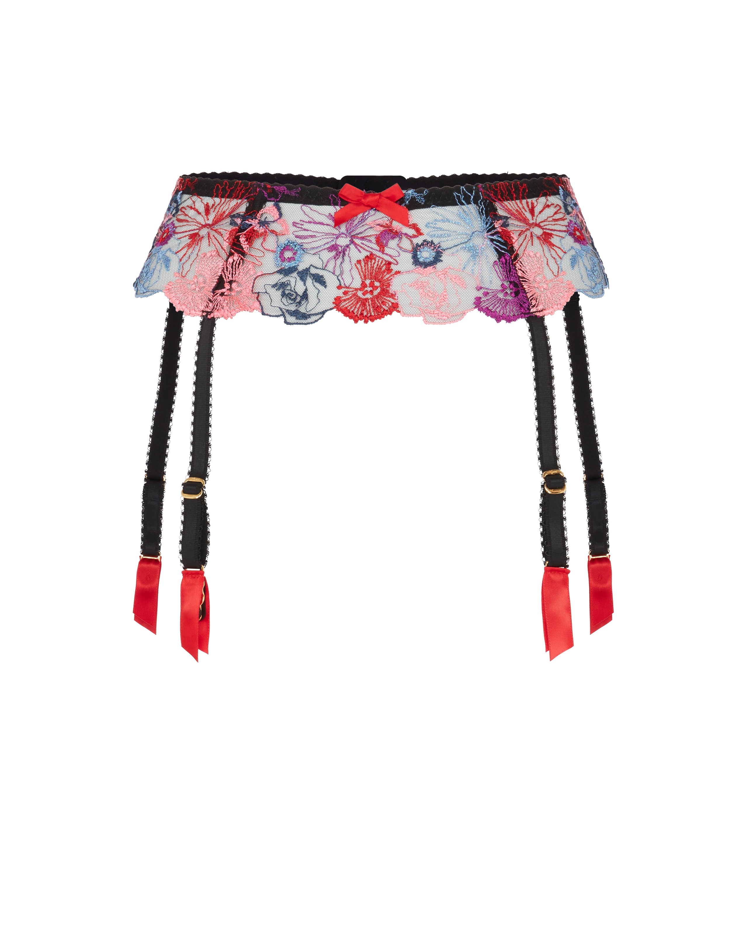 Пояс для чулок Zuri из полупрозрачного тюля с регулируемыми лямками украшен цветочной вышивкой. Изящный атласный бант добавляет финальный штрих. Завершите образ, сочетая с полным комплектом Zuri.