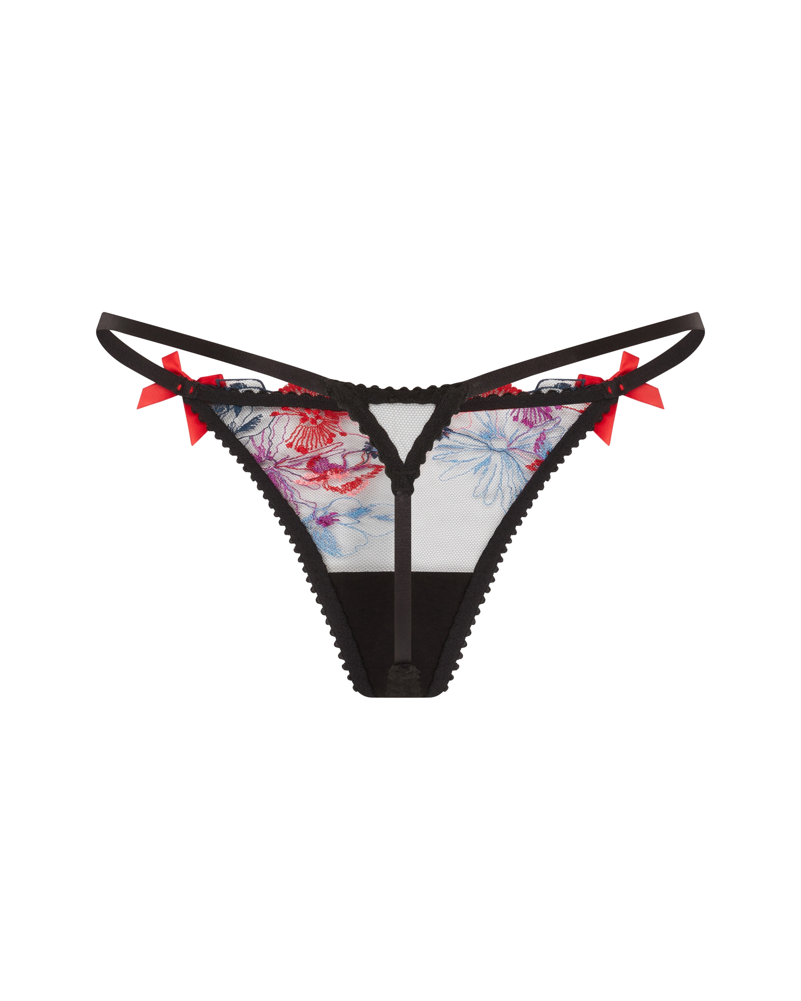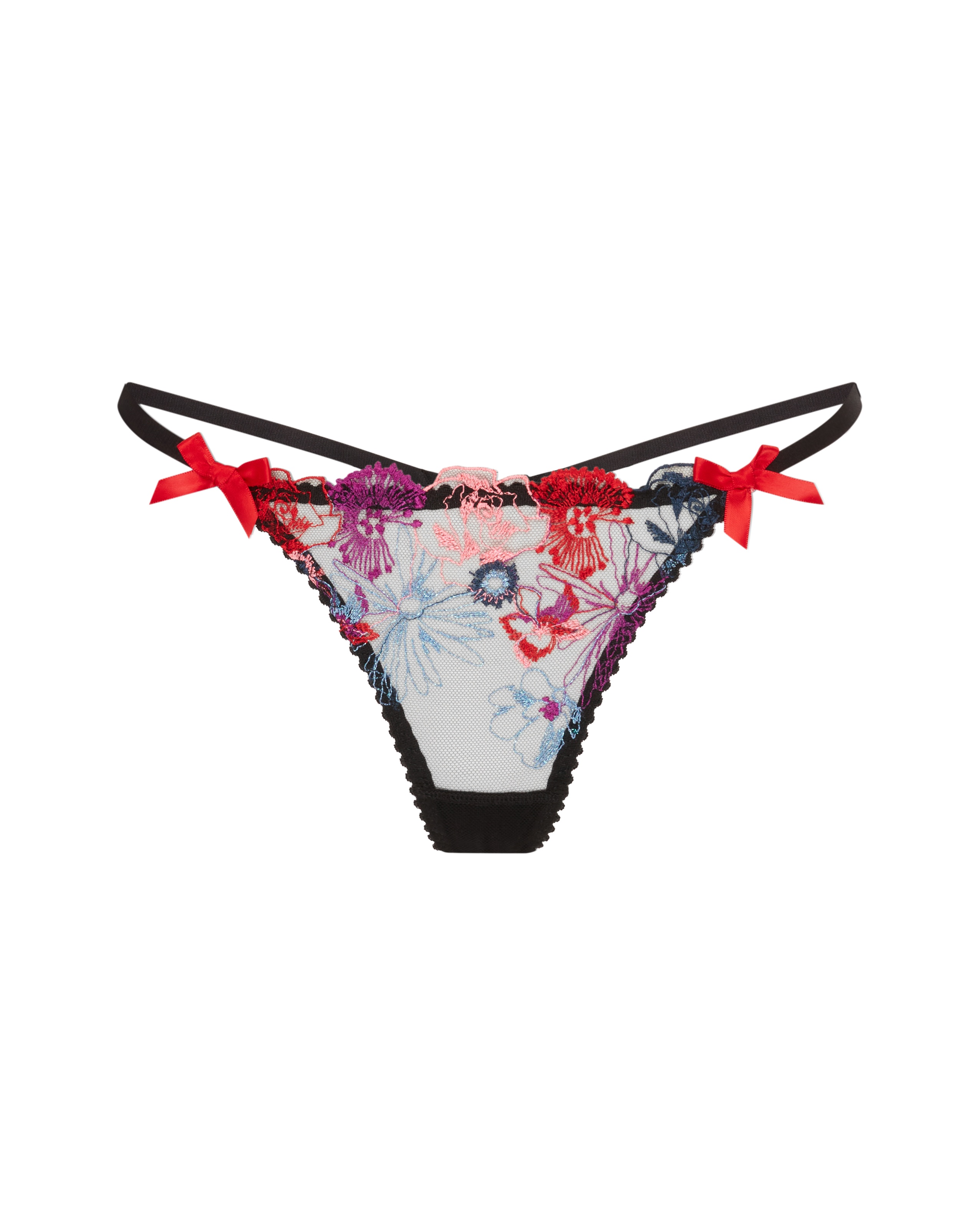 Трусы стринги Zuri из легкого как перышко черного тюля с французской цветочной вышивкой спереди. Атласные банты на поясе завершают дизайн. Идеальный выбор для создания женственного и гламурного образа с коллекцией Zuri.