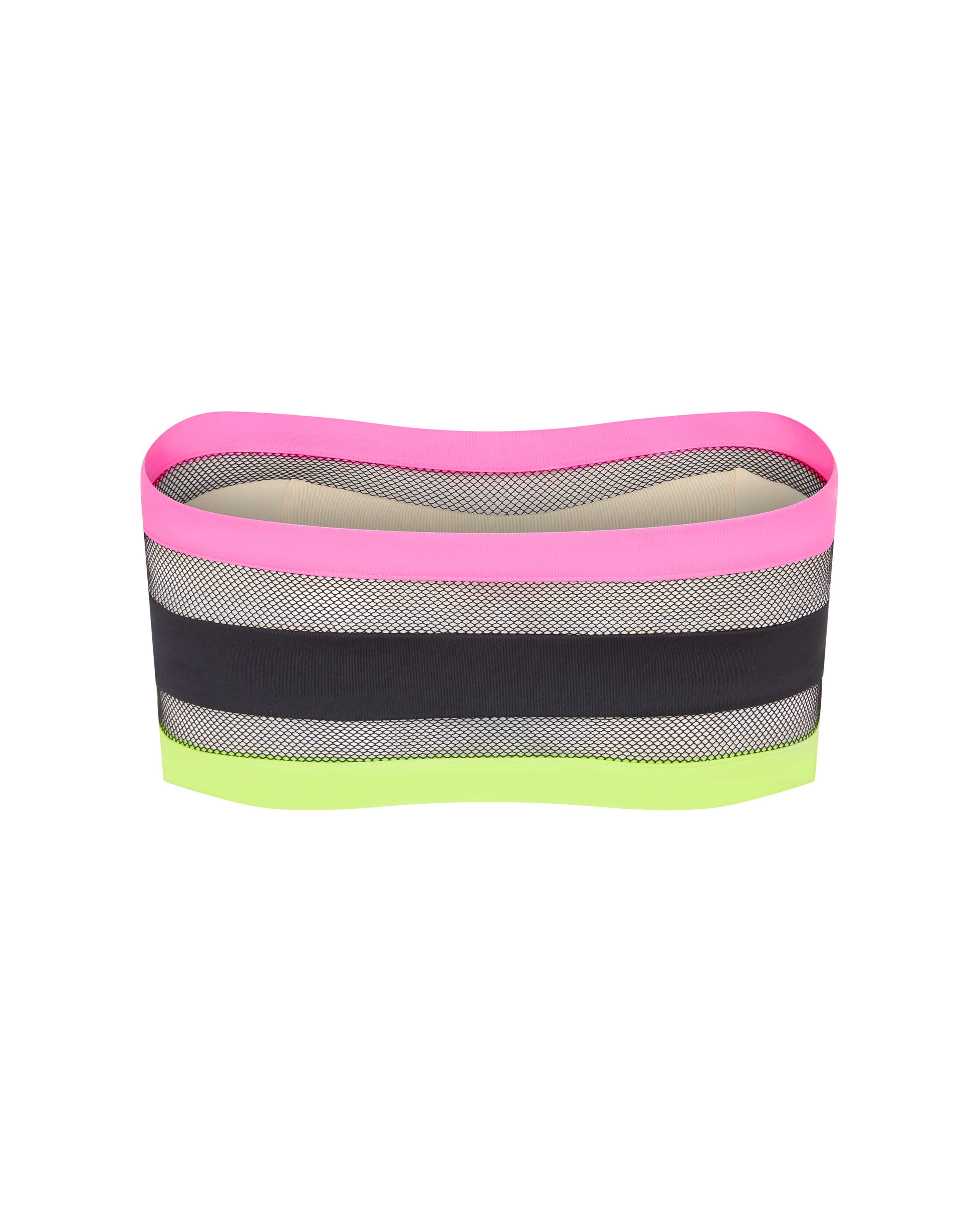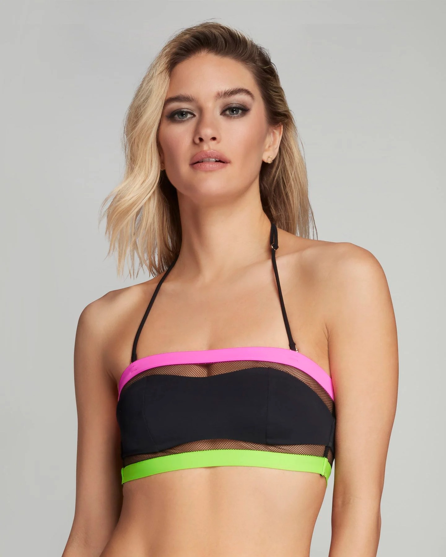 Топ-бандо купальника Zenaya сделан из специального итальянского эластичного материала для плавания. Черная основа отделана розовой полосой сверху и зеленой – снизу, а также сетчатыми прозрачными вставками. Мягкие формованные чашки обеспечивают необходимую поддержку груди. Модель можно дополнить длинной съемной бретелью.