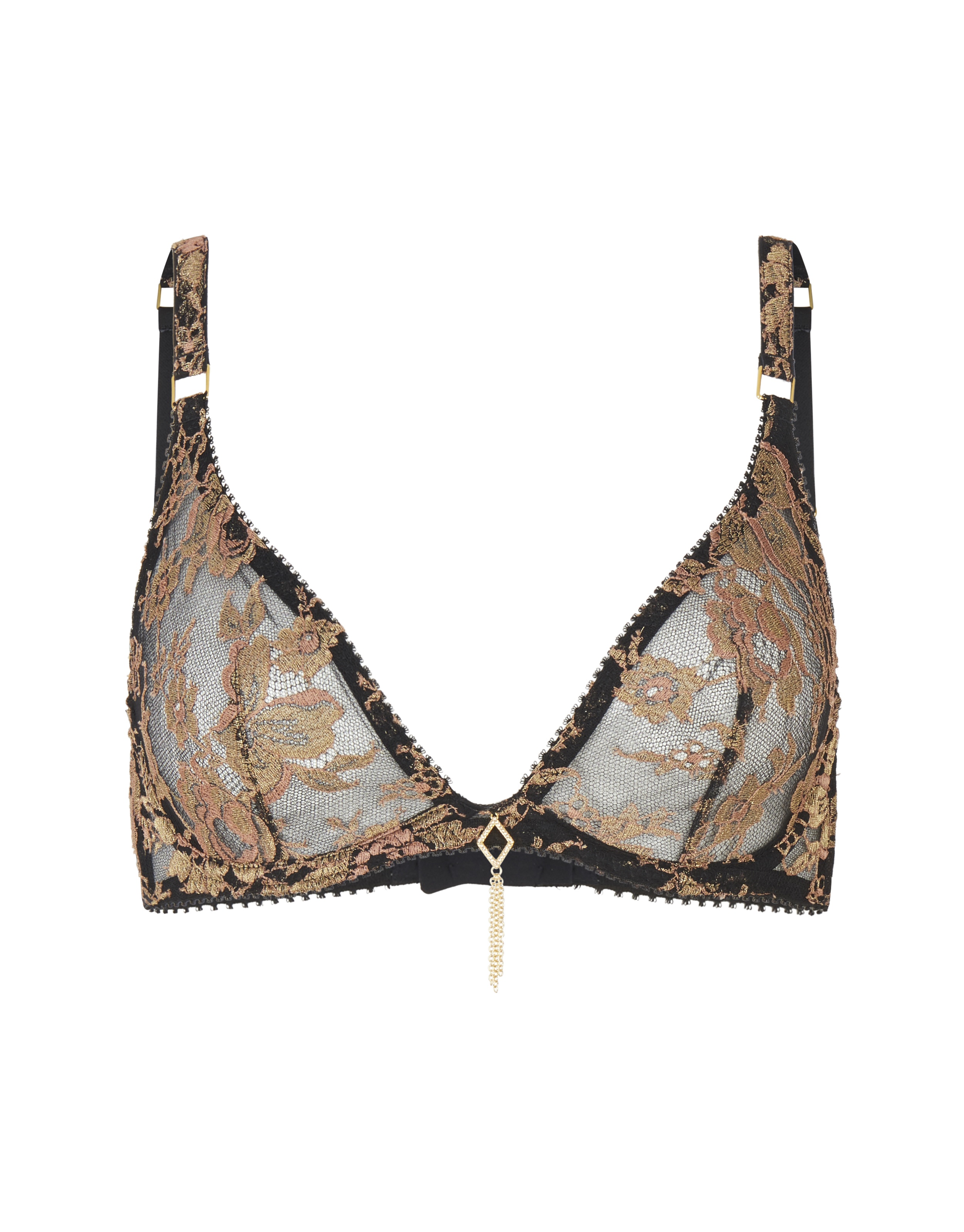Мягкий бюстгальтер Constantia выполнен из нескольких видов сетки, что создает многослойный эффект. Верхняя панель покрыта резным кружевом, вышитым золотистыми нитями. Углубленный вырез в стиле планж обрамлен эластичными лентами и увенчан в центре металлической подвеской. Изысканные ноты восточной экзотики заиграют еще ярче с трусиками из этой линии.