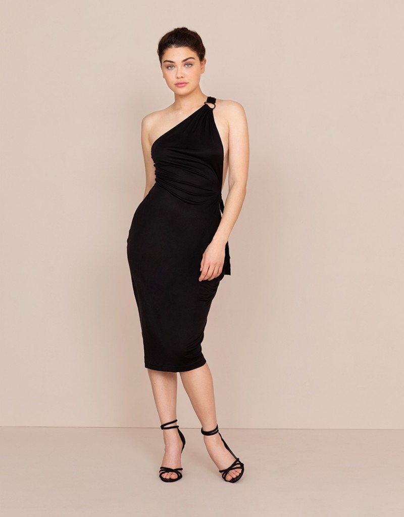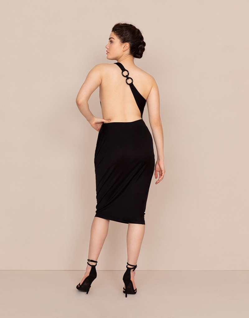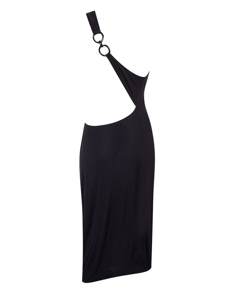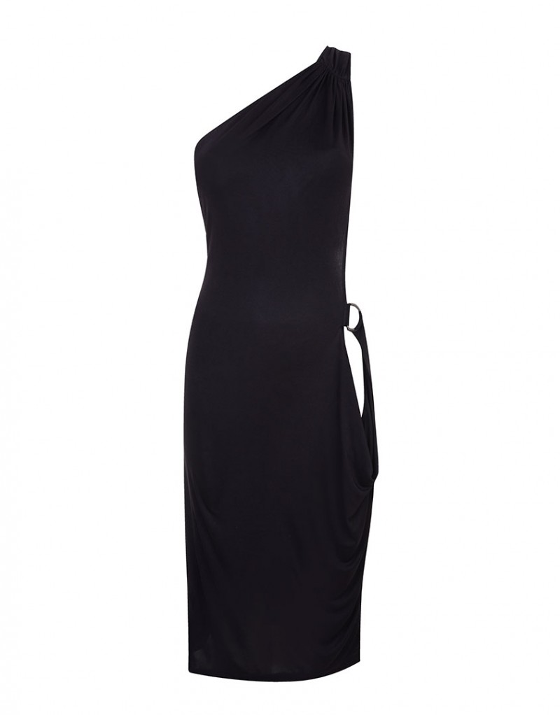 Платье с асимметричным дизайном на одно плечо и расслабленным силуэтом наводит на мысли о греческих богинях. Шелковое платье универсального черного цвета с драпировкой декорировано эксклюзивной пластиковой фурнитурой, добавляющей провокационности образу. Модель подойдет для вечернего выхода или расслабленной прогулки вдоль пляжа. - D-образное кольцо и рельефный эластичный пояс - Асимметричная бретель Материалы и уход: Основной материал: 100% шелк. Рекомендована ручная стирка. Бережная сушка