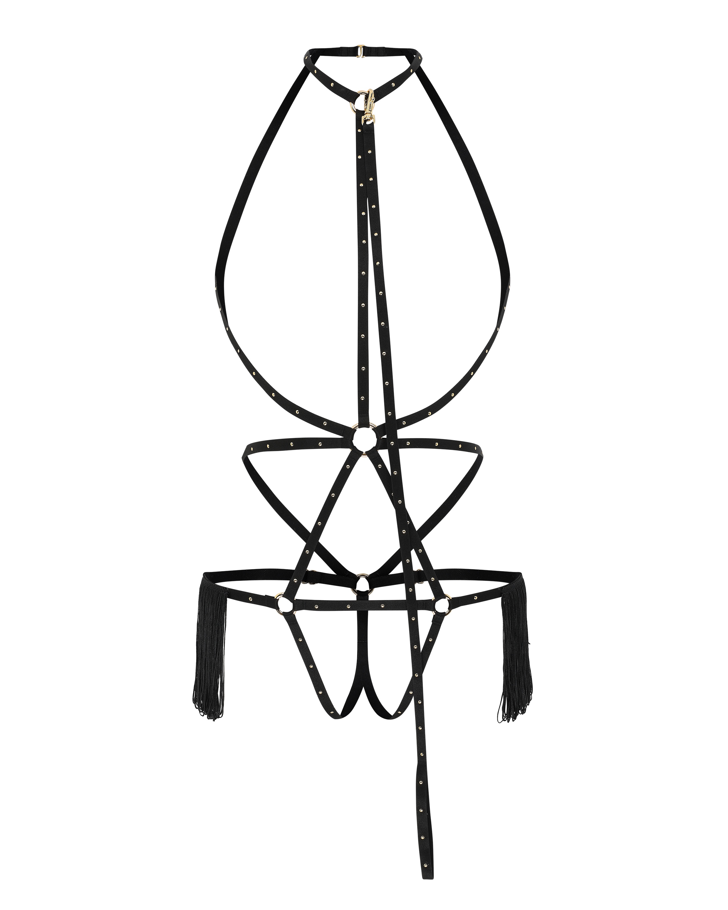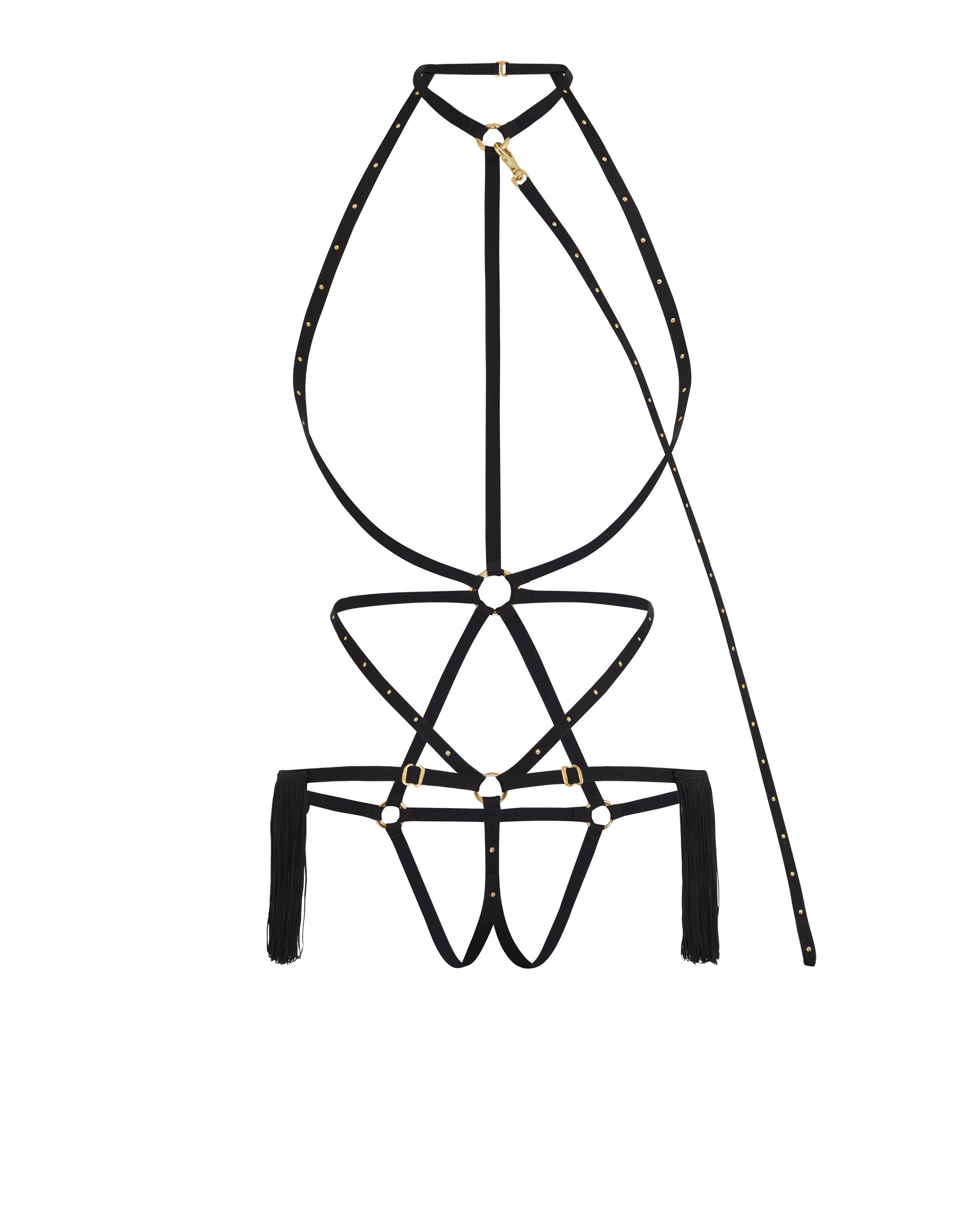 Черное боди Astoriah с эластичными ремнями, украшенными золотыми деталями, и бахромой у бедер идеально облегает тело. Съёмный поводок и минималистичный дизайн стрингов завершат смелый образ в сочетании с подвязкой из этой коллекции.
