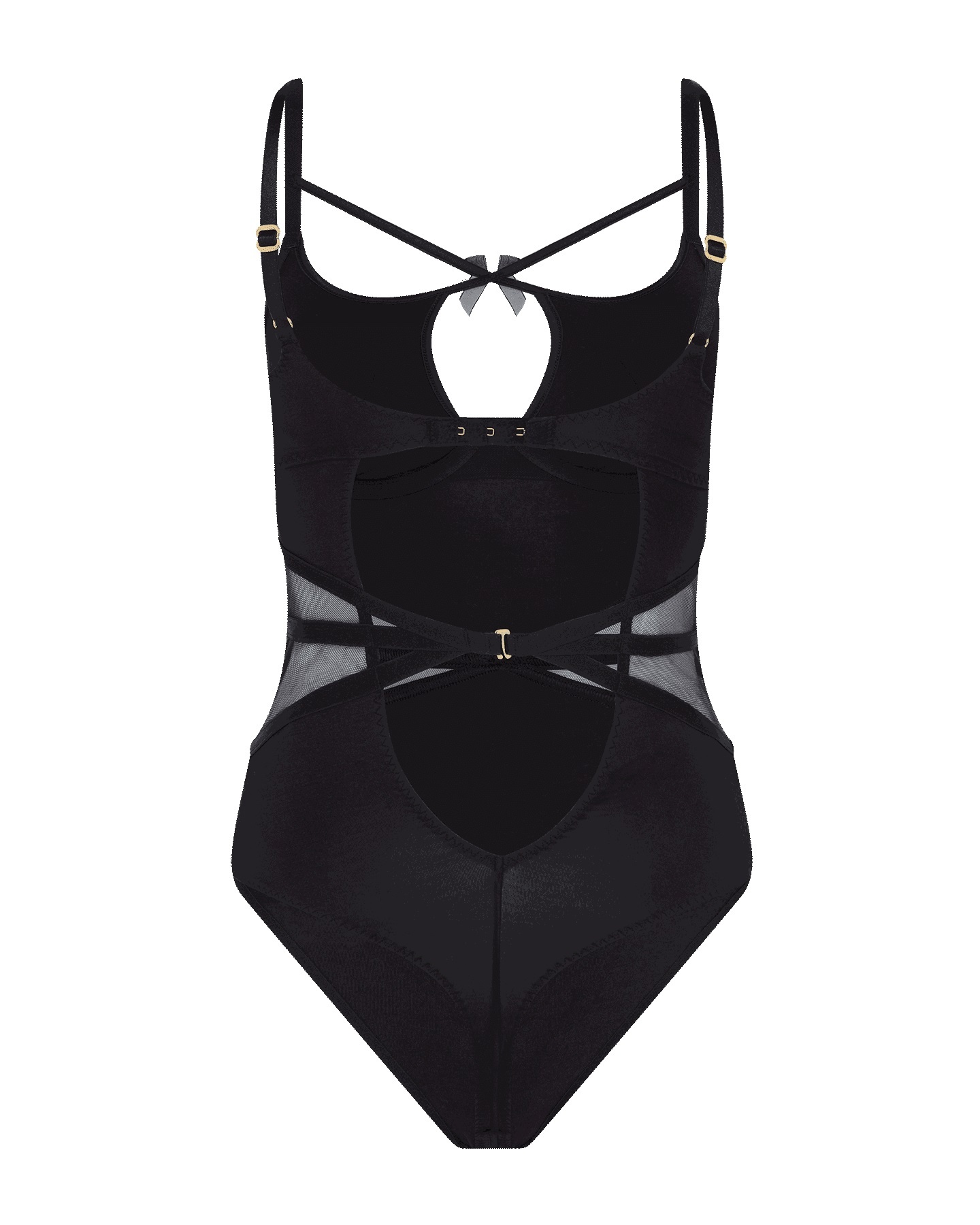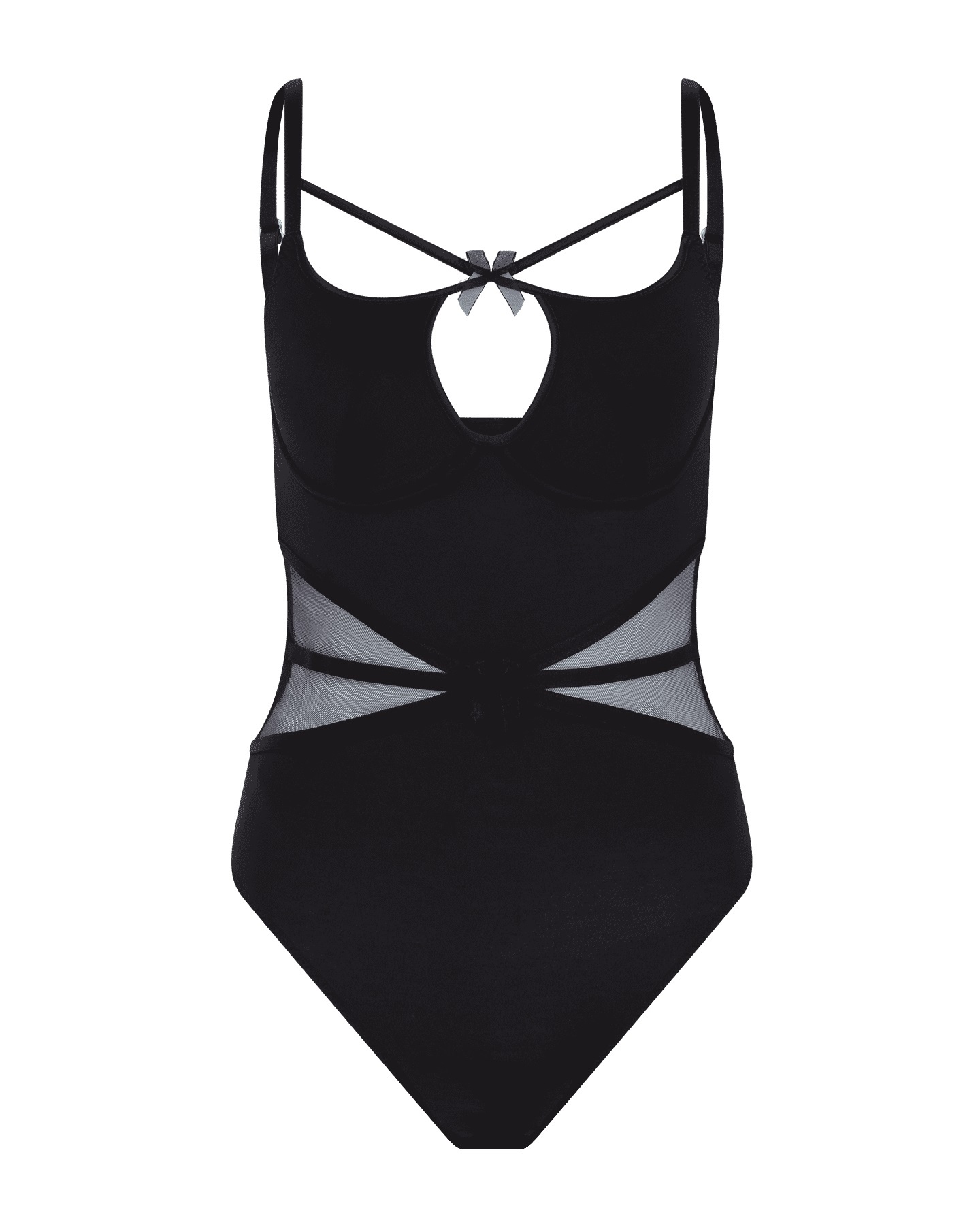 В коллекции Buffie представлено боди из мягкого эластичного трикотажа с полупрозрачным тюлем и регулируемыми бретелями, покрытыми сатином. Задняя часть в стиле стринг дополняет образ.