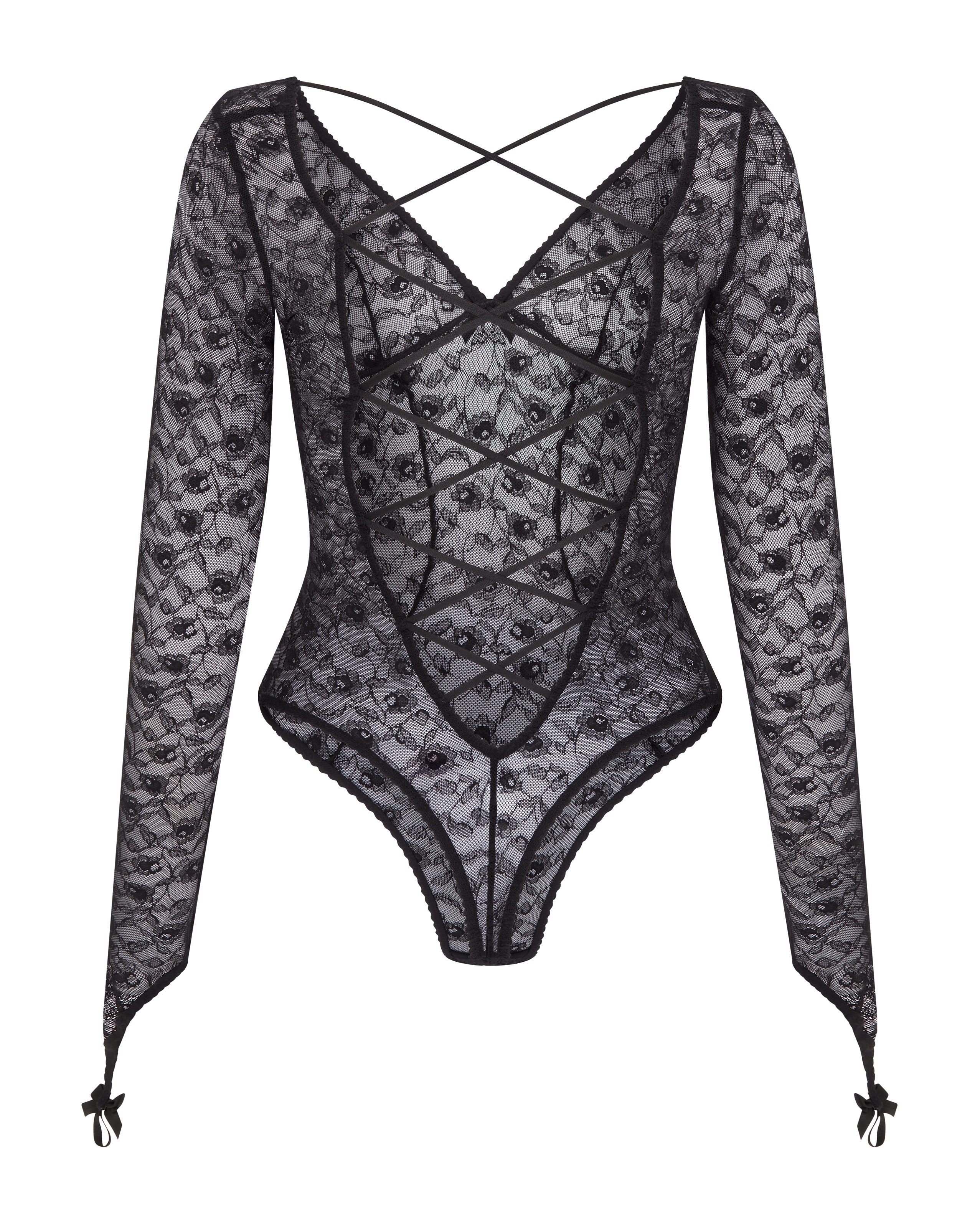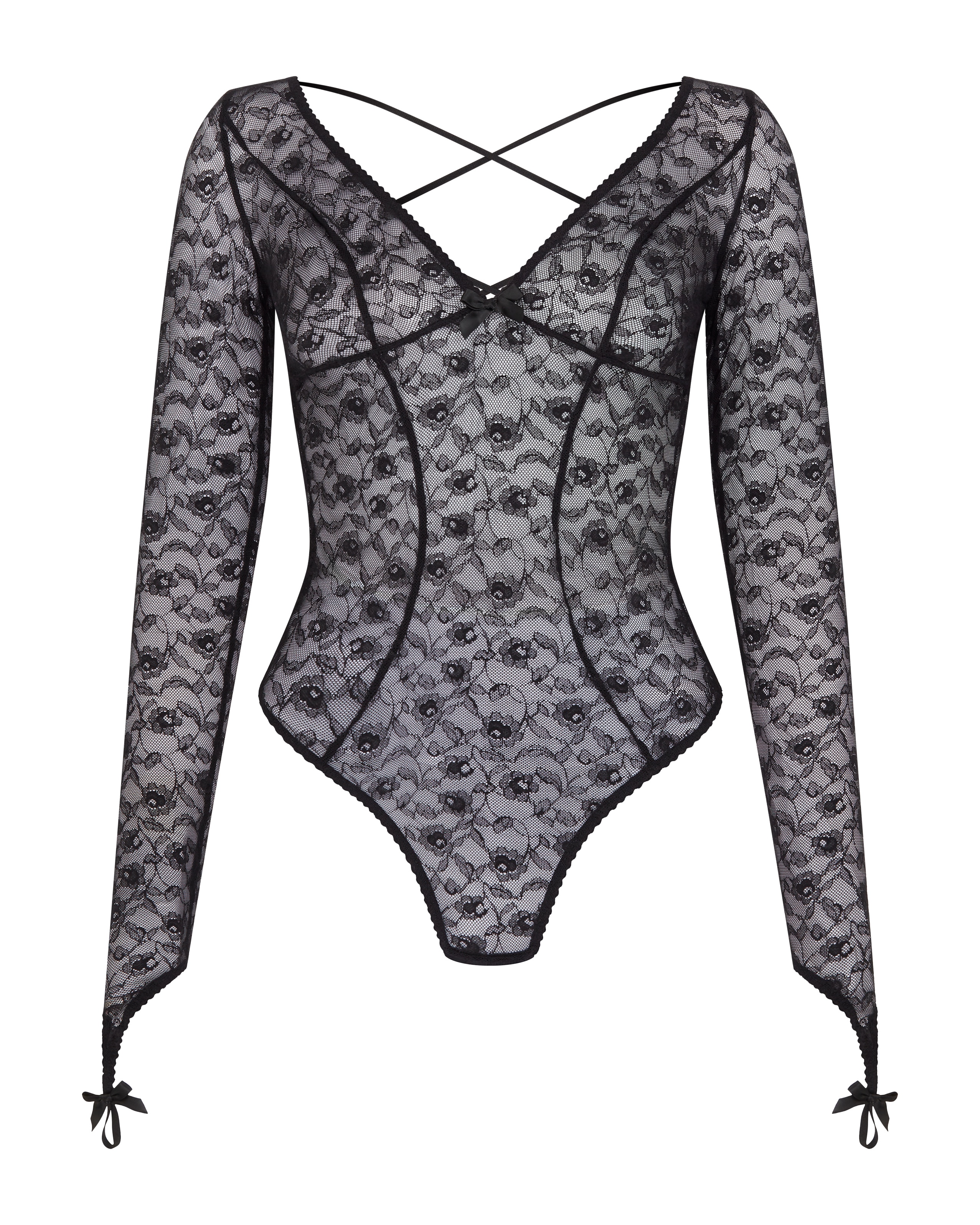Боди Daylia с длинными рукавами выполнено из цветочного кружева и дополнено петлями для пальцев с аккуратными атласными бантиками. Спинка оформлена перекрещенными лентами.